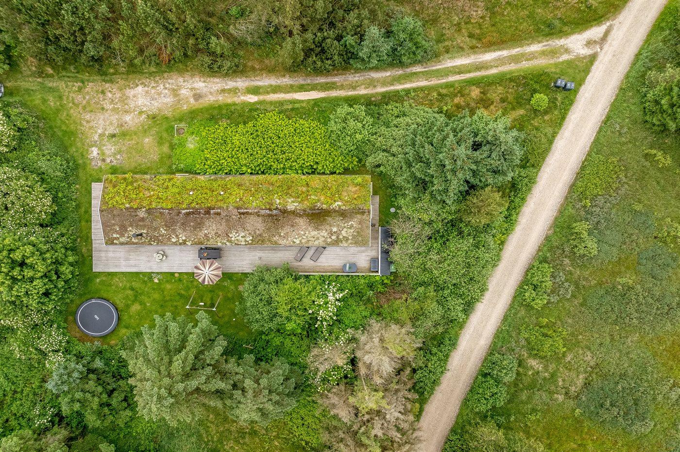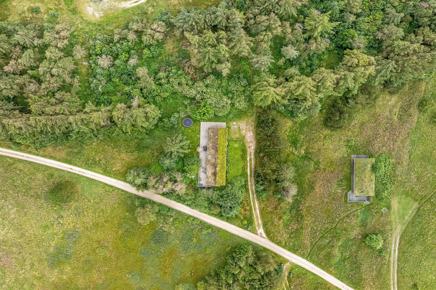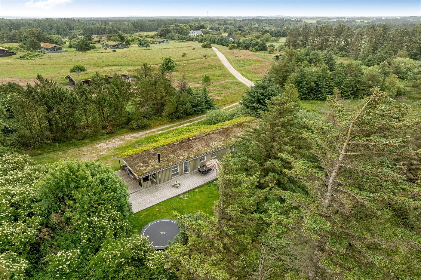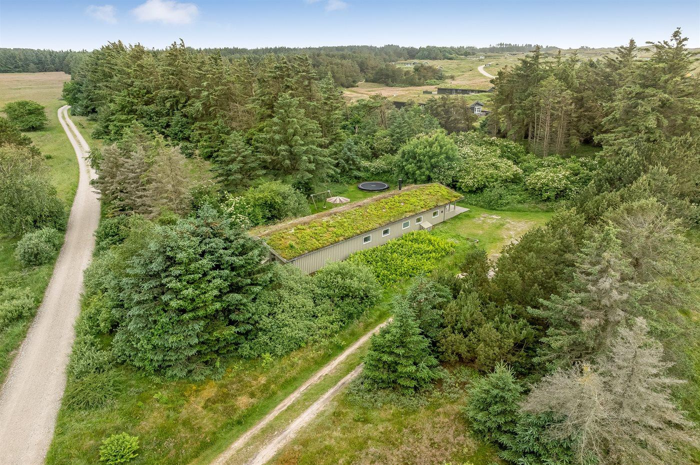 Ferieboligen er beliggende på en 1250 m² stor naturgrund. Der er 1200 m til havet. Nærmeste forretning er beliggende i en afstand af 2500 m. Til ferieboligen hører åbent terrasseareal. Desuden er der overdækket terrasse. Gynge. Grill til rådighed. Der er installeret stik til opladning af elbil. Parkering ved ferieboligen.