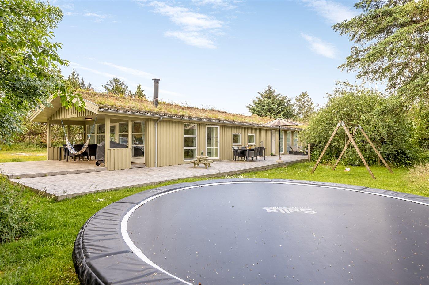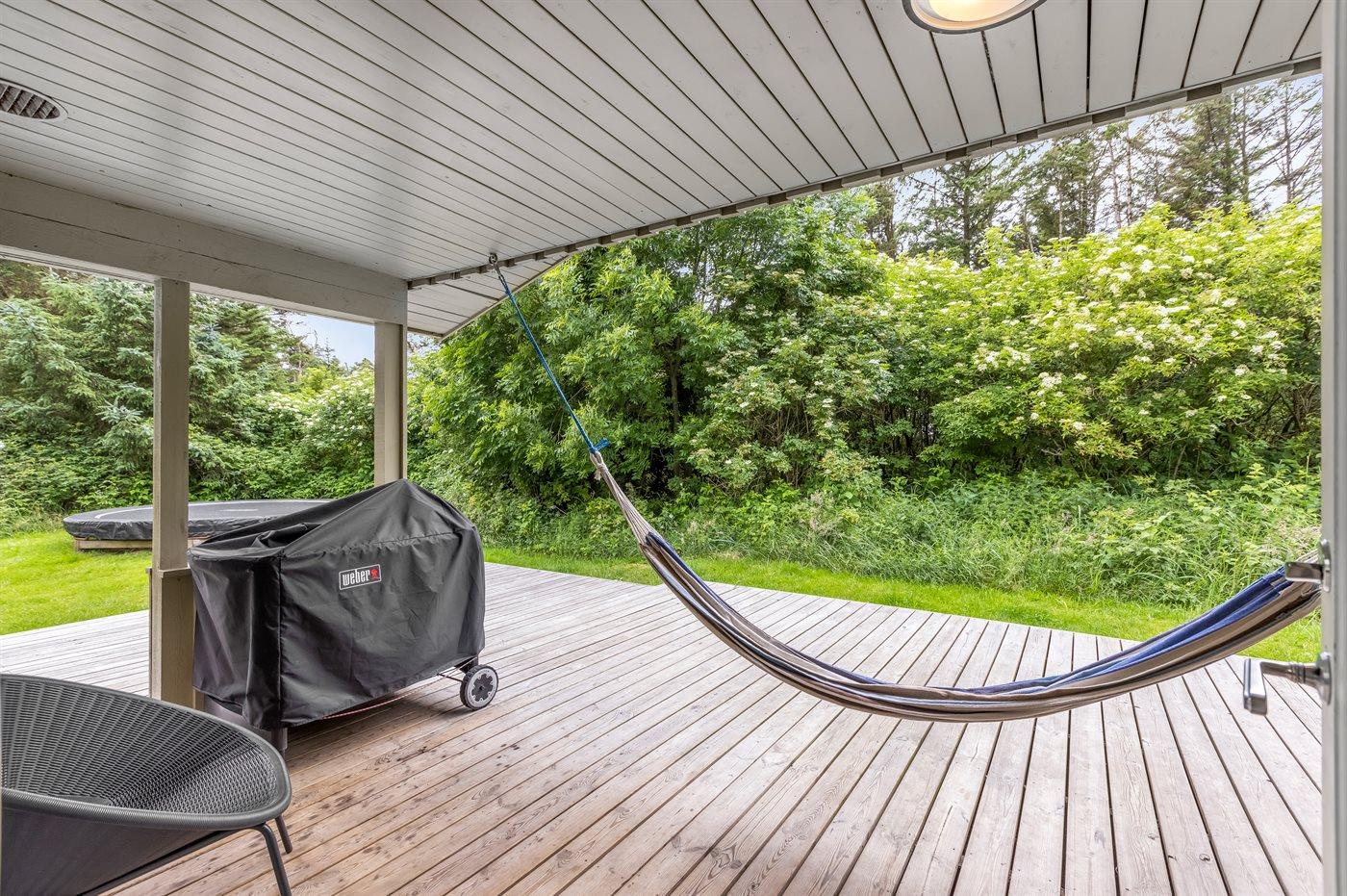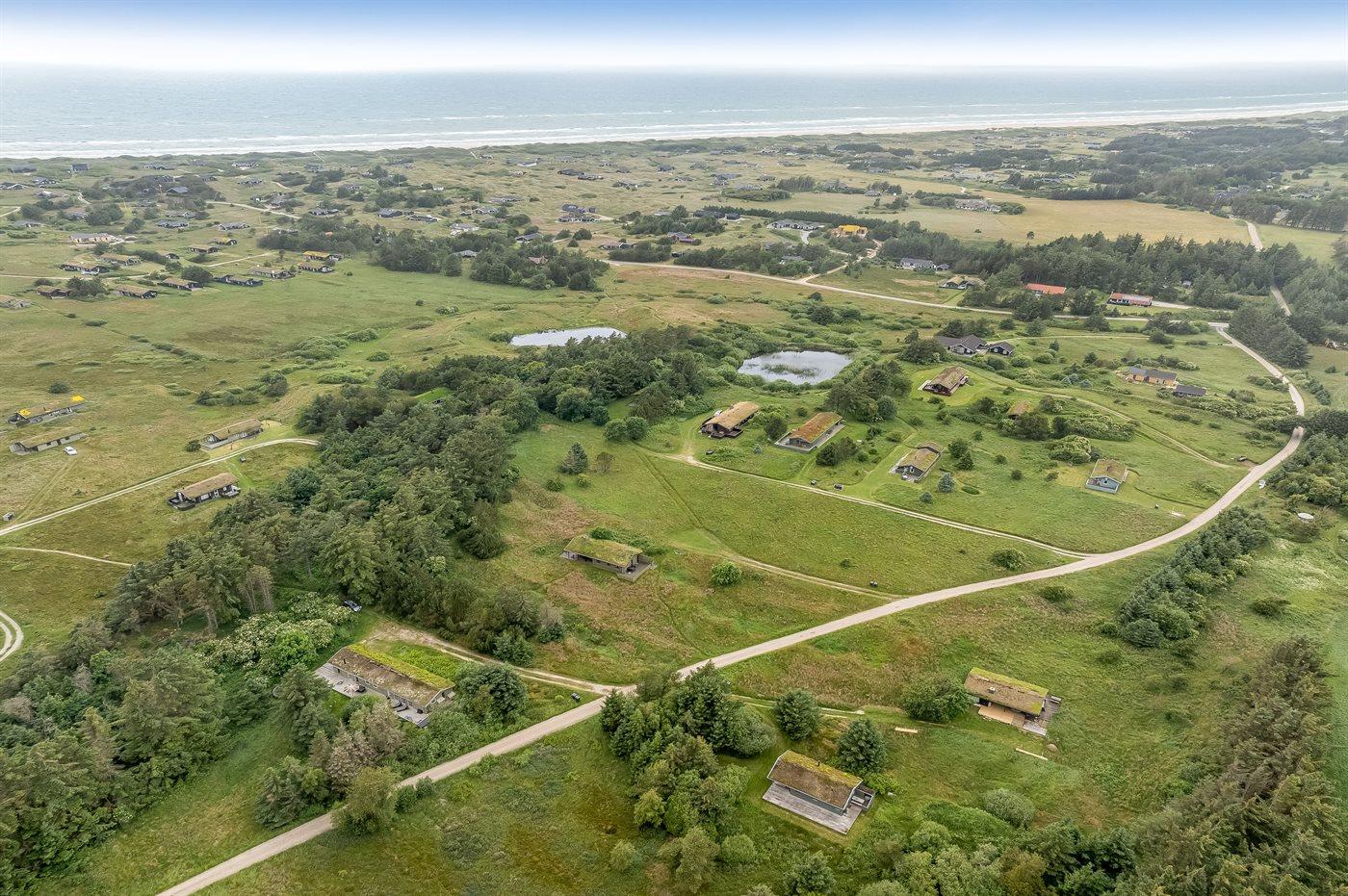 Ferieboligen er beliggende på en 1250 m² stor naturgrund. Der er 1200 m til havet. Nærmeste forretning er beliggende i en afstand af 2500 m. Til ferieboligen hører åbent terrasseareal. Desuden er der overdækket terrasse. Gynge. Grill til rådighed. Der er installeret stik til opladning af elbil. Parkering ved ferieboligen.