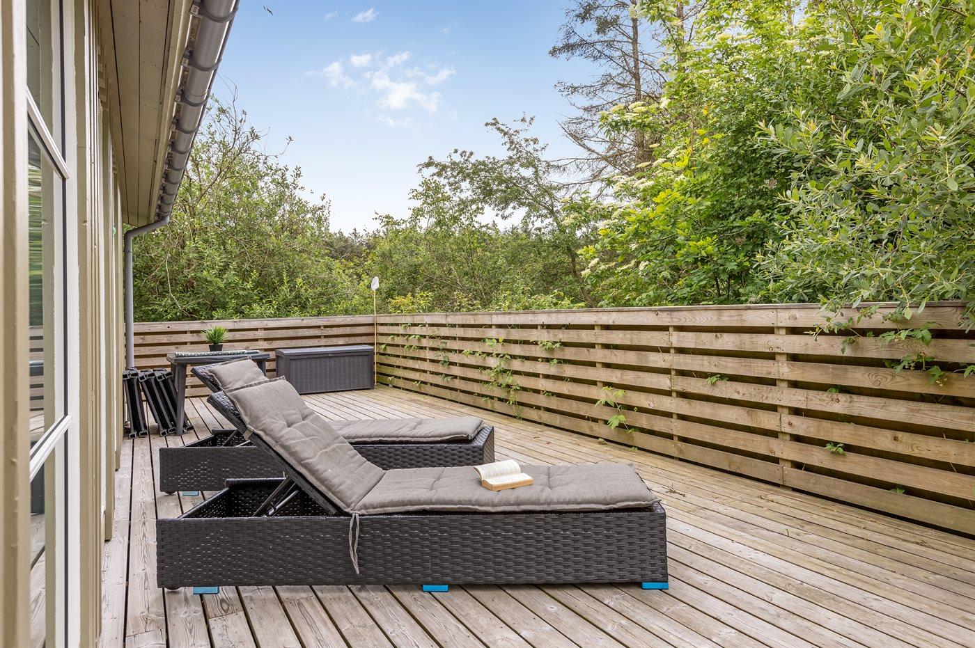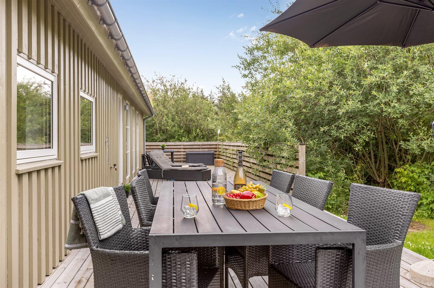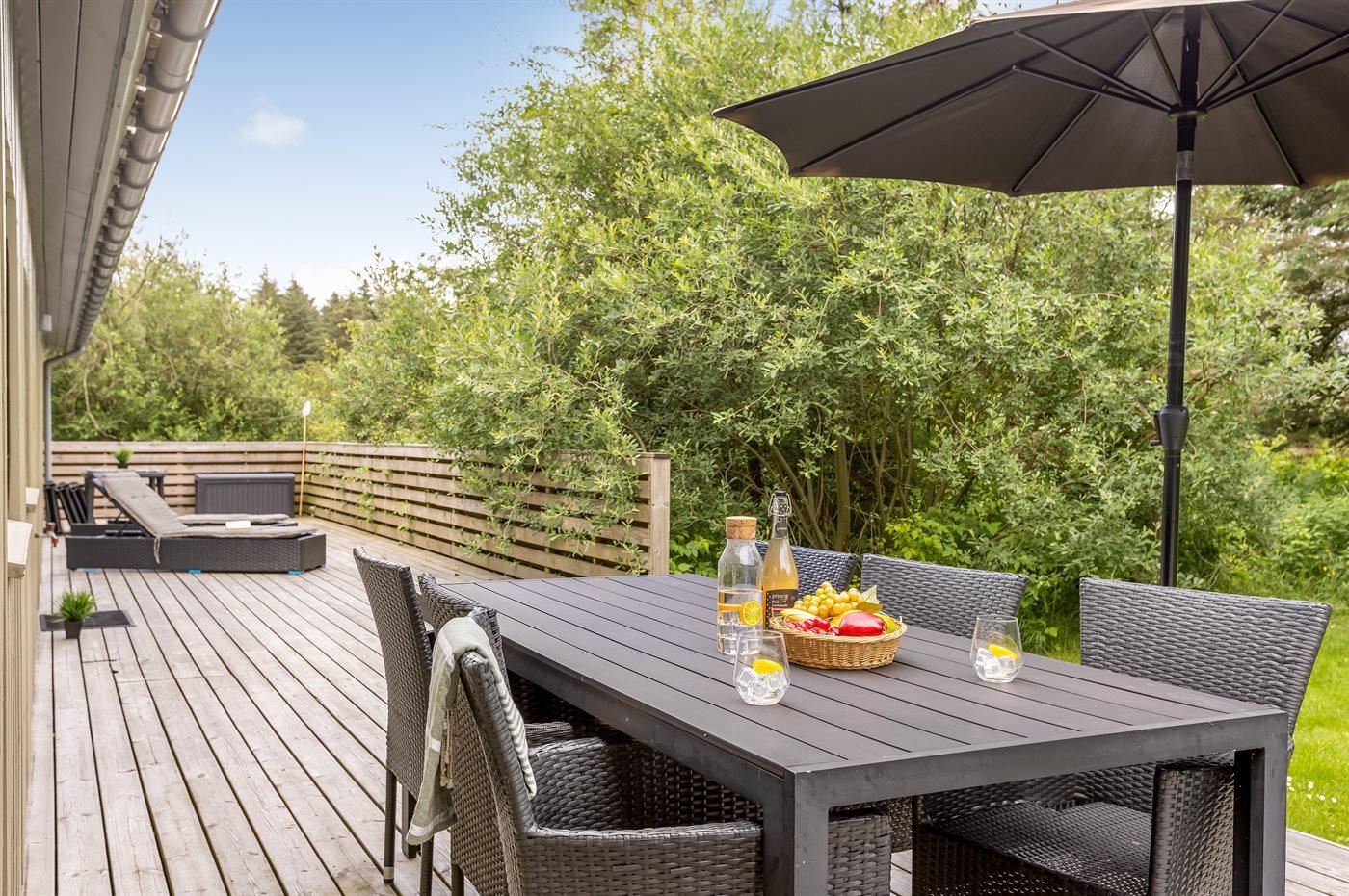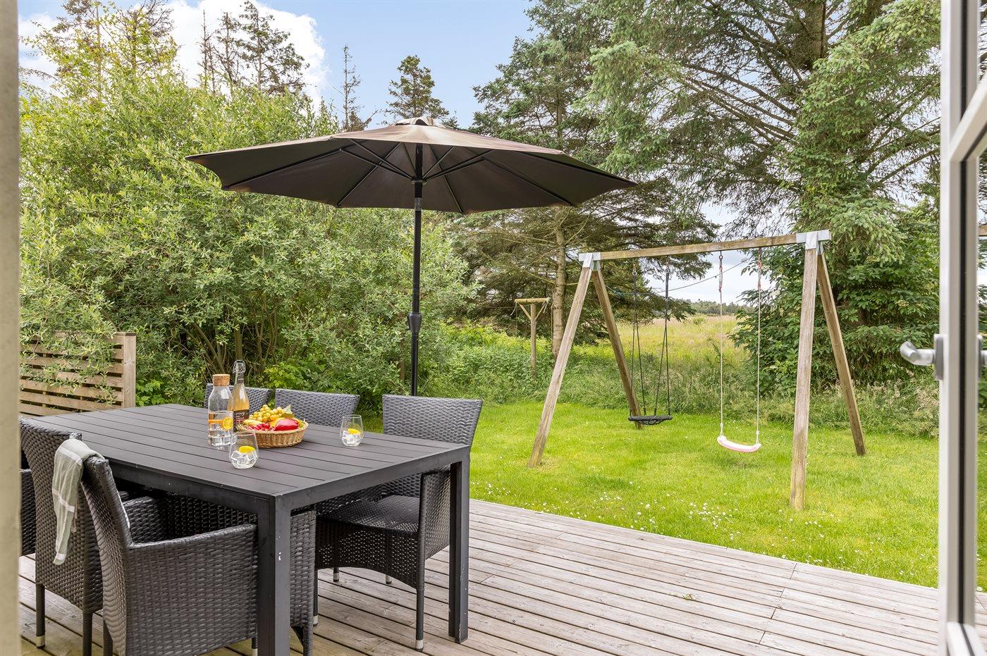 Ferieboligen er beliggende på en 1250 m² stor naturgrund. Der er 1200 m til havet. Nærmeste forretning er beliggende i en afstand af 2500 m. Til ferieboligen hører åbent terrasseareal. Desuden er der overdækket terrasse. Gynge. Grill til rådighed. Der er installeret stik til opladning af elbil. Parkering ved ferieboligen.