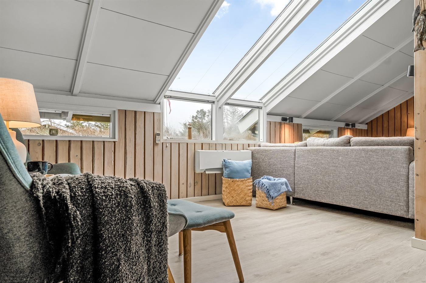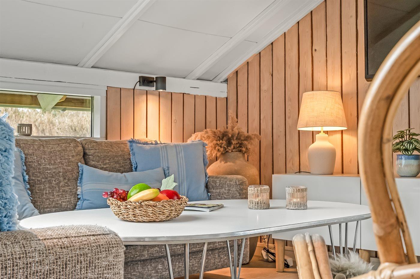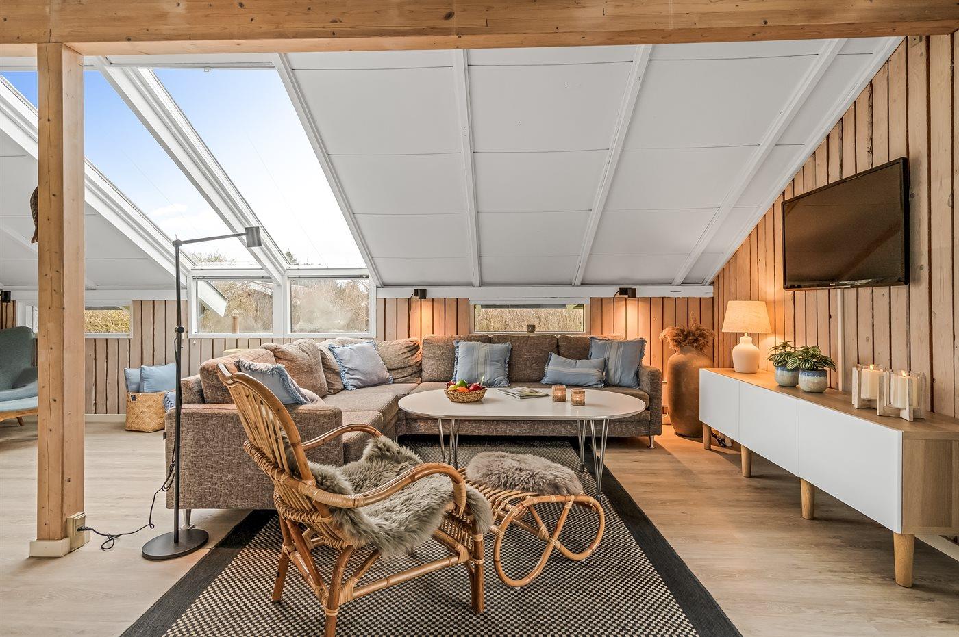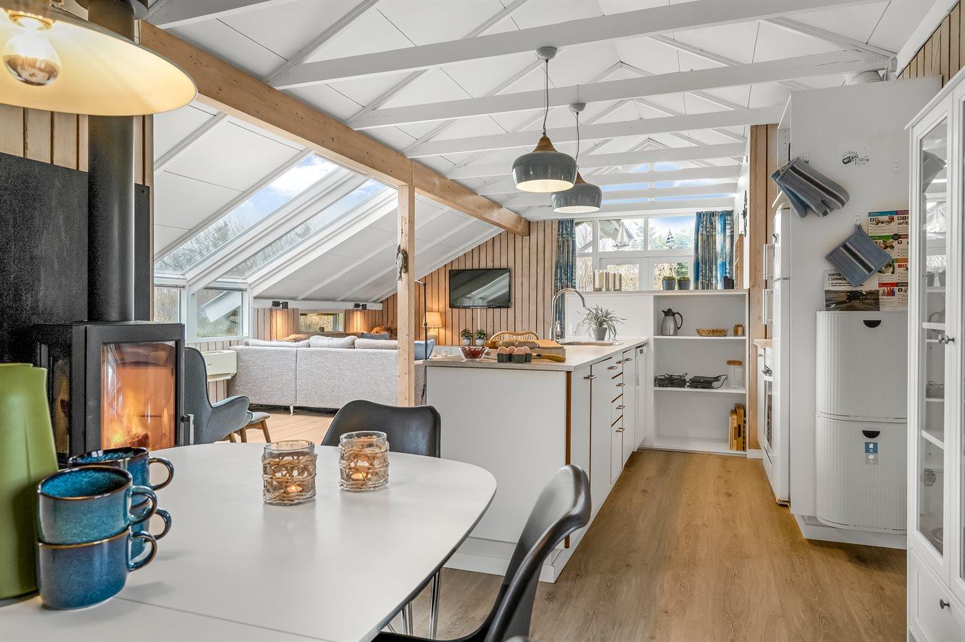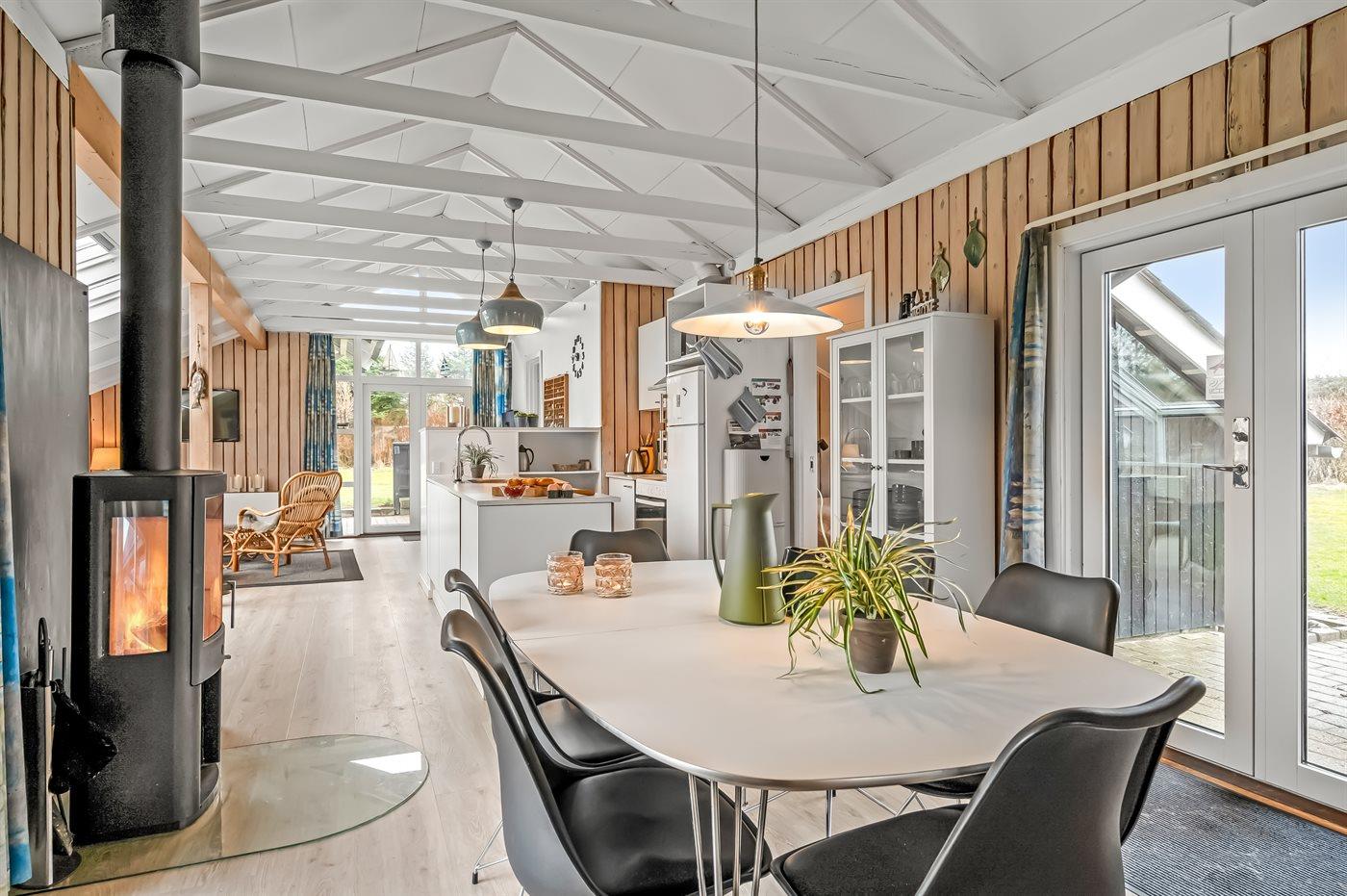 Sommerhusets store vinduespartier giver et dejligt lysindfald. Køkken og stue danner sammen et stort opholdsrum til hygge og skønt samvær. I huset er brændeovn til de køligere aftner, og i det ene badeværelser finder du spa og sauna.