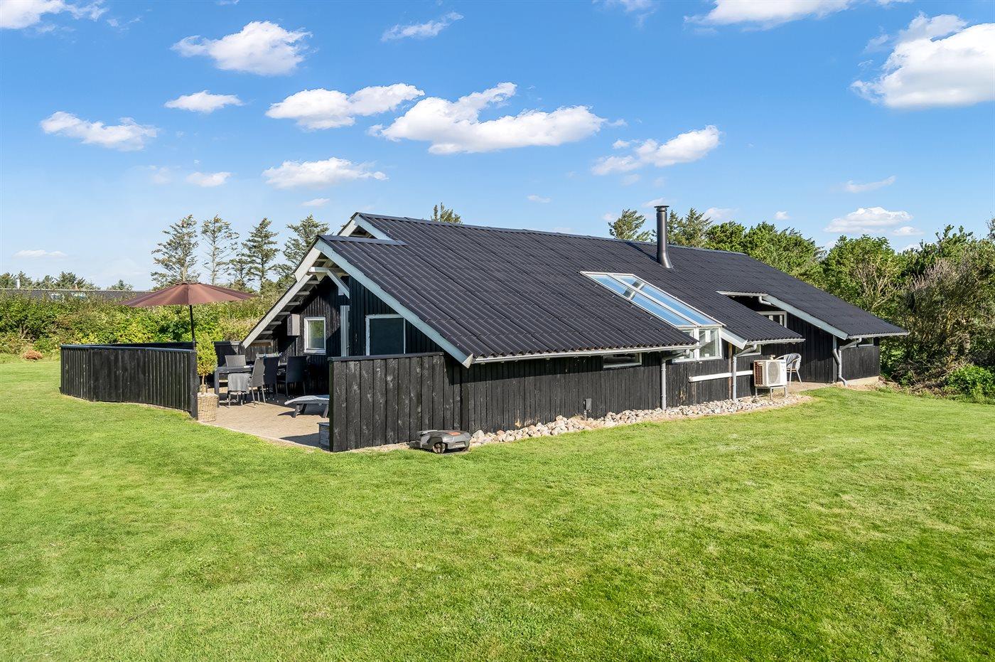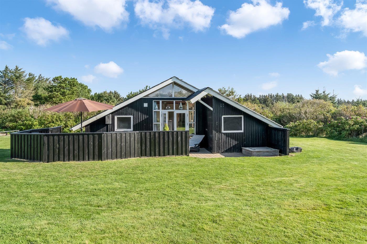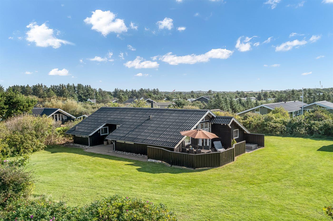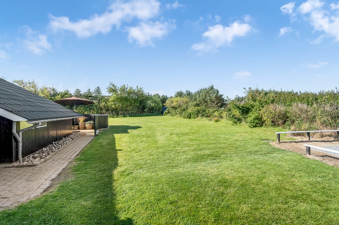 Udenfor sommerhuset er der god plads til leg og udeliv i solen på den store græsplæne og terrasserne rundt om huset. Får du lyst til en svømmetur eller en gåtur i solnedgangen, er der kort afstand til Vesterhavet.