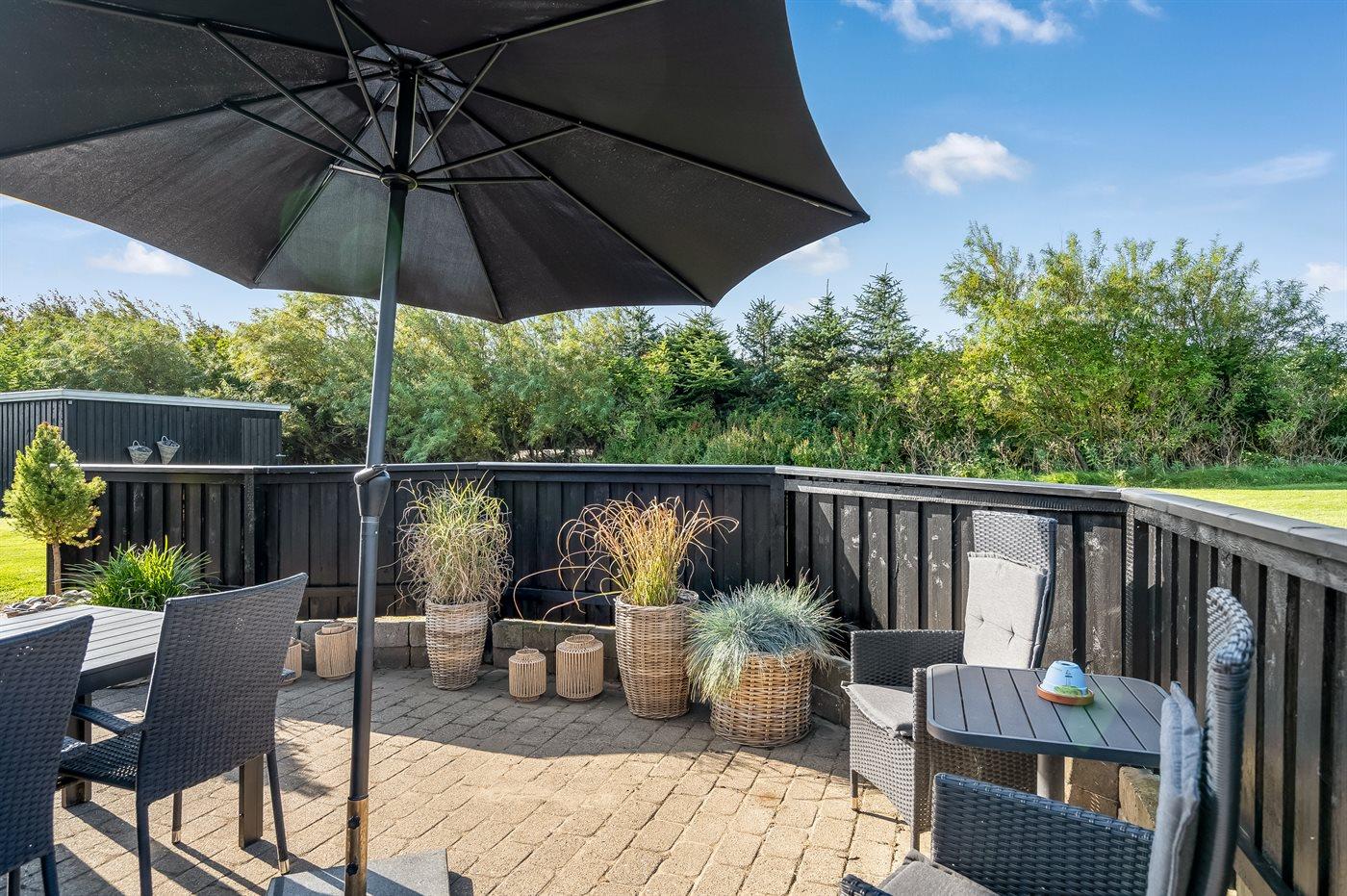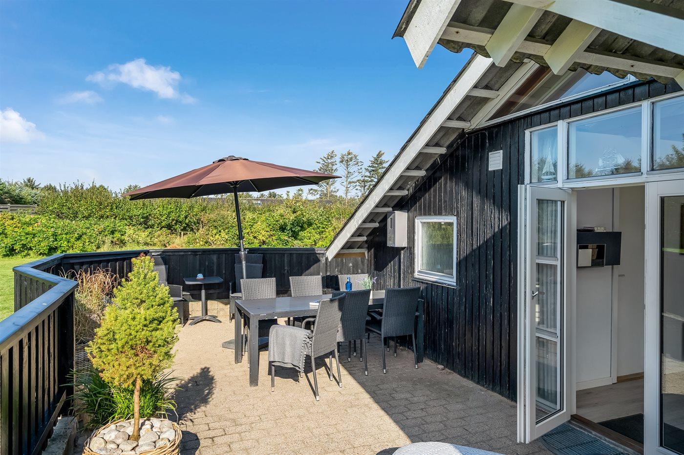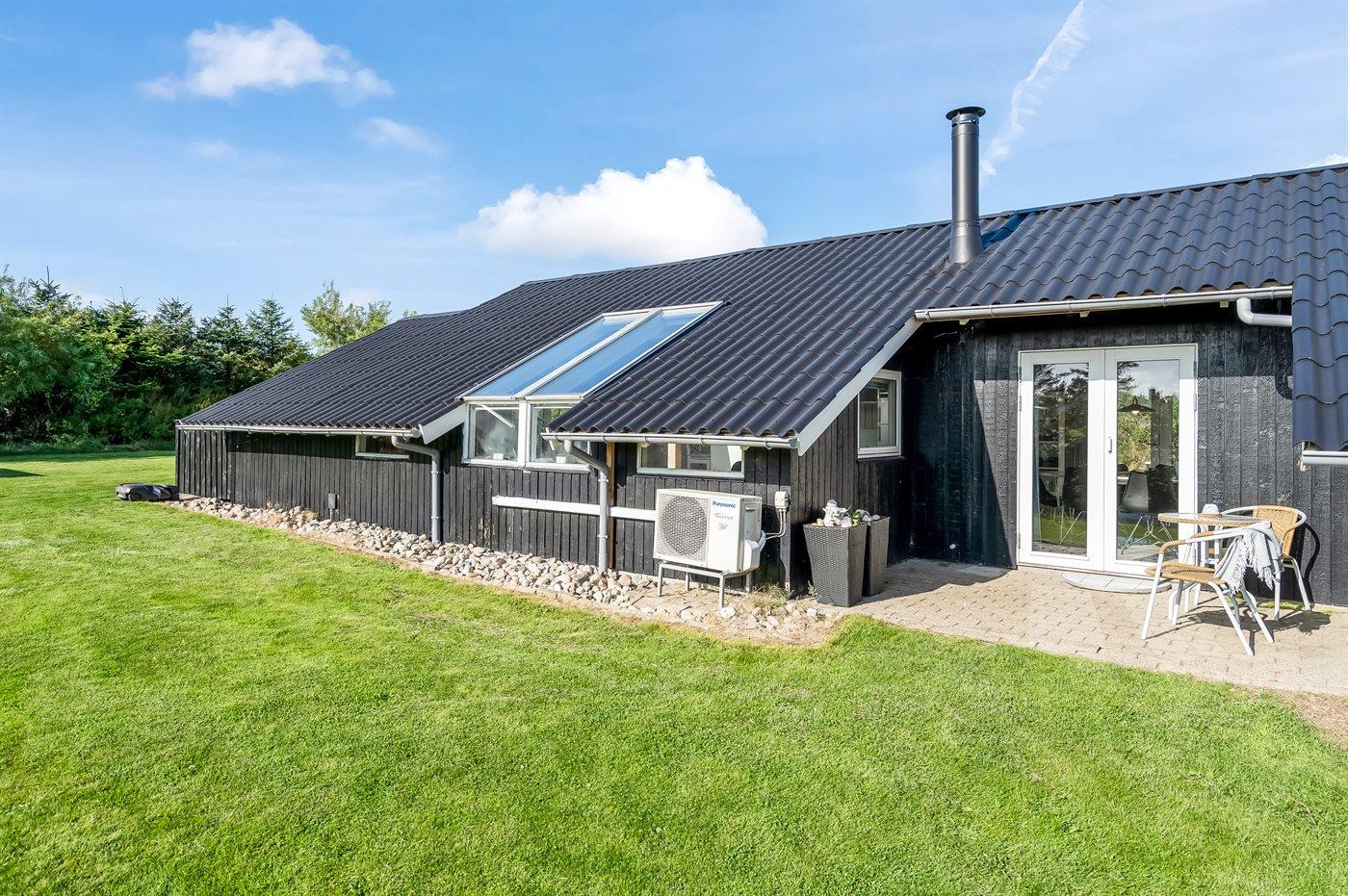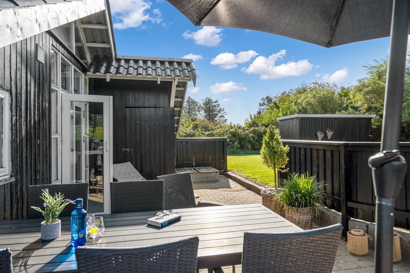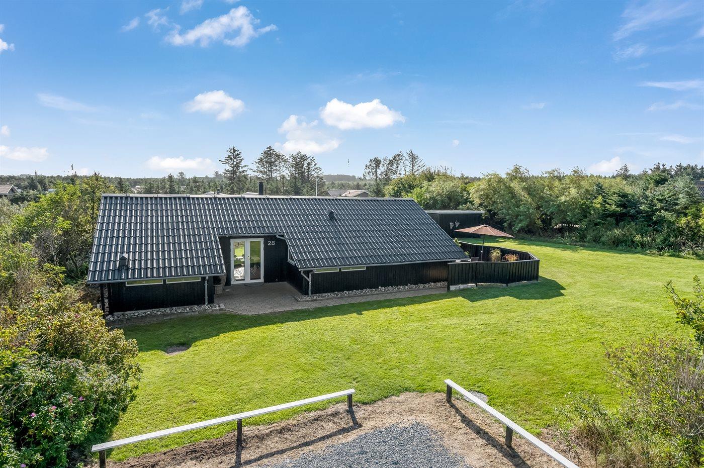 Udenfor sommerhuset er der god plads til leg og udeliv i solen på den store græsplæne og terrasserne rundt om huset. Får du lyst til en svømmetur eller en gåtur i solnedgangen, er der kort afstand til Vesterhavet.