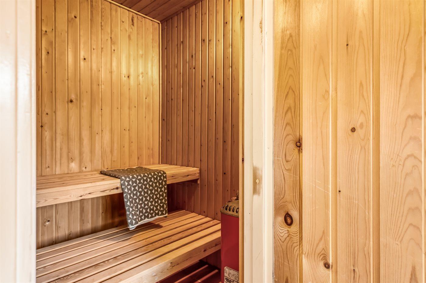 Der er 2 badeværelser med bruser og 1 toilet.. Der er gulvvarme på 2 badeværelser. I saunaen er der mulighed for afslapning.
