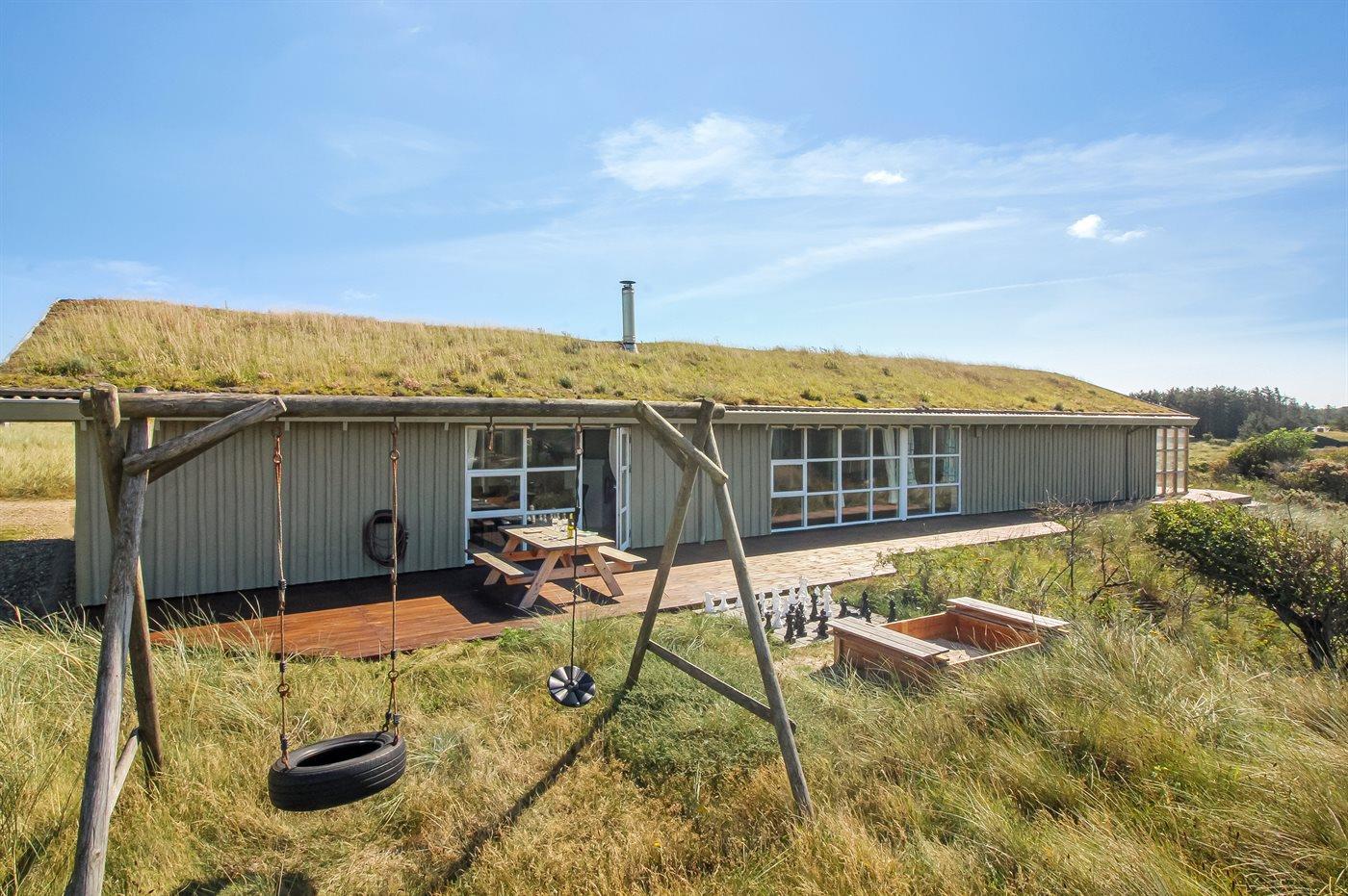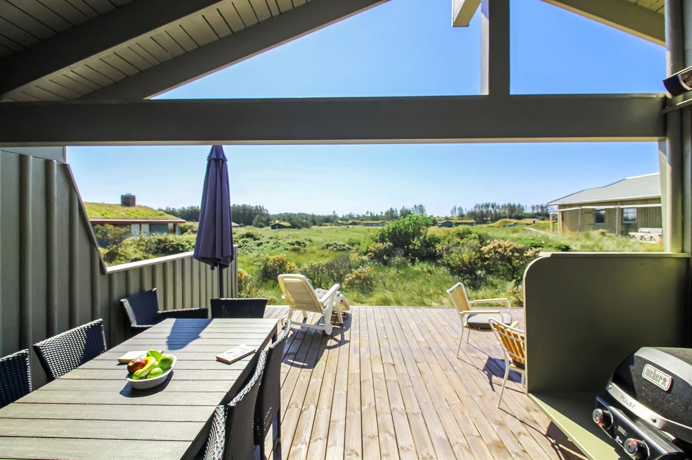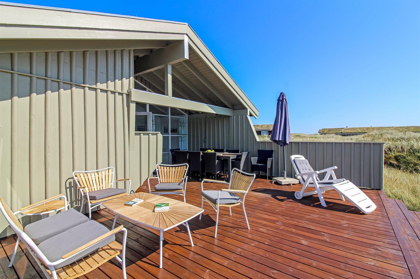 Er vejret til afslapning udenfor, i det skønne danske sommervejr, så er det bare at træde ud på den store træterrasse, som ligger som en forlængelse af huset. Her er du straks i ét med naturen og du kan nyde udsigten til det kuperede landskab, eller der er mulighed for tage et kapløb ned til Vesterhavet ad de mange stier og se hvem der vinder præmien for feriens første dukkert.