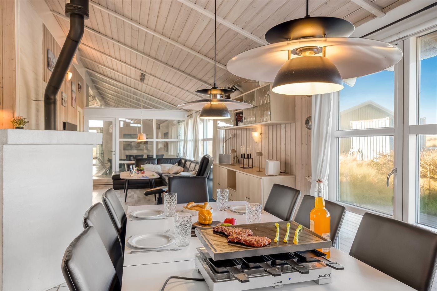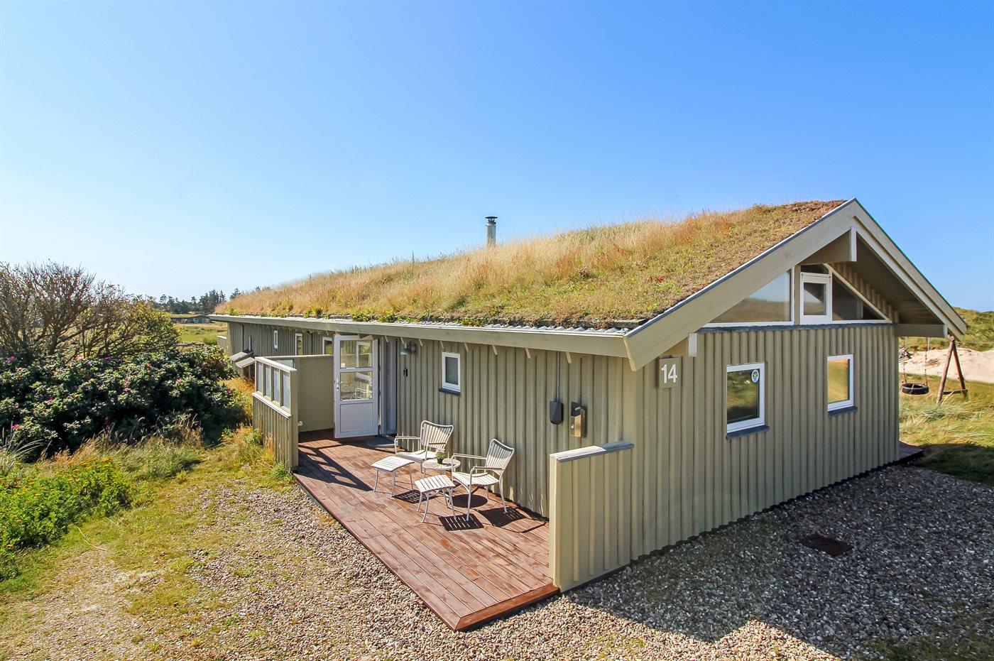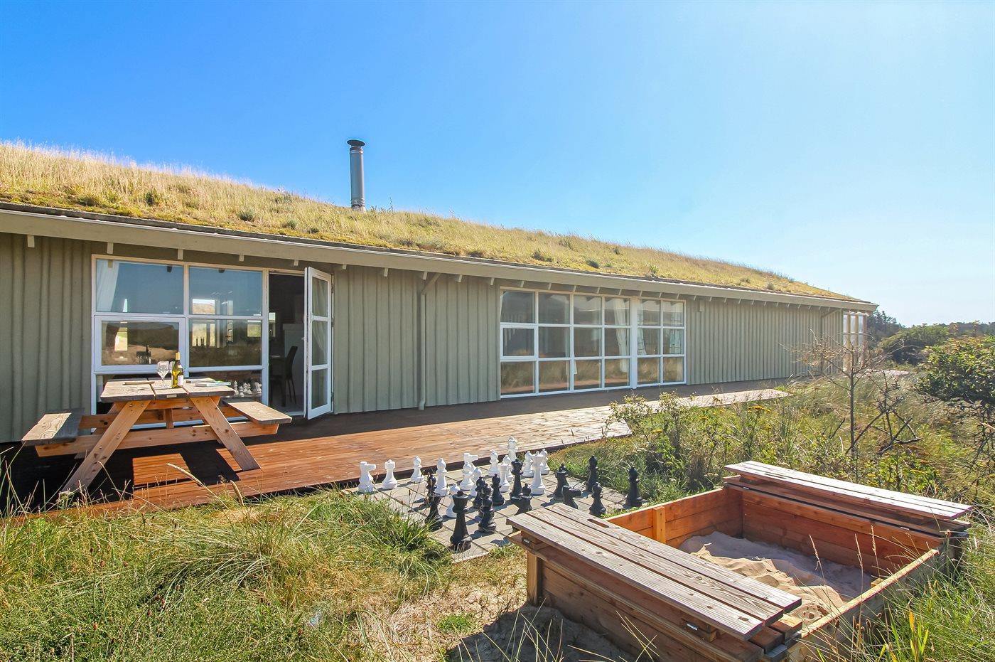 Er vejret til afslapning udenfor, i det skønne danske sommervejr, så er det bare at træde ud på den store træterrasse, som ligger som en forlængelse af huset. Her er du straks i ét med naturen og du kan nyde udsigten til det kuperede landskab, eller der er mulighed for tage et kapløb ned til Vesterhavet ad de mange stier og se hvem der vinder præmien for feriens første dukkert.