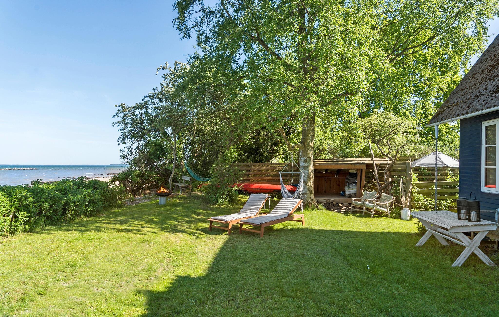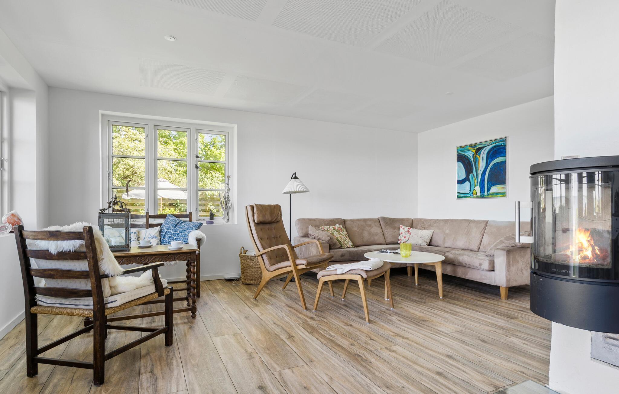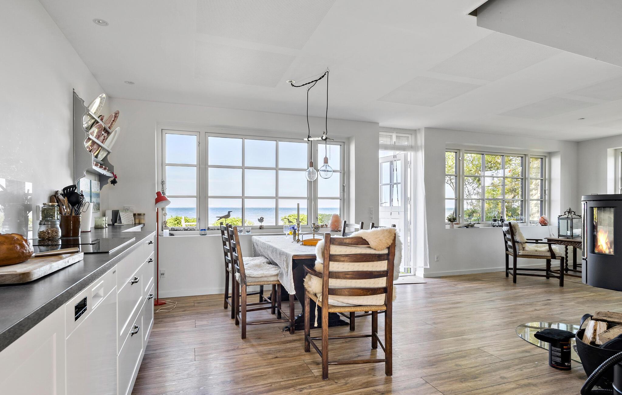 Dette sommerhus giver jer fantastiske bademuligheder lige foran huset. Dernæst kan I se frem til et skønt hus med store vinduespartier og en dejlig atmosfære. Opholdsrummet er i åben forbindelse med køkkenet og giver jer gode betingelser for familietid i løbet af ferien. Her kan I fylde dagene med god tid til måltiderne, brætspil og rolige stunder uden program. Det hyggelige sofahjørne er et godt sted at nyde udsigten over haven, mens børnene leger og har det sjovt. I kan tænde op i brændeovnen på en kølig aften. Husets grønne have giver jer en vidunderlig udsigt over havet og bliver jeres foretrukne opholdssted på de solrige dage.
