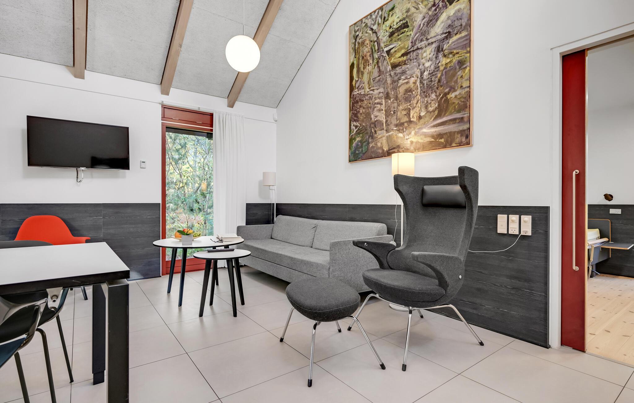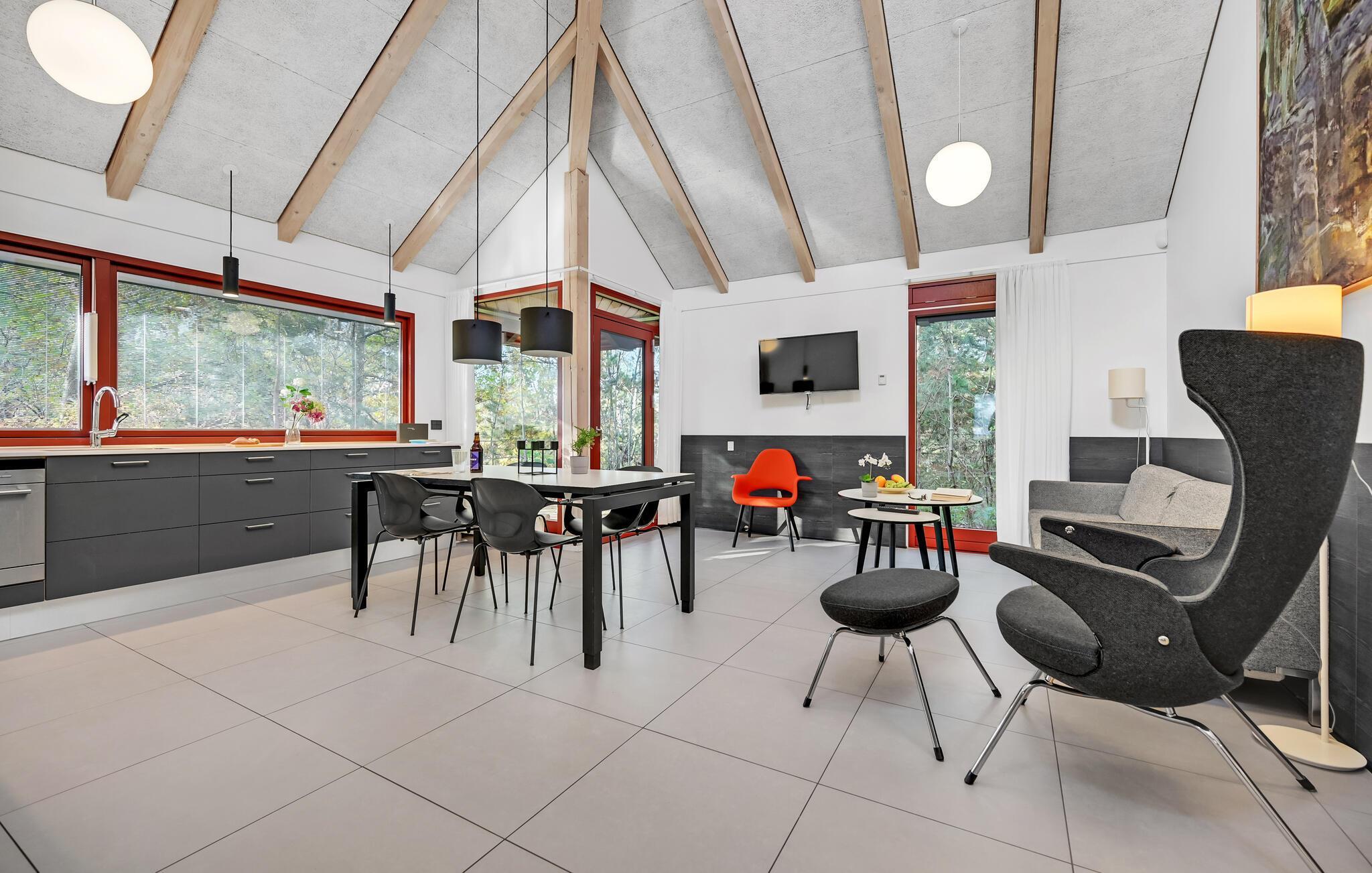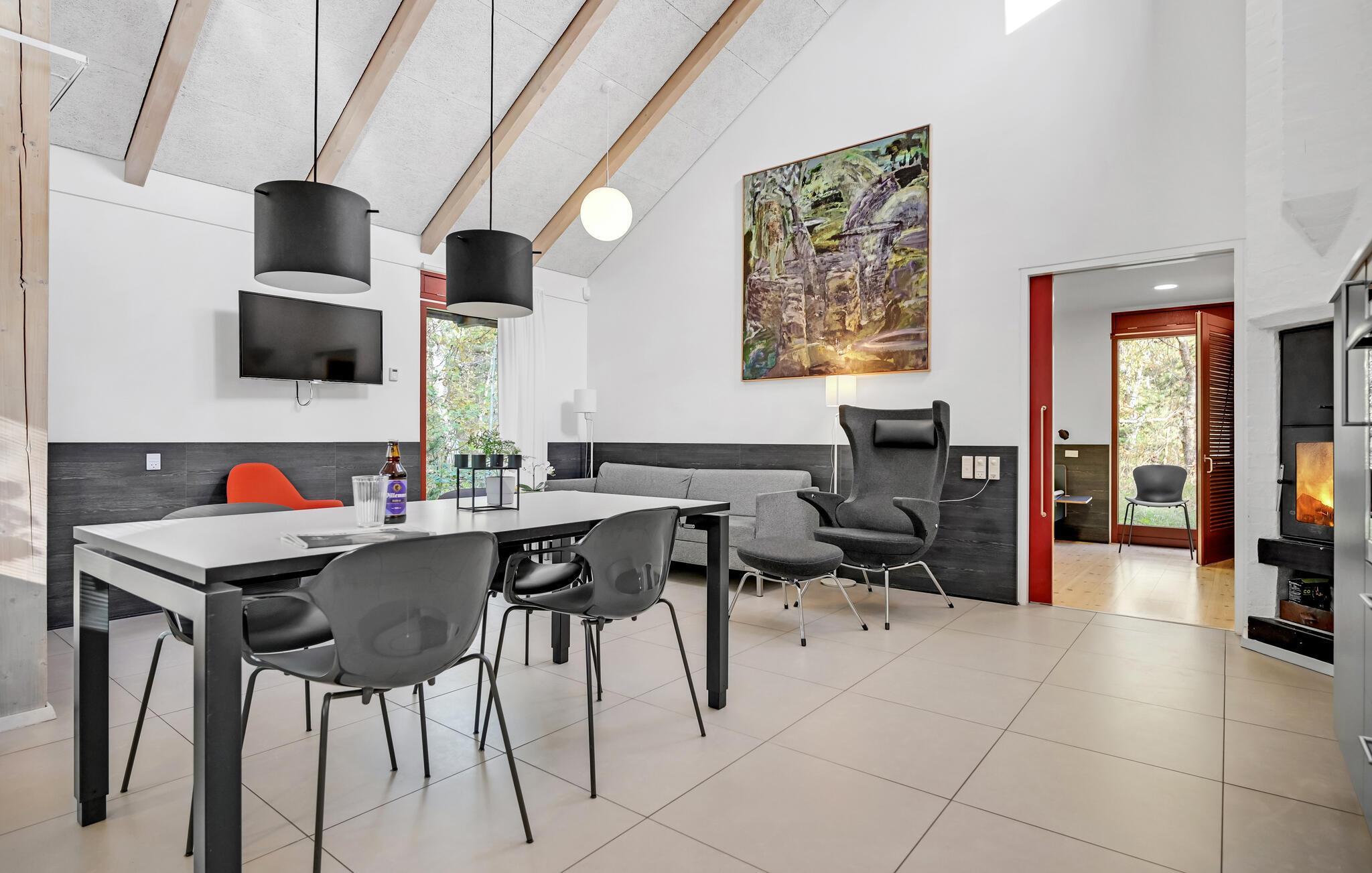 Dette lyse, indbydende og praktiske sommerhus byder op til fem gæster og et barn velkommen. Det har en hyggelig stue med køkken, hvor I kan slappe af foran brændeovnen. Der strømmer dejligt meget lys ind gennem de store vinduespartier.