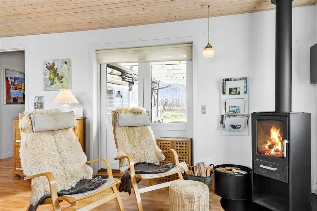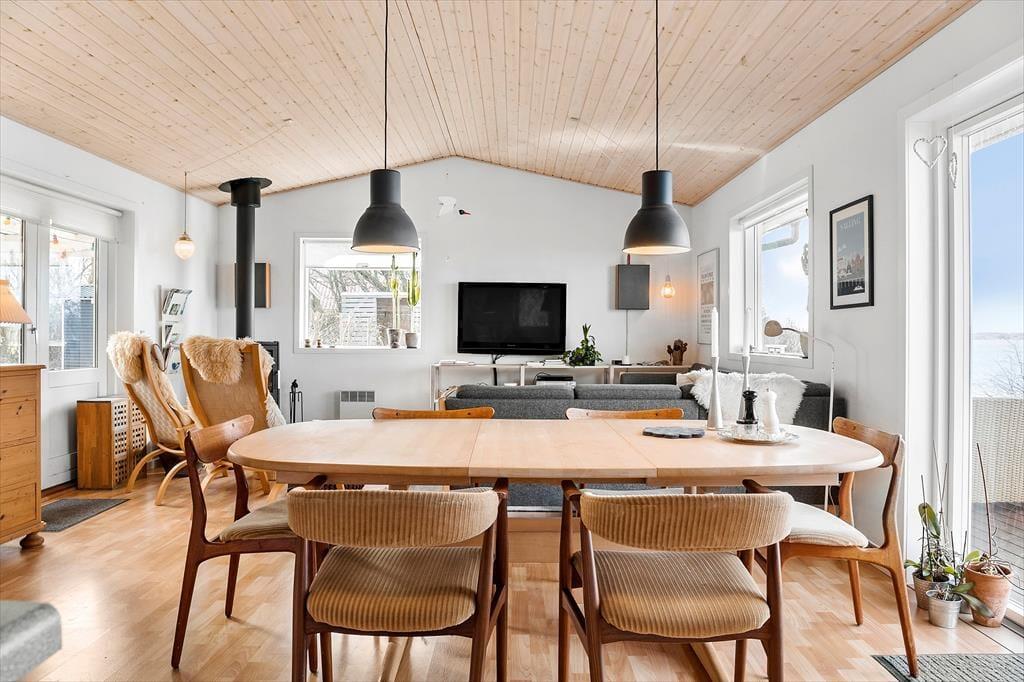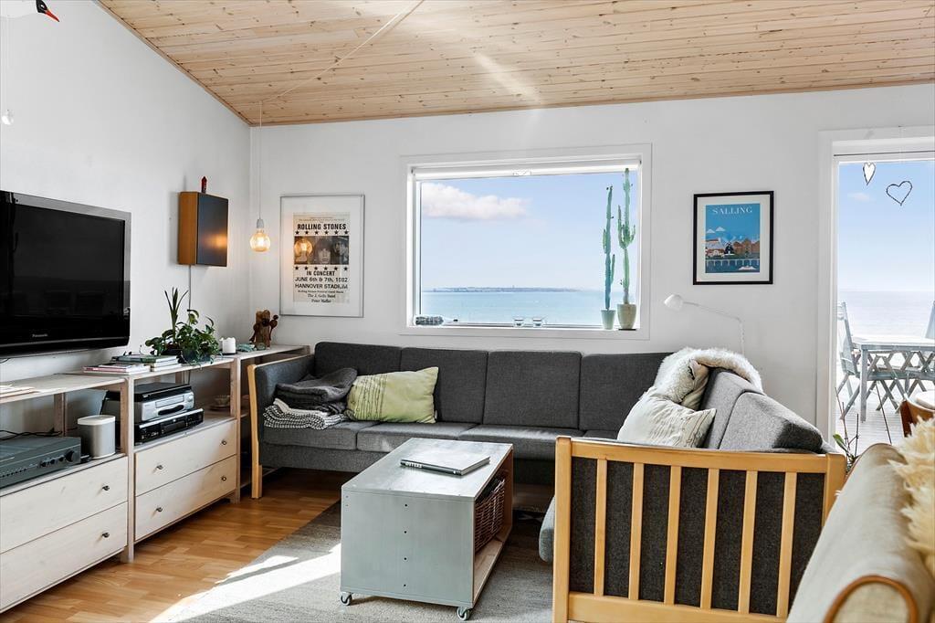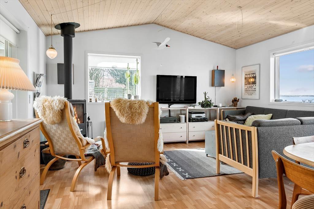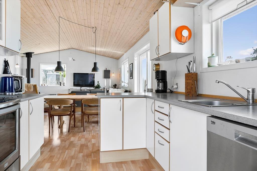 Det 80 m2 store sommerhus emmer af hygge og velvære – ikke mindst stuen, der byder på bløde siddepladser nær brændeovnen og en spiseplads med fjordudsigt. Også når I laver mad i det åbne køkken, kan I kigge lige ud på vandet, og hvis I hellere vil skrælle kartofler under åben himmel, har I direkte adgang fra opholdsafdelingen til en terrasse med udekøkken. Husets planløsning byder derudover på et badeværelse med bruseniche og vaskemaskine, og endelig er der tre gode soveværelser med sengepladser til i alt seks personer.