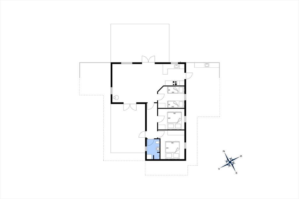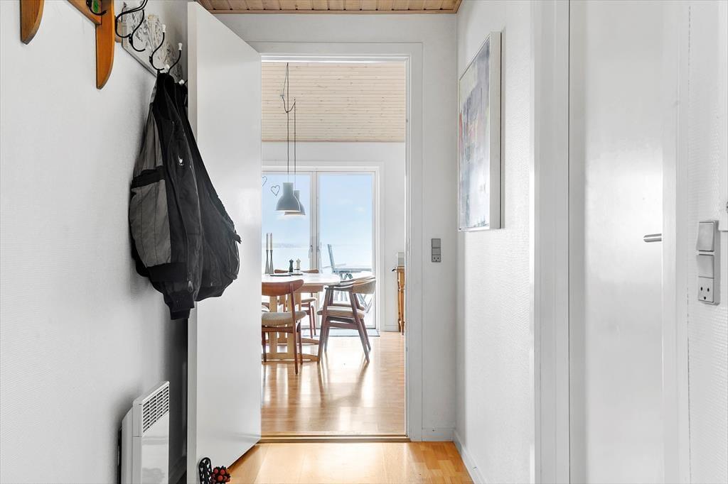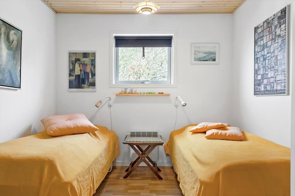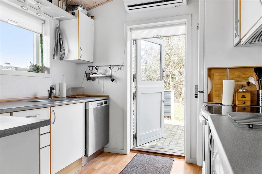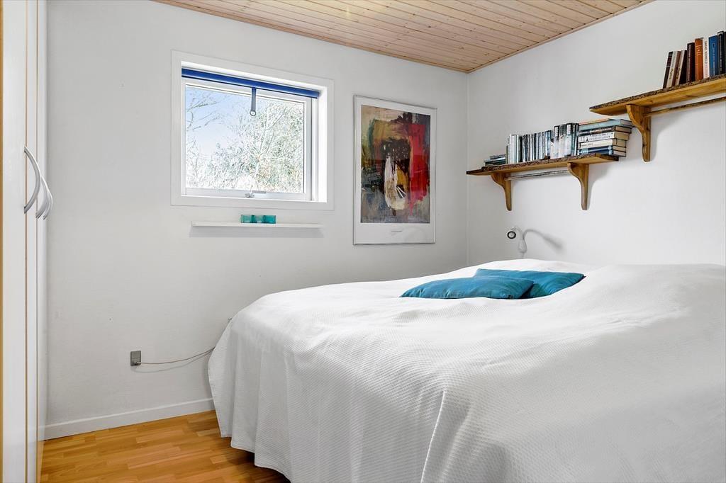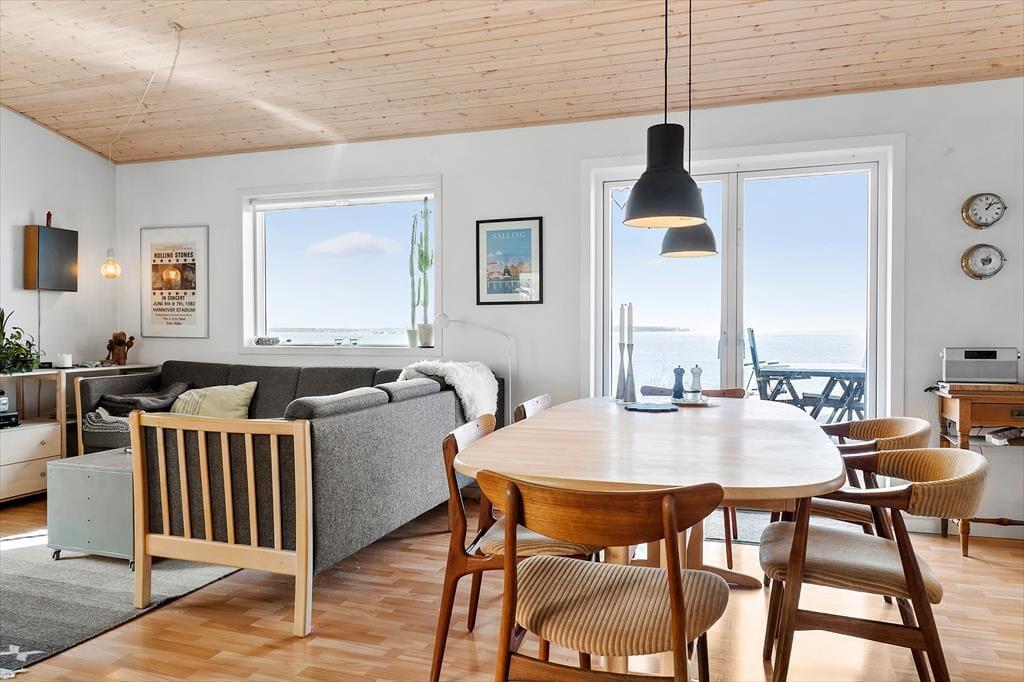 Det 80 m2 store sommerhus emmer af hygge og velvære – ikke mindst stuen, der byder på bløde siddepladser nær brændeovnen og en spiseplads med fjordudsigt. Også når I laver mad i det åbne køkken, kan I kigge lige ud på vandet, og hvis I hellere vil skrælle kartofler under åben himmel, har I direkte adgang fra opholdsafdelingen til en terrasse med udekøkken. Husets planløsning byder derudover på et badeværelse med bruseniche og vaskemaskine, og endelig er der tre gode soveværelser med sengepladser til i alt seks personer.