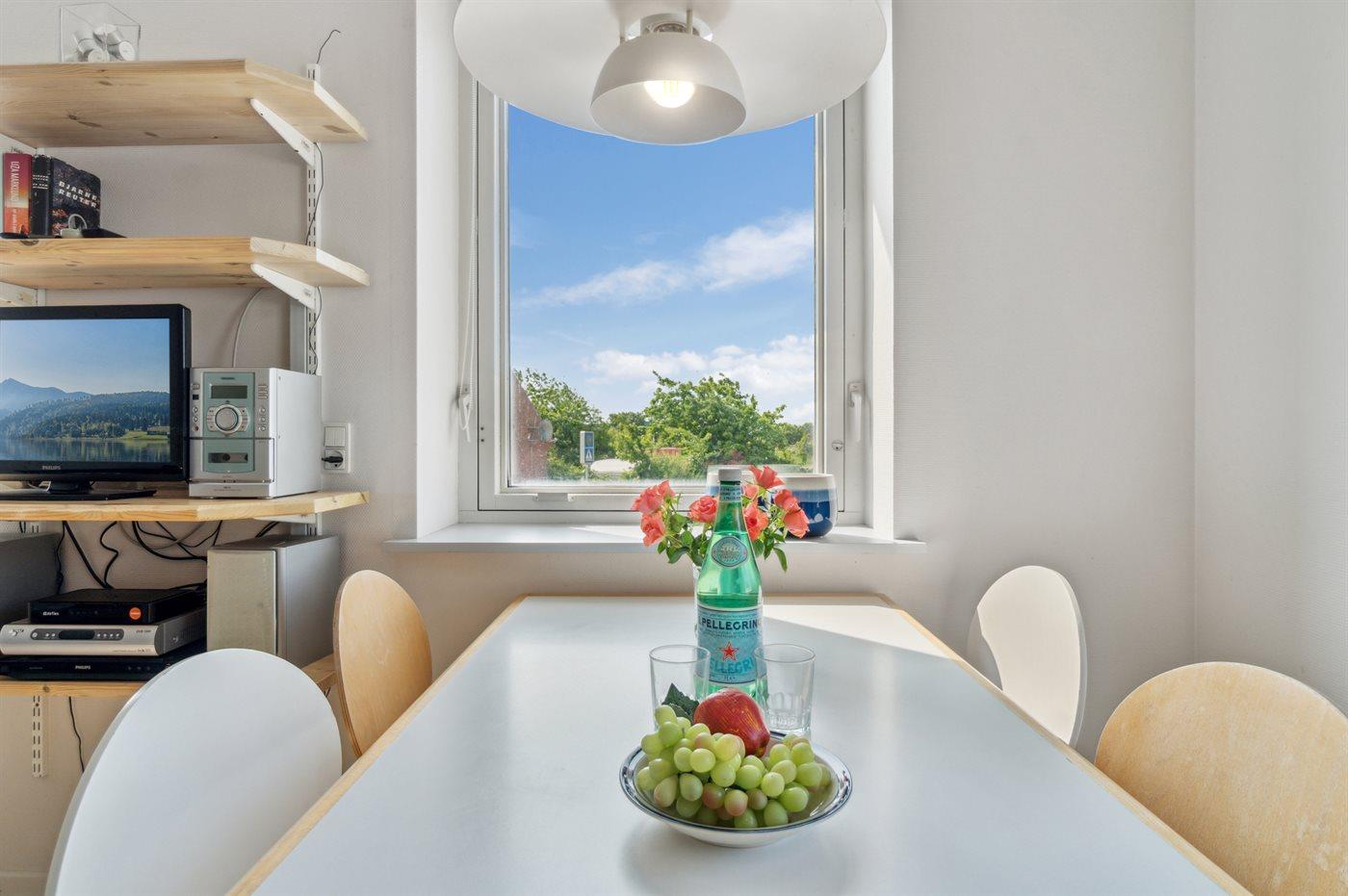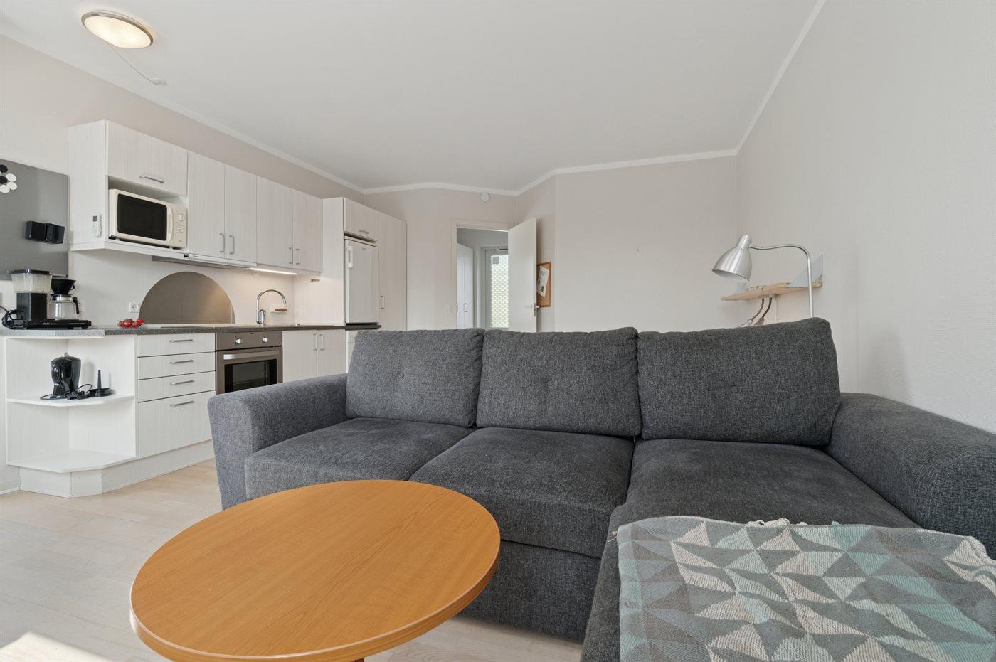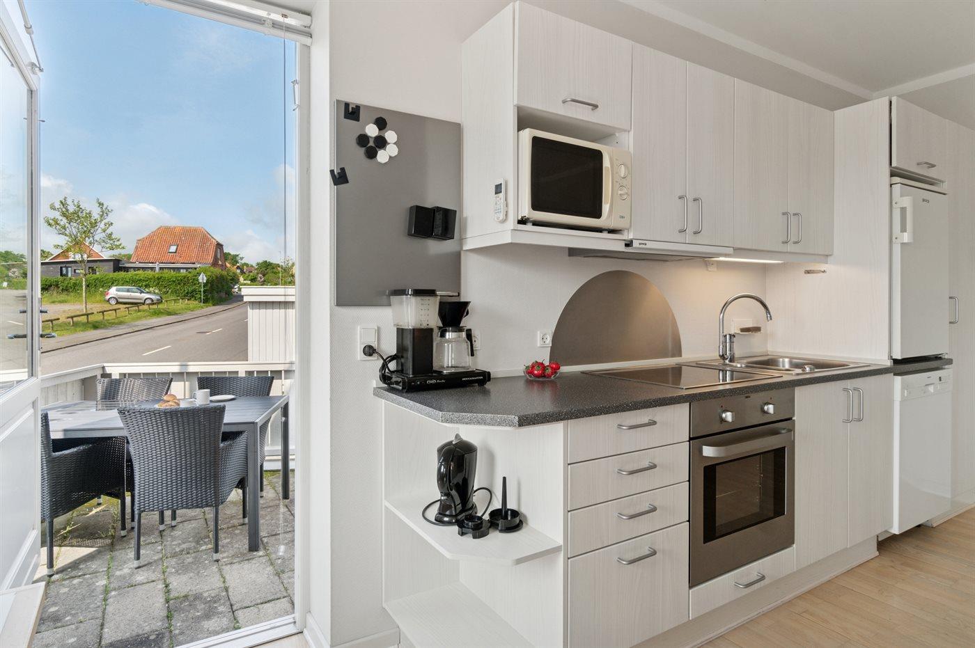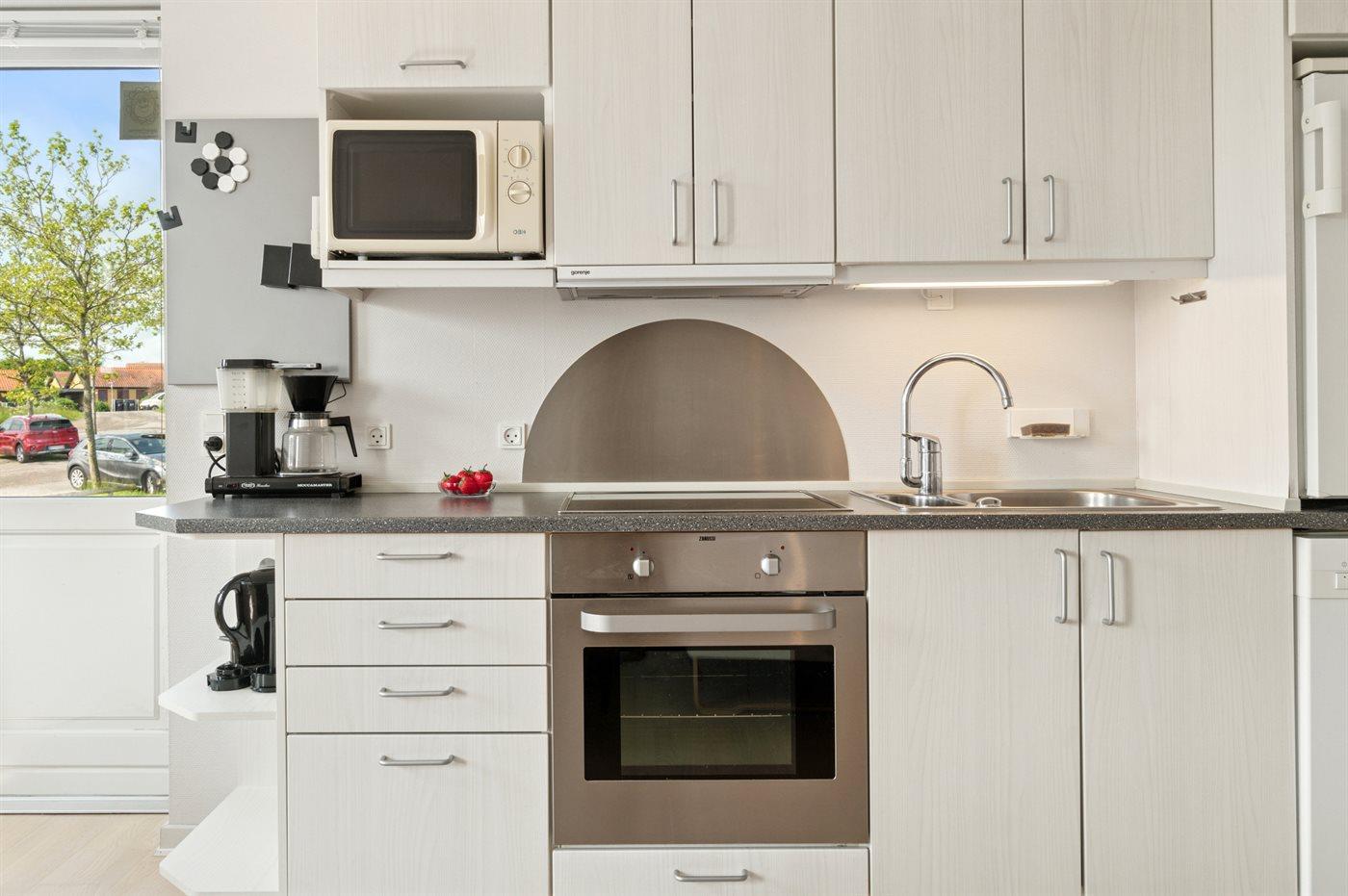 Køkkenet er udstyret med 1 køleskab. Der er 4 keramiske kogeplader, varmluftovn, mikrobølgeovn samt opvaskemaskine.