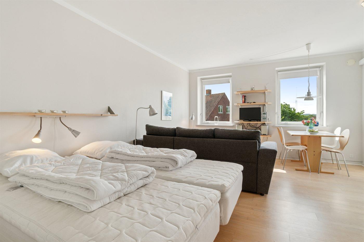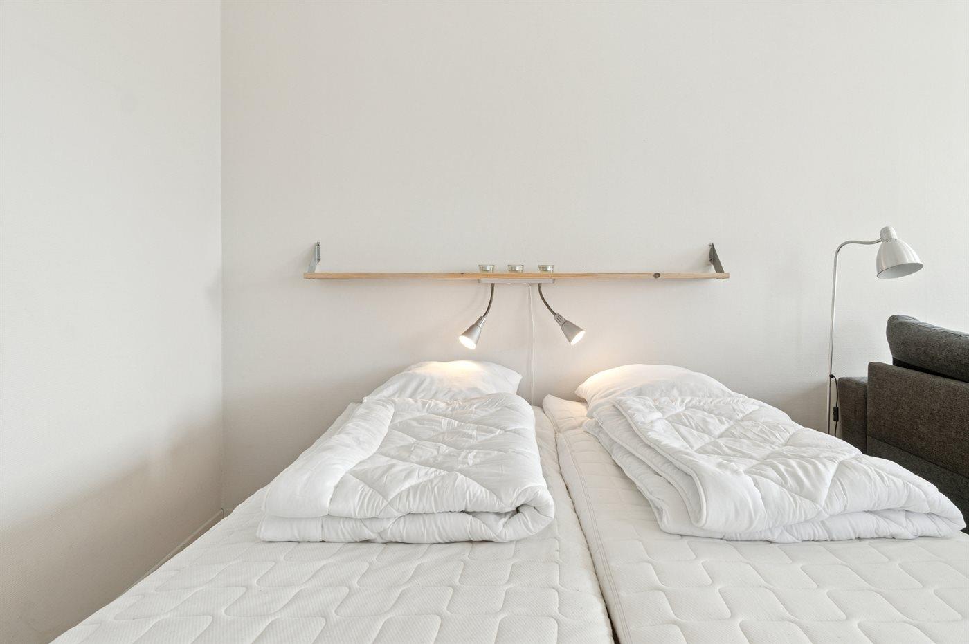 2 sovepladser i dobbeltseng. Disse 2 sovepladser befinder sig i stuen.