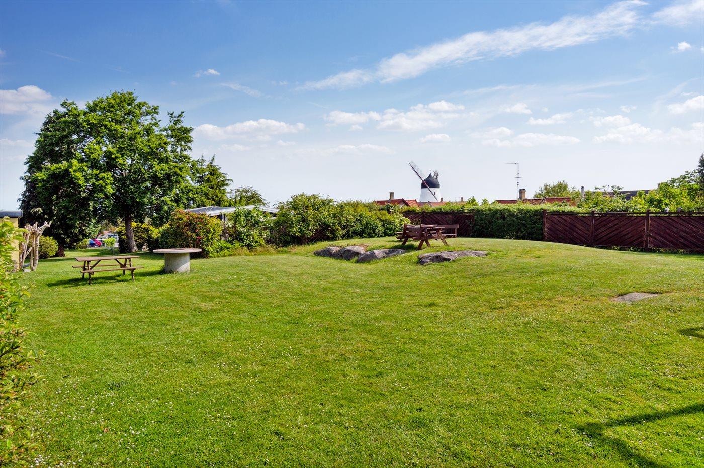 At opleve sommerens mange mennesker, der besøger Gudhjem og den stejle butiksgade Brøddegade, er absolut anbefalelsesværdigt, men det er også dejligt at kunne trække sig tilbage i lidt mere fredelige omgivelser. Det store fællesområde med let kuperede plæner, lidt klippefremspring og lækroge virker indbydende, når man skal finde freden efter en hektisk feriedag med alle Gudhjems seværdigheder og massive klippeplateauer.