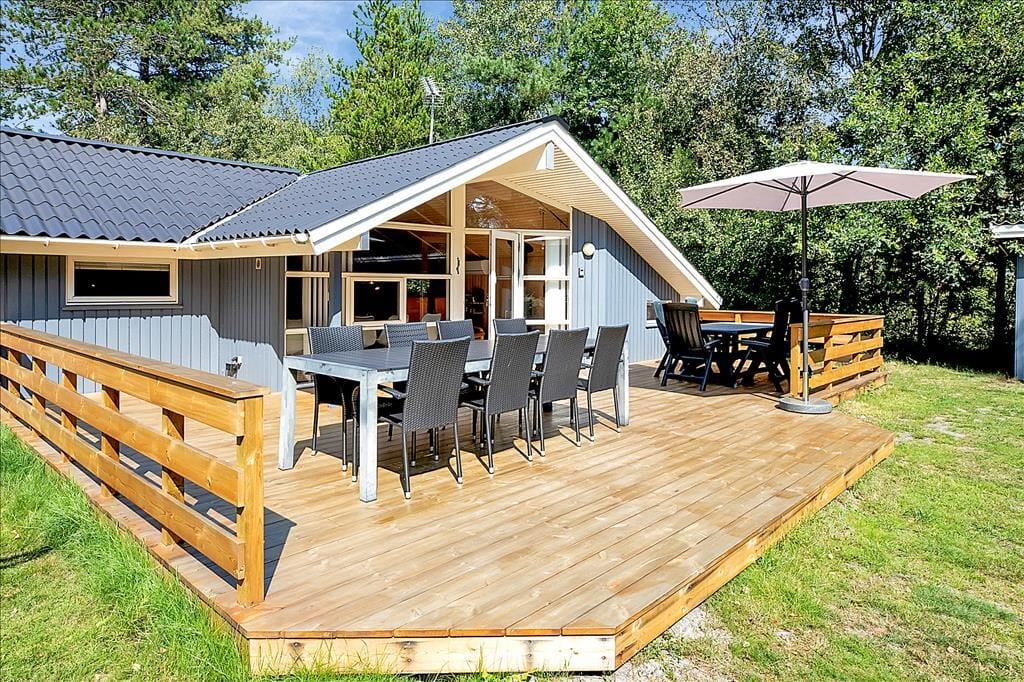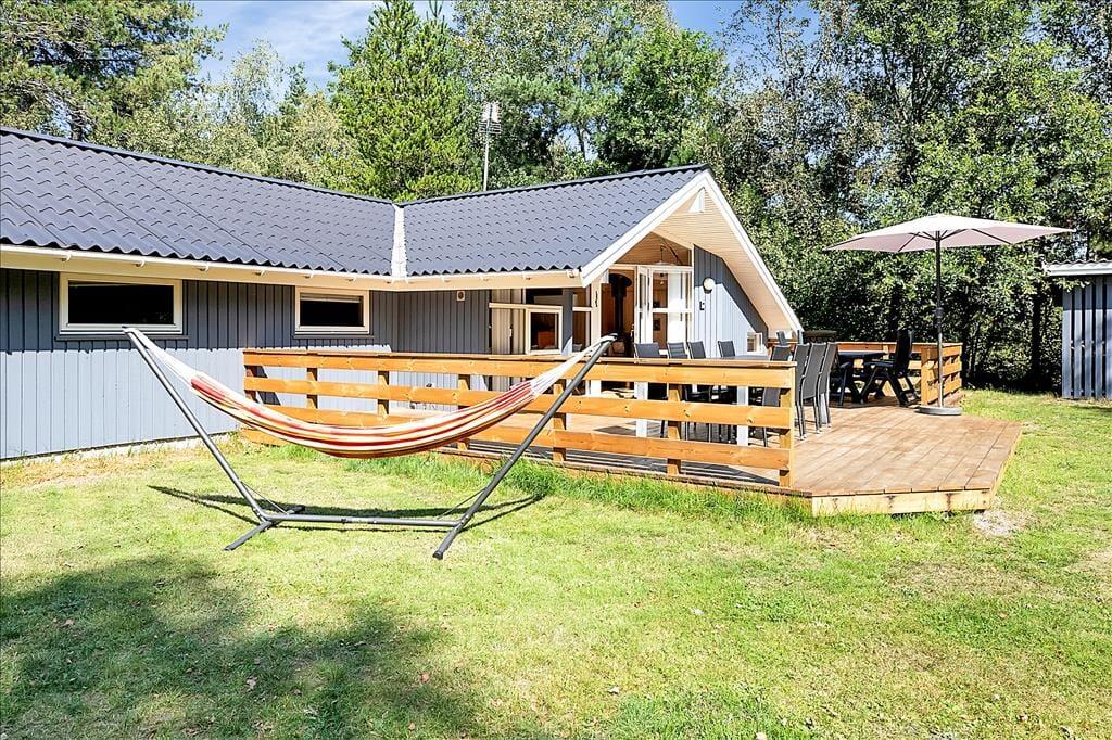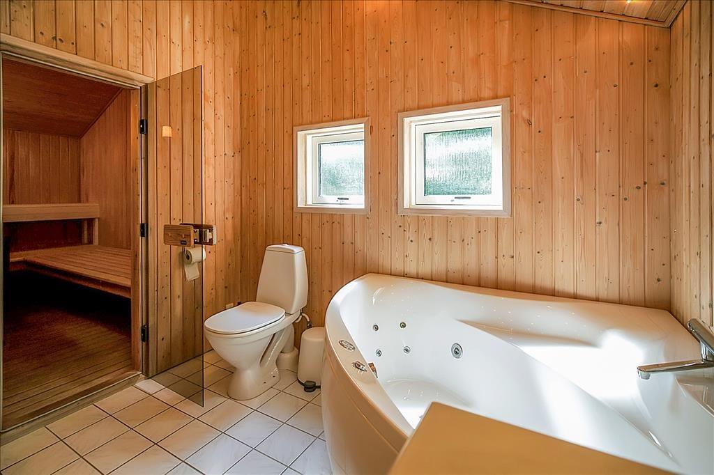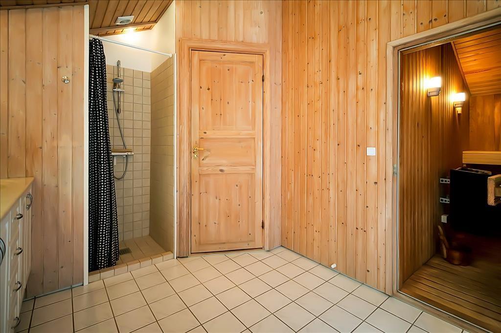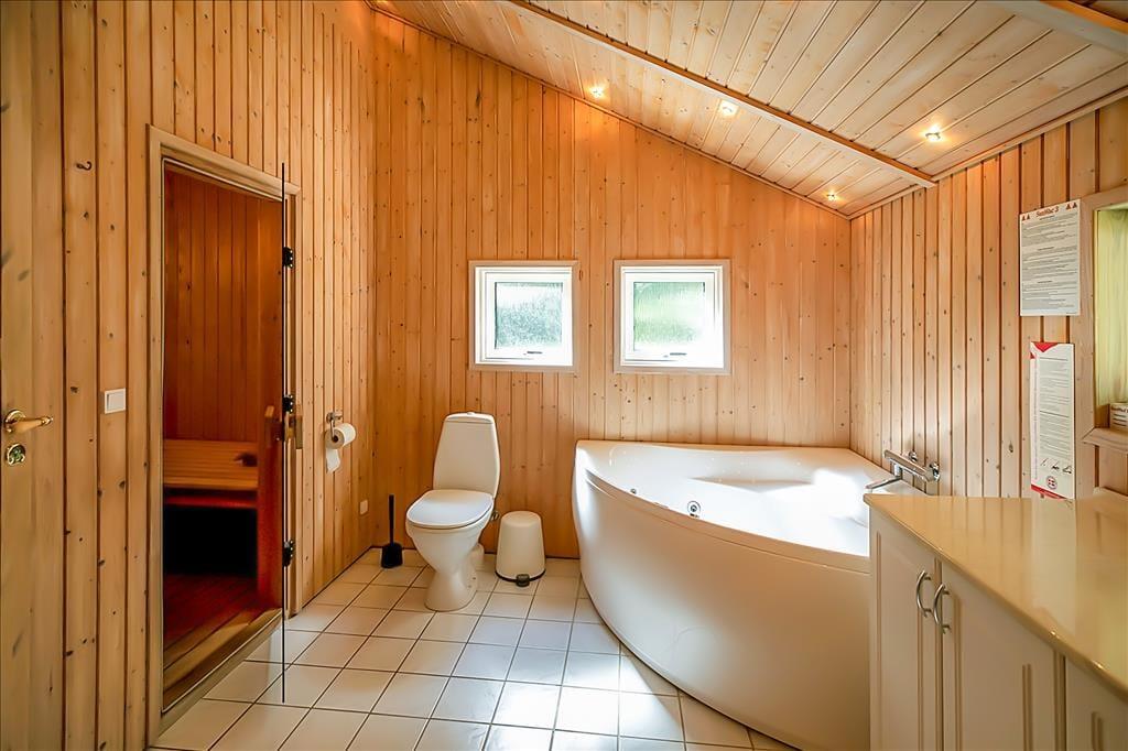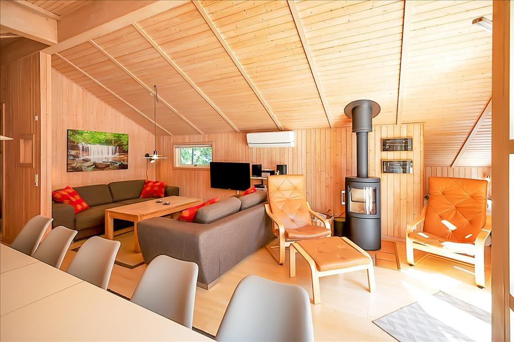 I dette store rummelige og moderne familiesommerhus har I alle faciliteter og masser af plads til alle. Stuen med udkik til terrassen og haven er det naturlige samlingssted, hvad enten det er i sofaarrangementet eller ved spisebordet, og her kan I tilbringe mange timer med at spille og hygge. Skulle det blive for varmt, slår I bare døren op til terrassen. Bliver det køligt, sørger brændeovnen for en behagelig hyggelig varme. Ellers er det også muligt at få varmen fra en tur i husets sauna eller spabad.