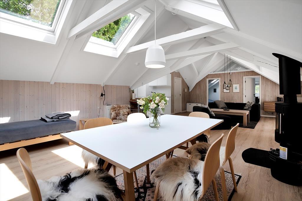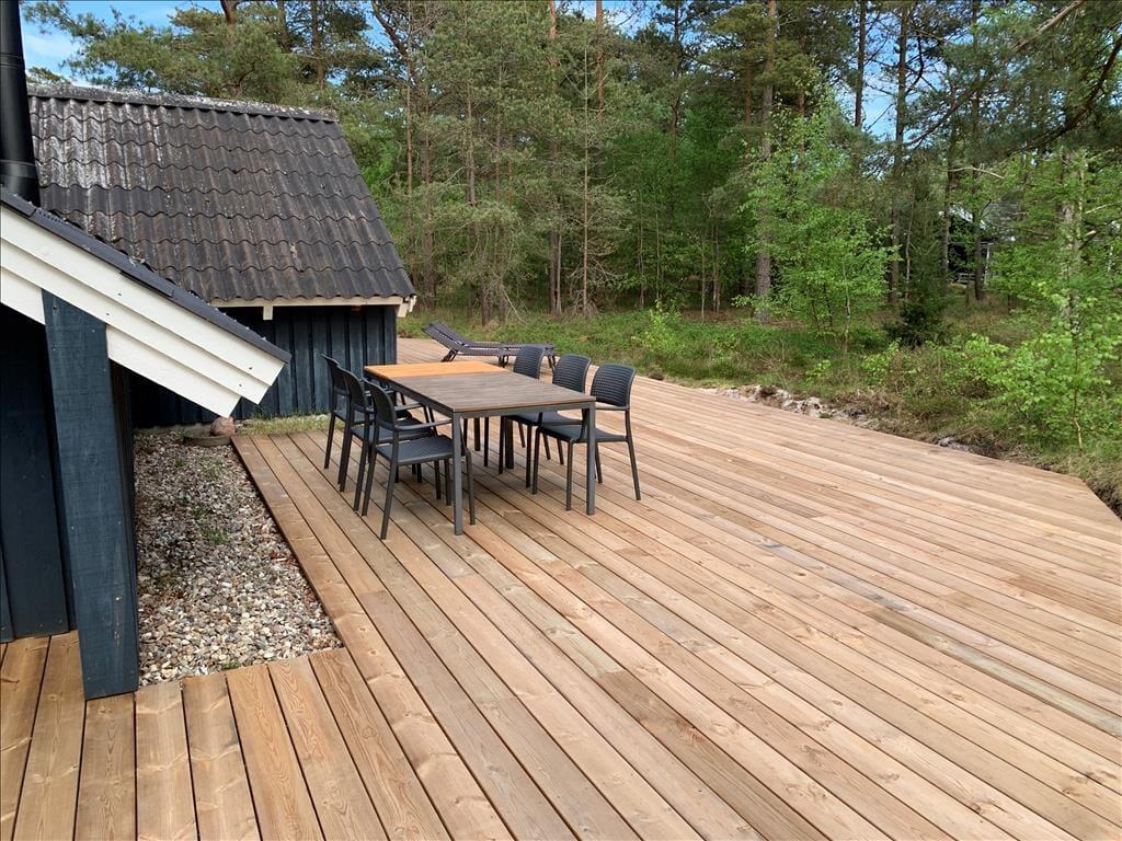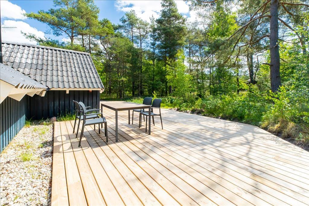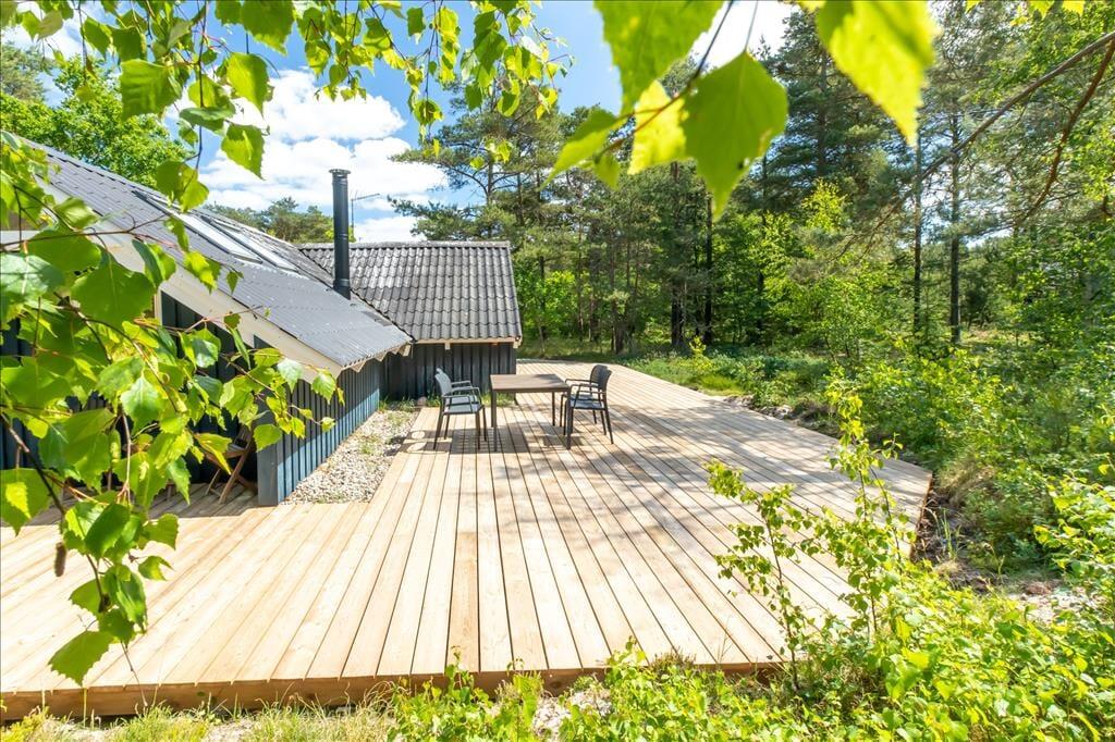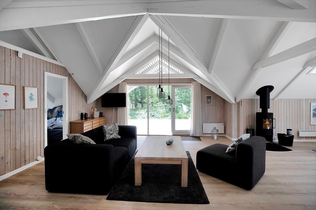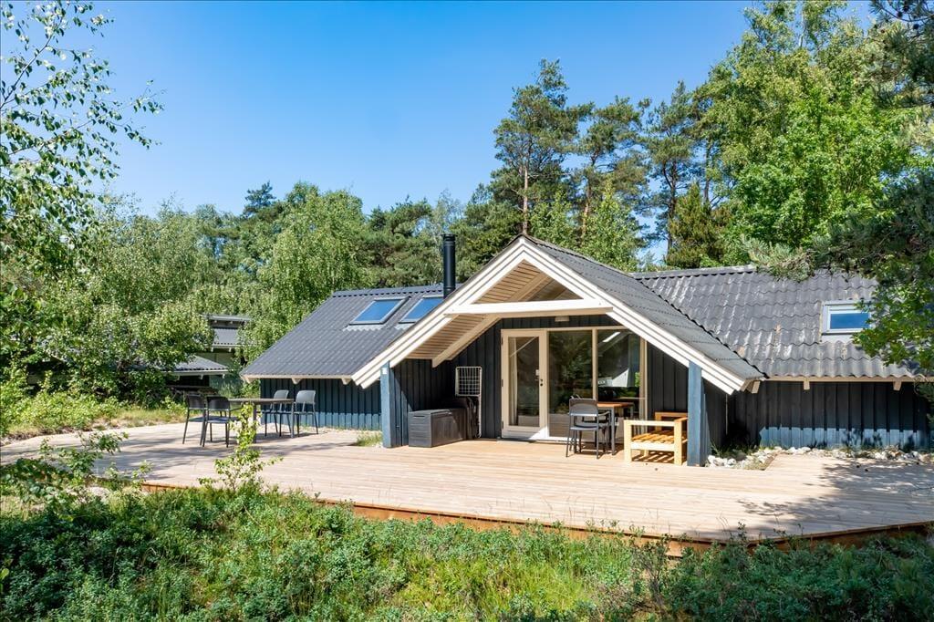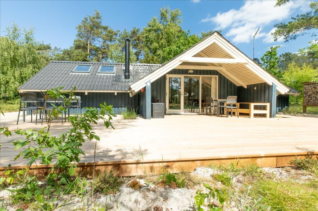 Huset indeholder en hyggelig stue med sofa arrangement foran brændeovnen og med udsigt til naturgrunden med den smukke lyng, hvor rådyrene jævnligt krydser. I den store spisestue, er der en sovesofa til 2 personer samt masser af gulvplads til legende børn samt et åbent køkken med opvaskemaskine. Huset indeholder desuden 2 soverum med henholdsvis 1 dobbeltseng og 2 enkeltsenge samt kommode og skabsplads. Der er badeværelse med brus. Tagkonstruktion og tagvinduer giver et fantastisk lysindfald. På den store træterrasse med udgang fra stuen, kan I hele dagen nyde jeres ophold med at grille, solbade eller læse en god bog.