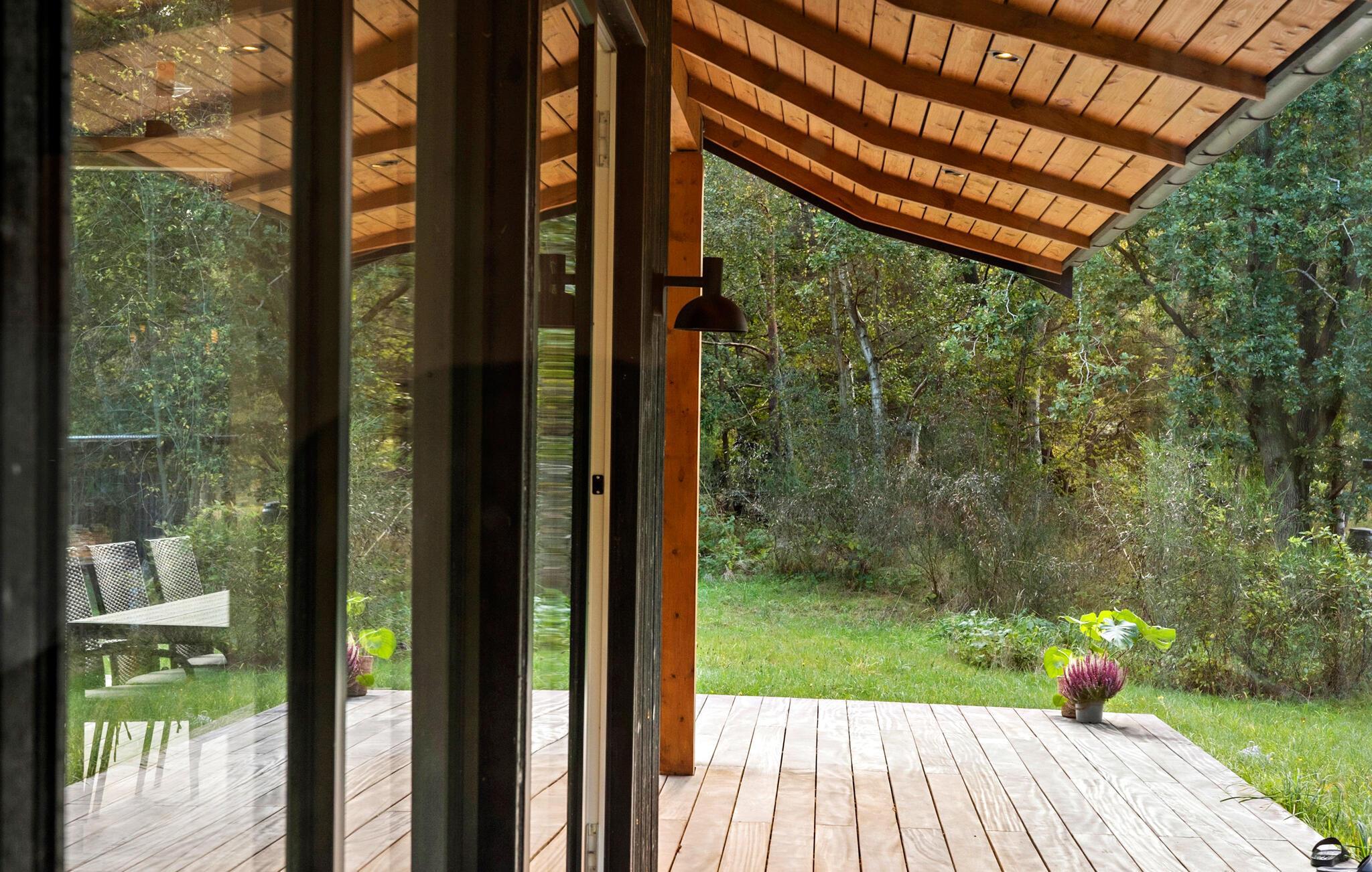 Udenfor venter en stor træterrasse med loungemøbler og liggestole. Nyd morgenmaden i den friske luft og benyt udendørsbruseren i sommerhalvåret efter en dag på stranden eller nyd aftenen i den behagelige aftensol. Naturgrunden er omgivet af træer, så her har I det dejligt privat.