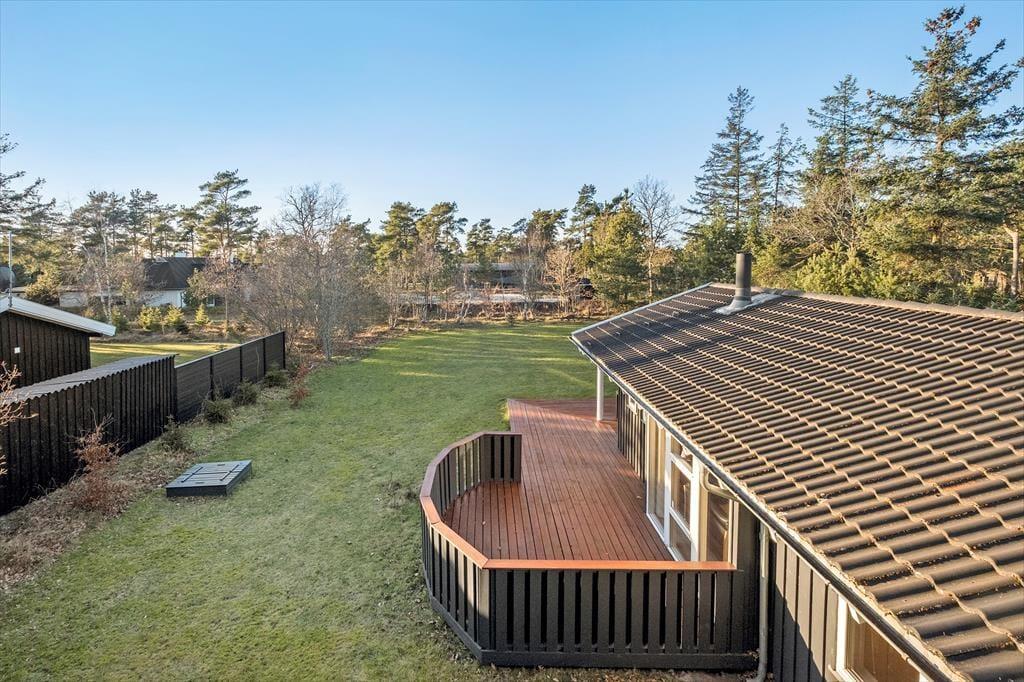Der er en god stor terrasse med mulighed for sol fra morgen til aften. En del af terrassen er overdækket, så man kan komme i ly for dug og regn. Herfra kigger man ud på den mest vidunderlige grund omkranset af høje træer og en god plæne, der er som anlagt til boldspil, leg og hygge ved bålstedet. Her kan man opholde sig ugenert og nyde ferien i fulde drag. Der findes et væld af skønne stier i umiddelbar nærhed af huset så medbring de gode vandresko på ferien.