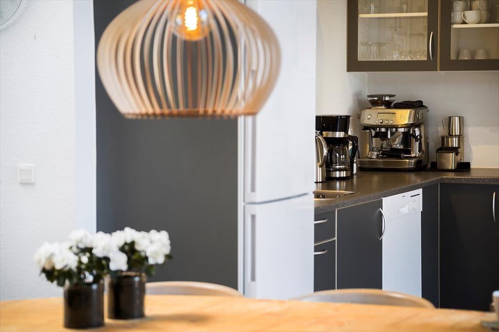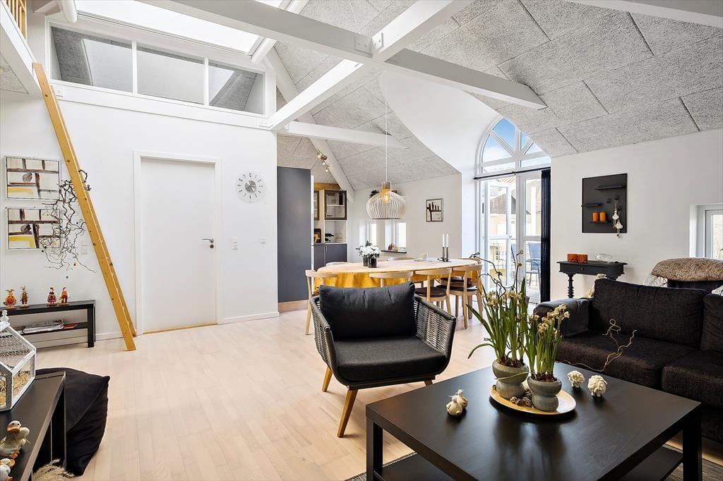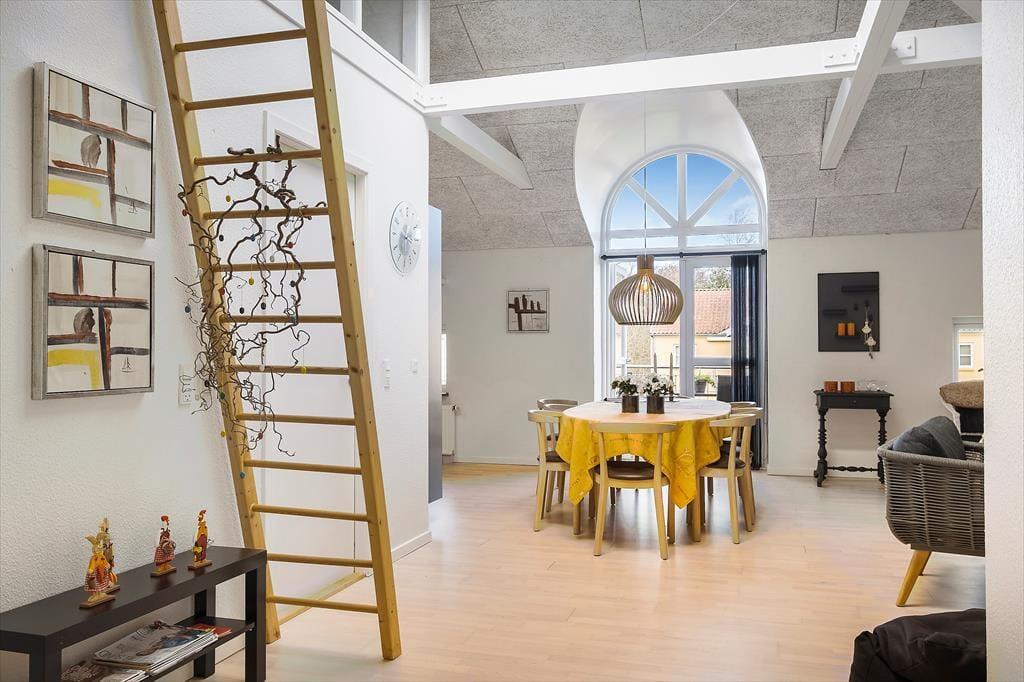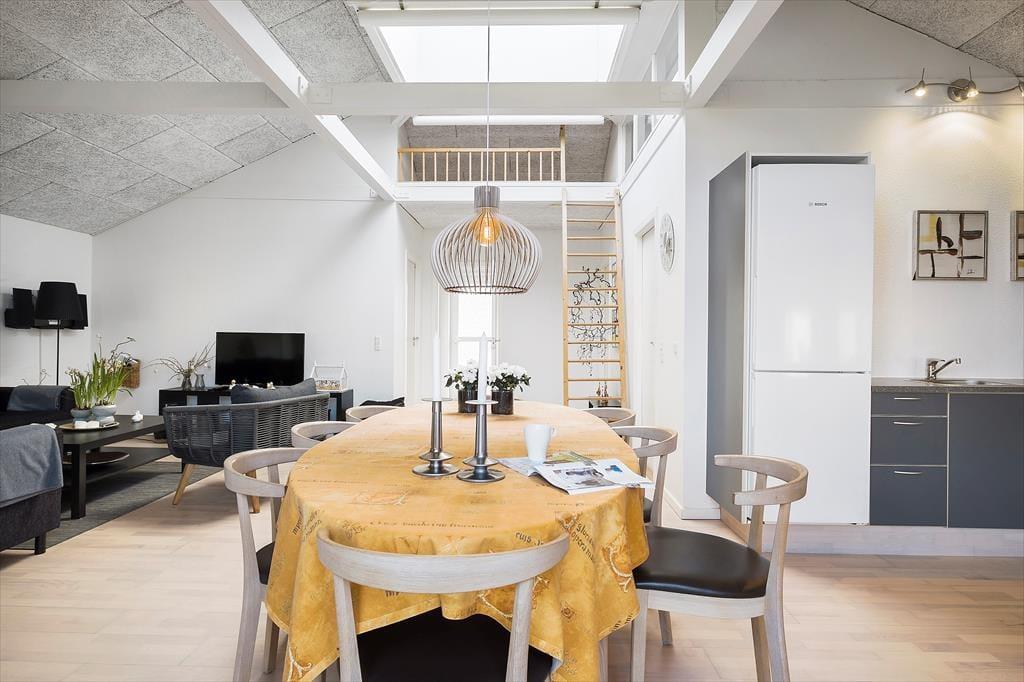I skal op på første sal for at komme til ferielejligheden, der måler 93 m2 og har en fornuftig planløsning til fire personer – og så er et husdyr for øvrigt også velkomment. De to soveværelser er begge udstyret med dobbeltseng, og på badeværelset er der glasbruseniche, vaskemaskine og god plads til at stille toilettaskerne. Stuen er et dejligt opholdsrum med pænt møblement, integreret køkkenafdeling og et stort ovenlysvindue, der inviterer ekstra meget sollys indenfor. En stige fører op til en lille hems, hvor børnene kan lege, og via altandøren kan I hurtigt smutte ud i det fri med dagens avis og en god kop kaffe.