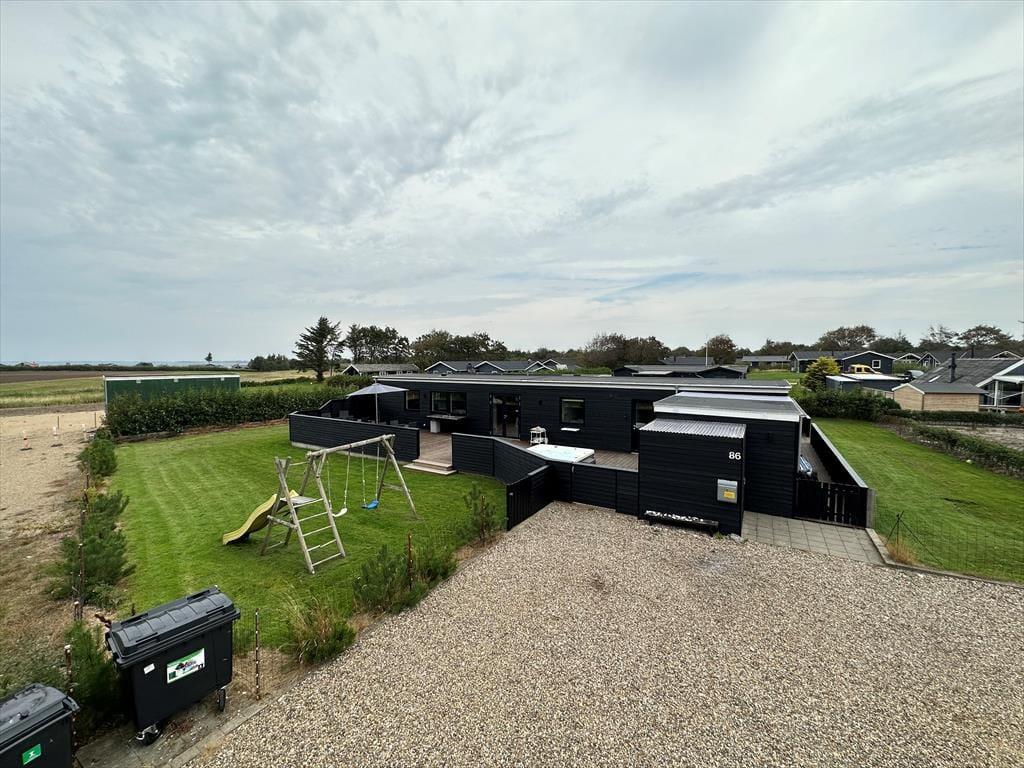 På husets store terrasse folder ferielivet sig ud med alt, hvad hjertet kan begære – og mere til. Her er god plads til at slappe af i solen med en bog, spille kort med børnene eller nyde lange, lune sommeraftener i godt selskab. Det lækre udendørs spabad er et af husets helt store højdepunkter. Forestil dig at sidde her under stjernerne med et glas bobler i hånden, mens vandet bruser blidt omkring dig – ren magi! Haven er rummelig og grøn, og her er rigelig plads til leg, boldspil og løbende hundepoter, for hele tre hunde er hjerteligt velkomne her. Med både åbne og mere afskærmede kroge på terrassen kan du altid finde et sted med læ – og når grillen tændes, spreder duften af sommer sig over hele haven.