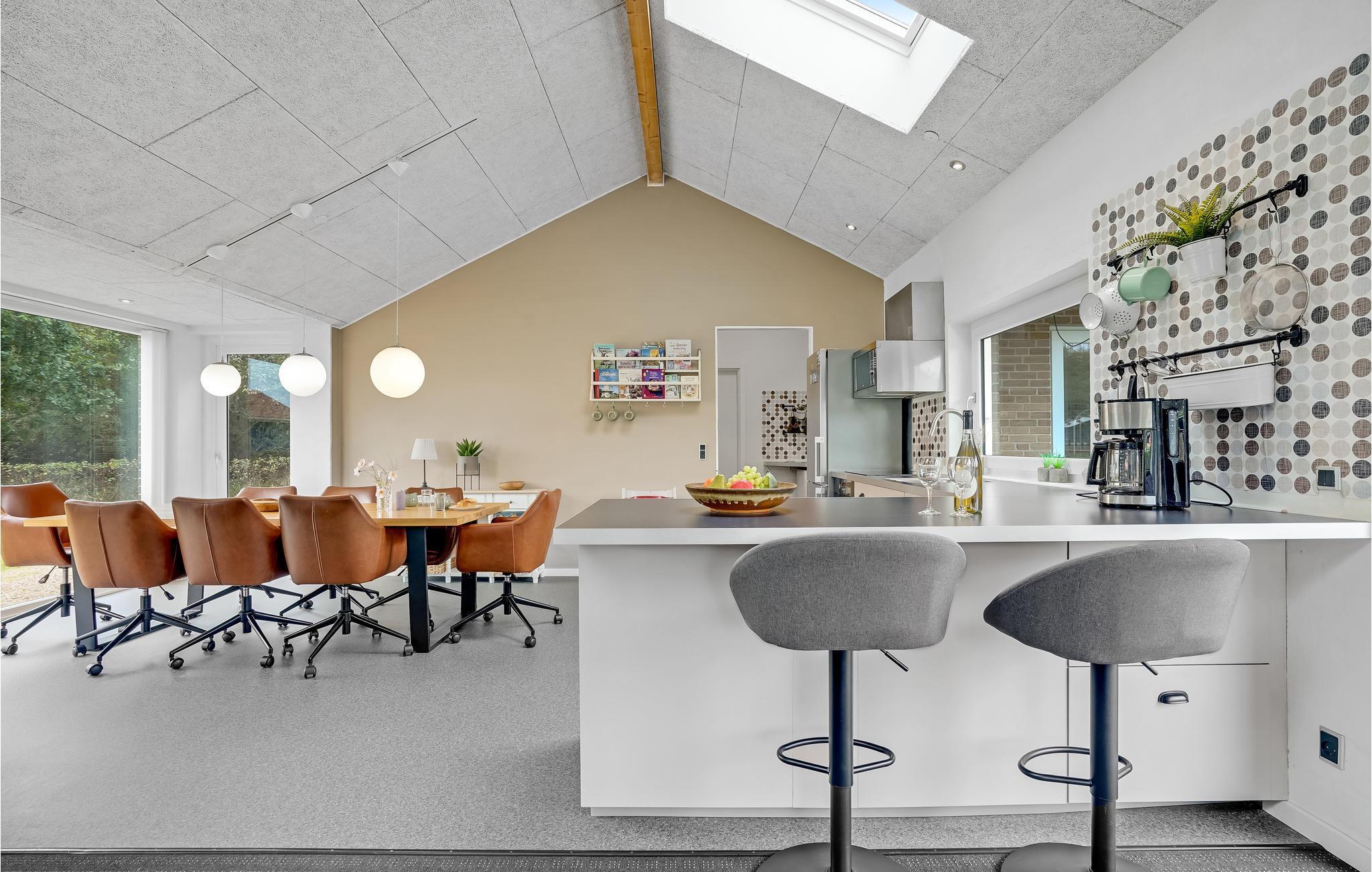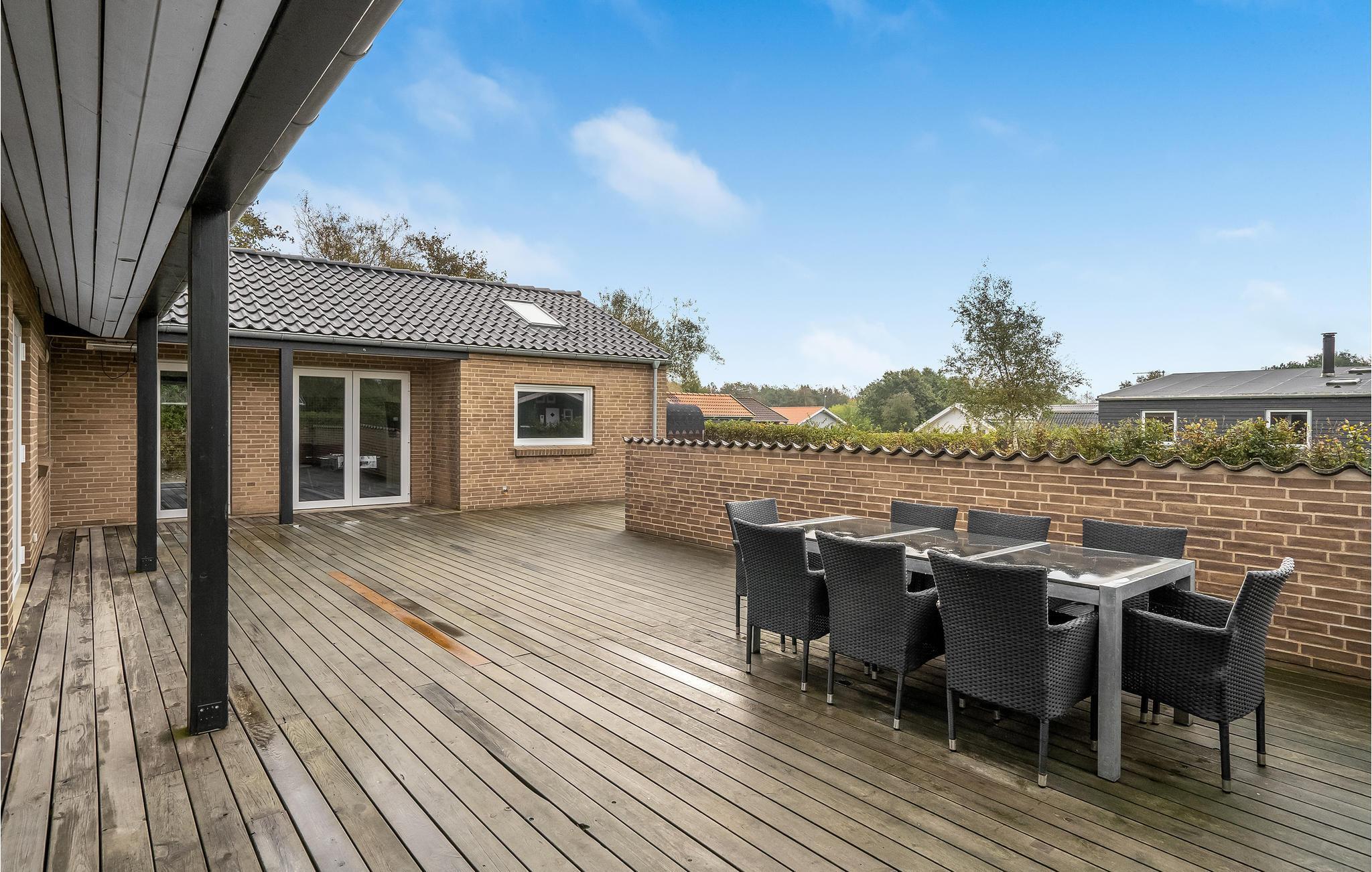 Dette rummelige og moderne indrettede sommerhus nær fjorden byder op til ti gæster velkommen. Sommerhuset inviterer jer til at slappe af både inde og ude. Her finder I to fjernsyn med DVD-afspillere og et bordfodboldbord. I kan slappe af i de komfortable havemøbler på de delvist overdækkede terrasser, som også er oplagte steder at spise jeres morgenmad og senere afslutte dagen med et glas vin. En grill er til rådighed til hyggelige grillaftener. I kan slappe af i den skønne sauna i haven og derefter hoppe i det opvarmede finske vildmarksbad. Der er masser af plads til at lege i den store have.