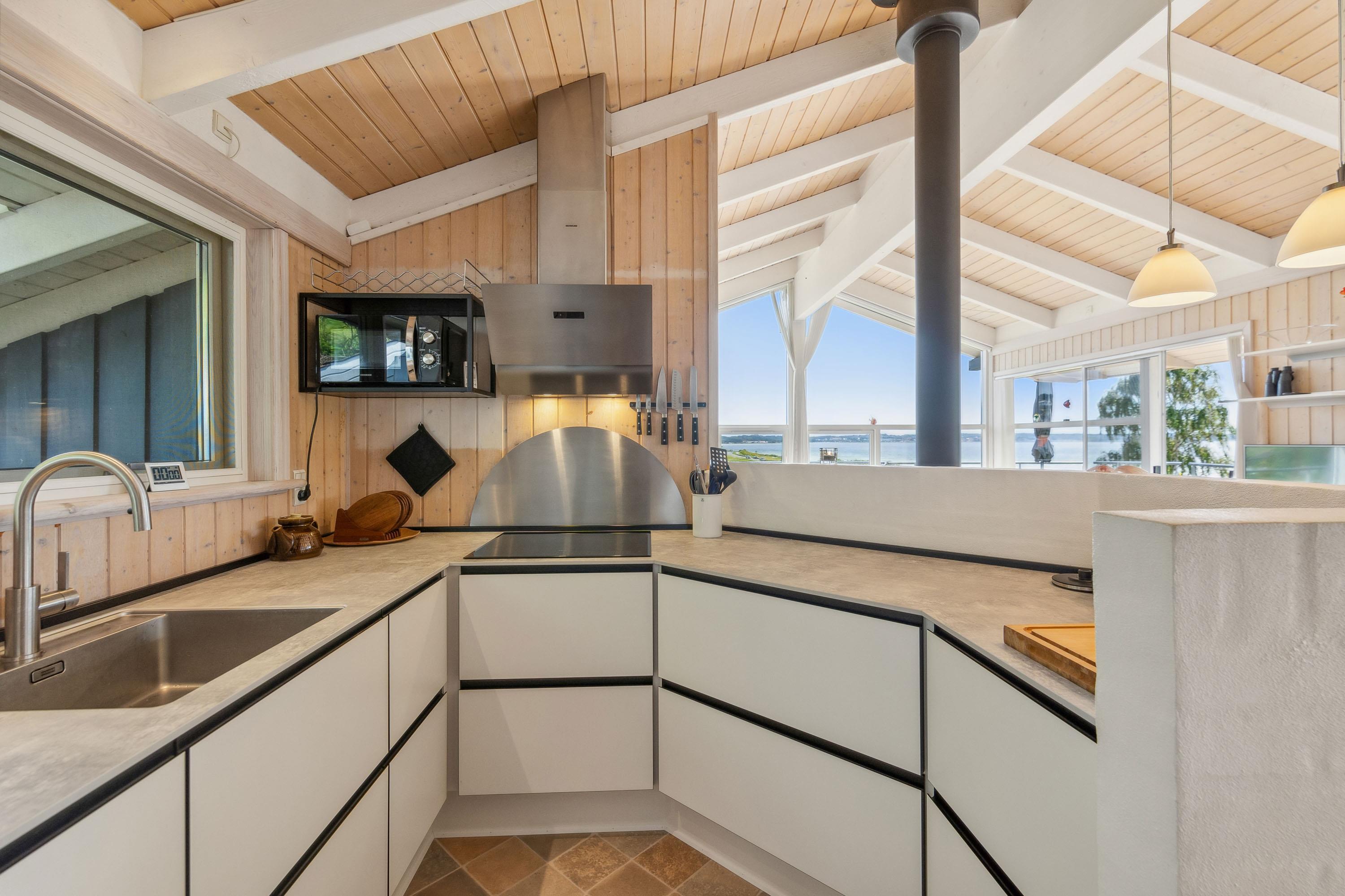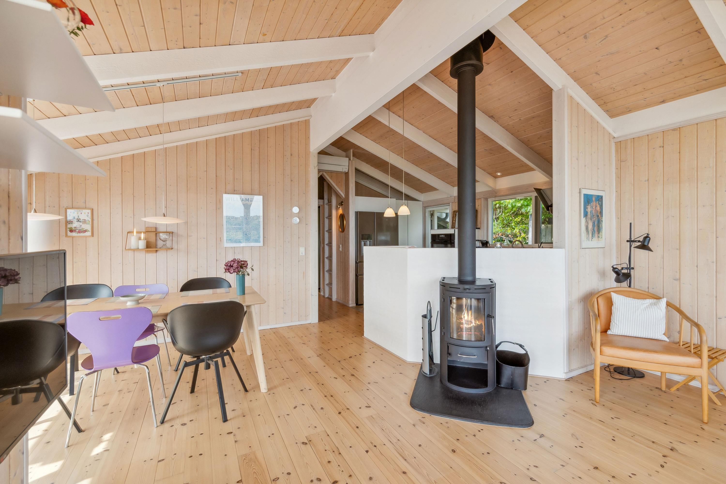 Højt beliggende og med den mest fantastiske udsigt over Ebeltoft Vig og Mols Bjerge, finder man dette yderst velholdte og velindrettede feriehus.Såvel fra grunden som fra huset har man den mest storslåede udsigt. Her finder man en flot og velindrettet stue med gode møbler, brændeovn og varmepumpe. Fra stuen er der udgang til den skønne terrasse med havemøbler. I forbindelse med stuen finder man det flotte og veludstyrede køkken med b.la. amerikansk køleskab og opvaskemaskine. Stort badeværelse med bruseniche, spa-bad og vaskemaskine samt adgang til sauna. Husets sengepladser fordeler sig i tre soveværelser; heraf to med dobbeltsenge samt et værelse med to enkeltsenge. Til de små feriegæster er der et puslebord samt en barnestol. TV foregår via chromecast.