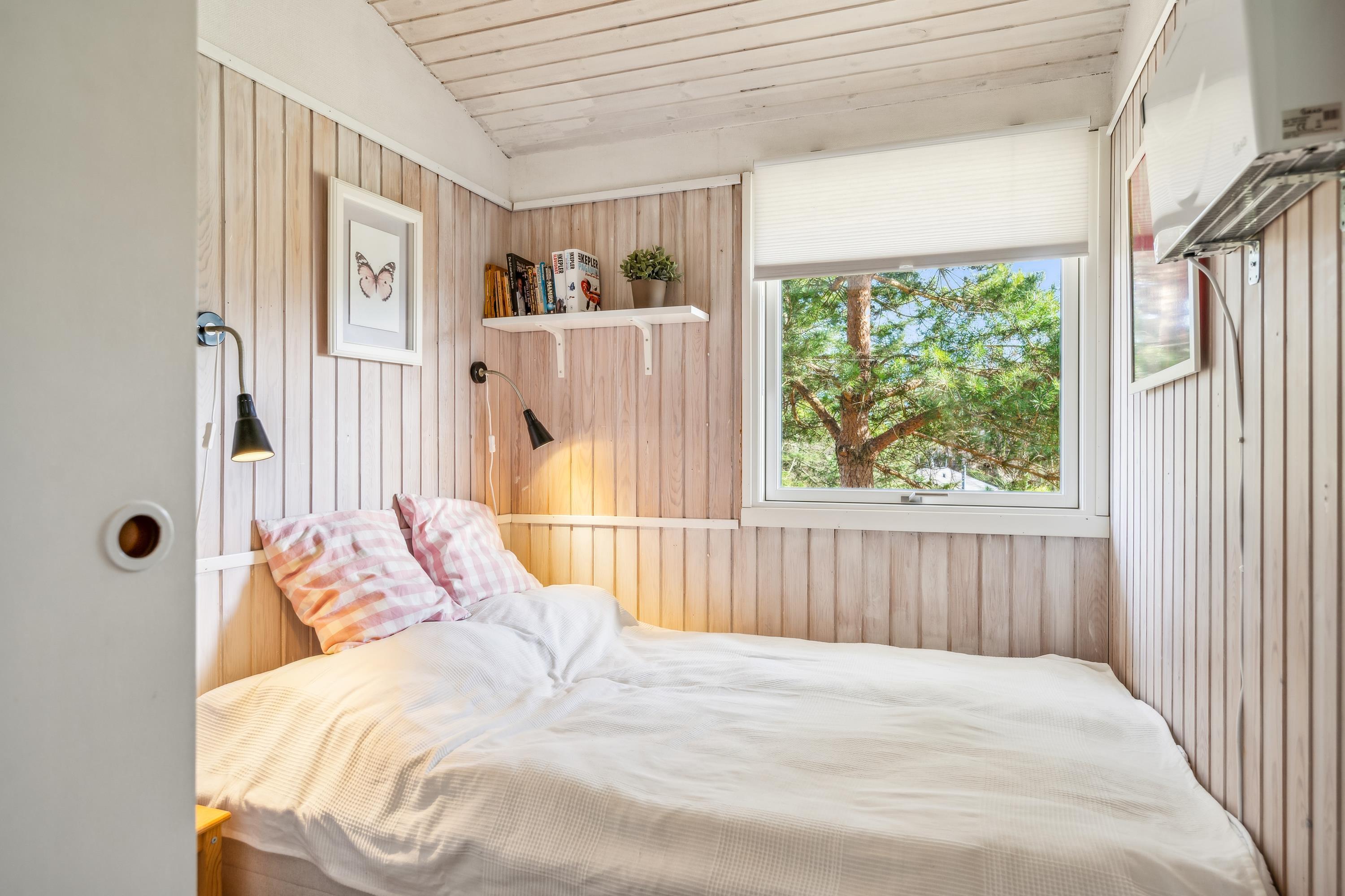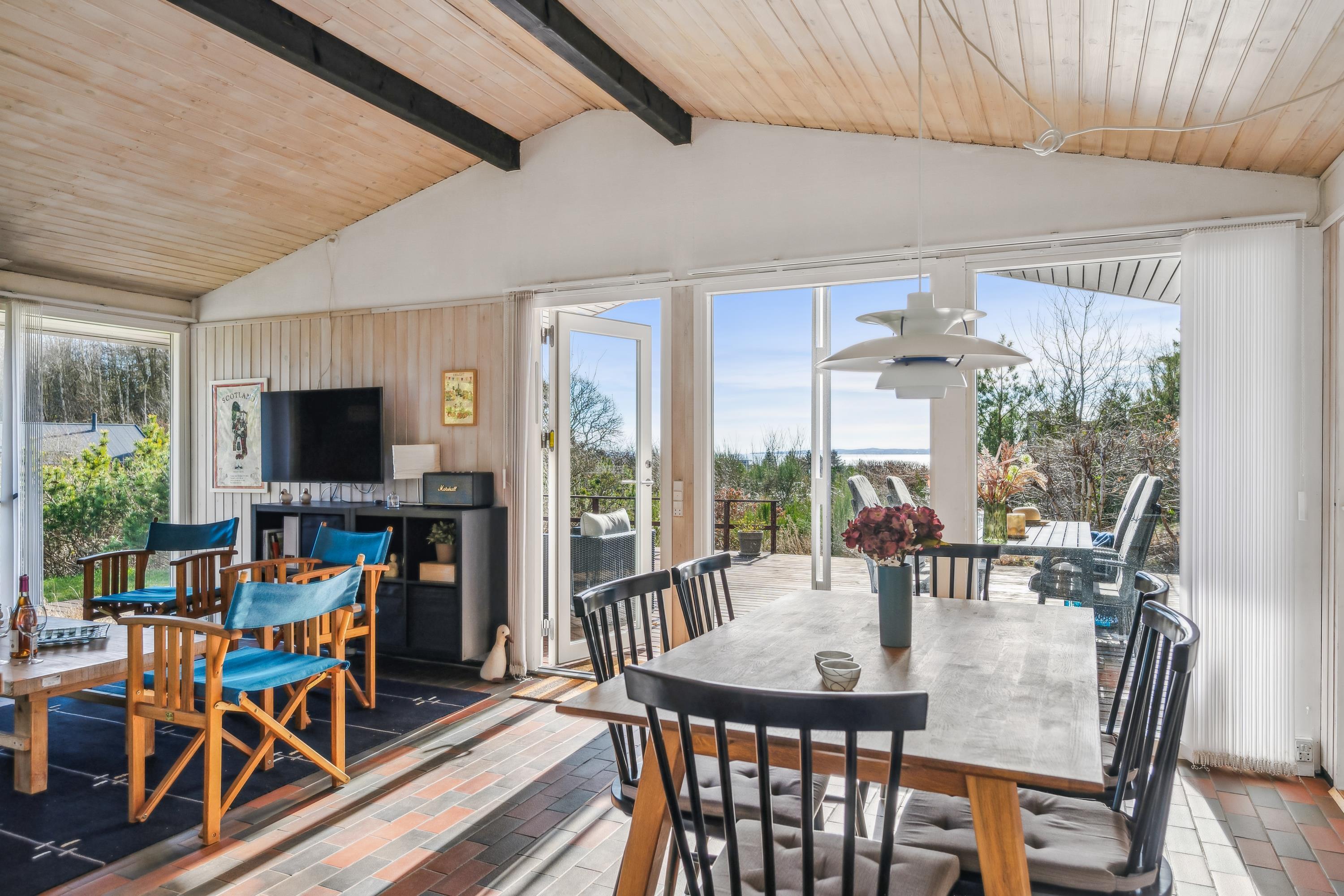 Velkommen til dette "rigtige" sommerhus højt beliggende på en skrående grund med en fantastisk udsigt over området og til vandet. Her finder man en hyggelig og velmøbleret stue med b.la. varmepumpe og en pejs samt udgang til både overdækket og åben terrasse med gode havemøbler. I forbindelse med stuen finder man det veludstyrede køkken med b.la. opvaskemaskine og hvorfra der er udgang til endnu en terrasse med havemøbler. Dejligt badeværelse med bruseniche og gulvvarme. Husets sovepladser finder man i husets 4 soveværelser, heraf to værelser med dobbeltsenge, et værelse med en køjeseng til to personer og et værelse med en mindre køjeseng til et barn. I huset findes både danske, tyske og nordiske tv kanaler. Til den lille feriegæst er der en høj stol til rådighed.