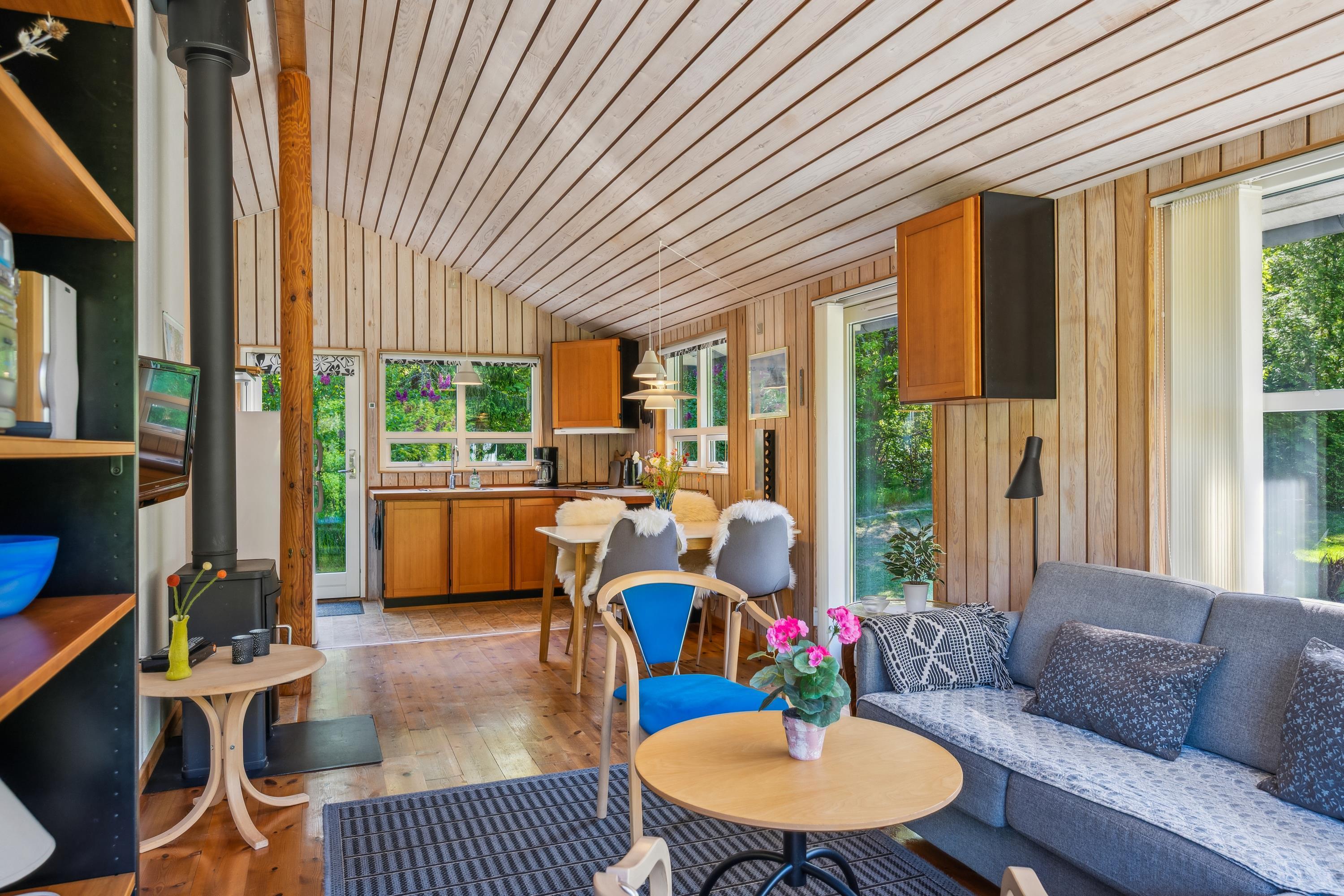 Hyggeligt sommerhus i Handrup Bakker med naturgrund, terrasse, brændeovn og moderne faciliteter.