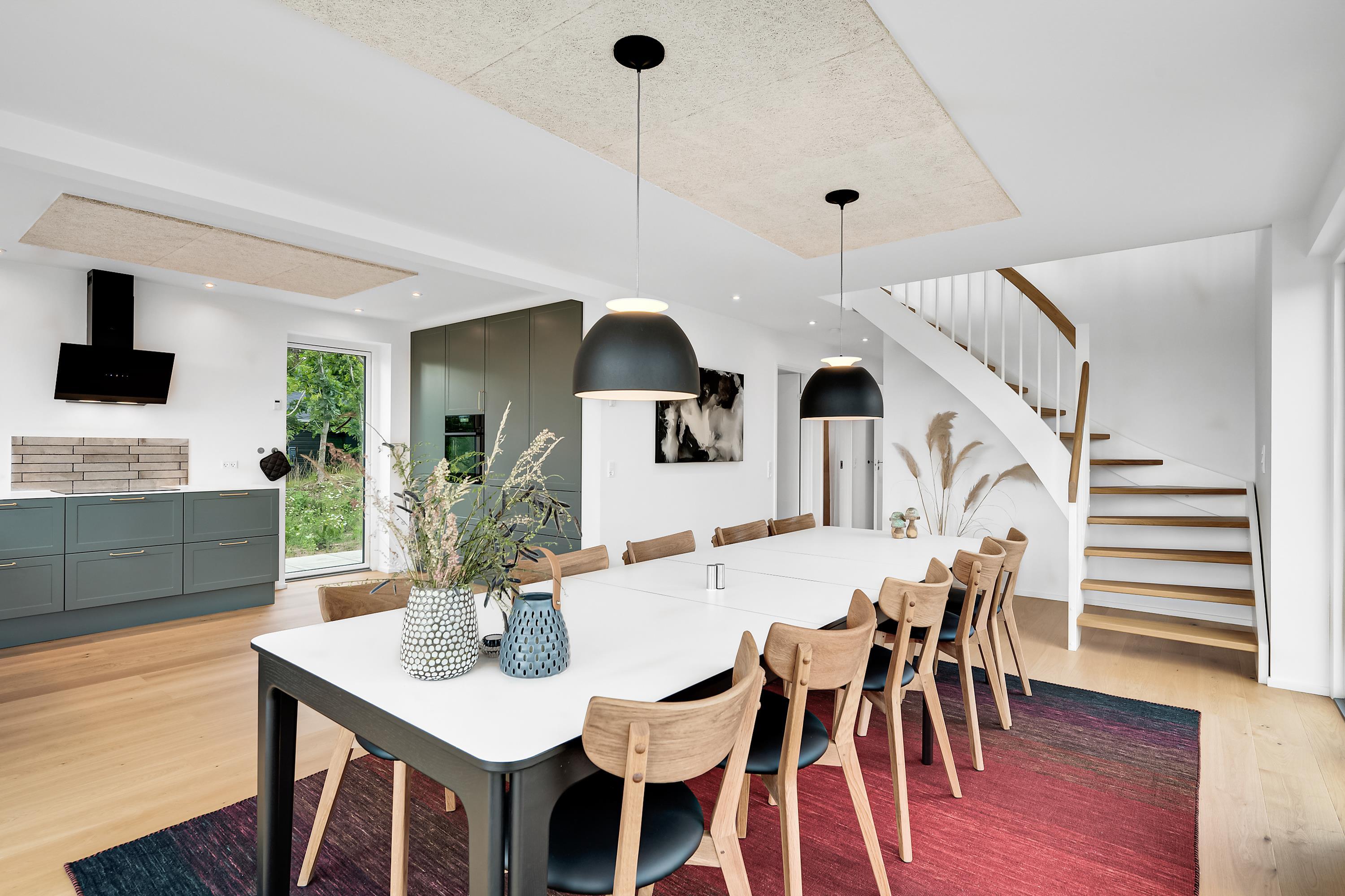 Tæt på Nationalpark Mols Bjerge og blot 10 min kørsel fra Ebeltoft, finder man dette flotte nyopførte sommerhus, beliggende på en skrånende grund. Huset som er i to plan, er smagsfuld indrettet og inderholder i stueetagen en dejlig entre med plads til sko og overtøj. Virkelig lækkert køkken med b.la. opvaskemaskine og køle/fryseskab samt en stor spiseafdeling. Herfra er der udgang til de skønne terrasser med havemøbler, liggestole og parasol. I underetagen finder man også to af husets soveværelser samt et flot badeværelse med bruseniche og gulvvarme. Her er desuden gæstetoilet, hvor der er adgang til vaskemaskine og tørretumbler. Flot trappe til 1 salen, hvor man finder den skønne opholdsstue med TV og hvorfra man har den smukkeste udsigt over vigen og Mols Bjerge. På første salen finder man også husets sidste to værelser. TV foregår pt via chromecast . Udendørs findes der en bruser. Huset er beliggende på en skrående grund med græsplæne foran huset, som er velegnet til leg og boldspil.
