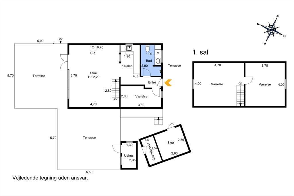 Stemningen i dette skønne feriehus er helt unik – her er der tænkt over hver eneste detalje. Huset er lyst og venligt med smukke, synlige bjælker og hanebånd, der tilføjer en charmerende atmosfære. Indretningen kombinerer hygge og stilren elegance, så du straks føler dig hjemme. Du bliver budt velkommen i en entre, der fører videre til det hyggelige køkken med halvmur til spisehjørnet. Herfra er der åbent til den skønne stue med brændeovn, stort vinduesparti og direkte udgang til den dejligste solterrasse. Stueetagen rummer også et pænt badeværelse med bruseniche og vaskemaskine samt et charmerende soveværelse med dobbeltseng. Fra stuen fører en trappe til 1. sal, hvor du finder yderligere to fine soveværelser – det ene med dobbeltseng og det andet med to enkeltsenge, der kan skubbes sammen