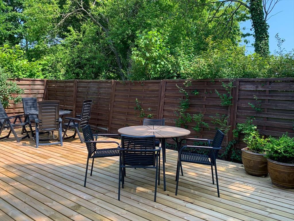 Huset ligger på en smuk grund med en stor græsplæne og fine terrassearealer, hvor du kan nyde både solen og den betagende udsigt til vandet lige på den anden side af vejen. Uanset om solen skinner eller regnen falder, er der mulighed for at grille og nyde måltiderne udendørs – under halvtaget på bagsiden af huset kan man finde læ. Her er masser af plads til leg og afslapning i den friske luft.
