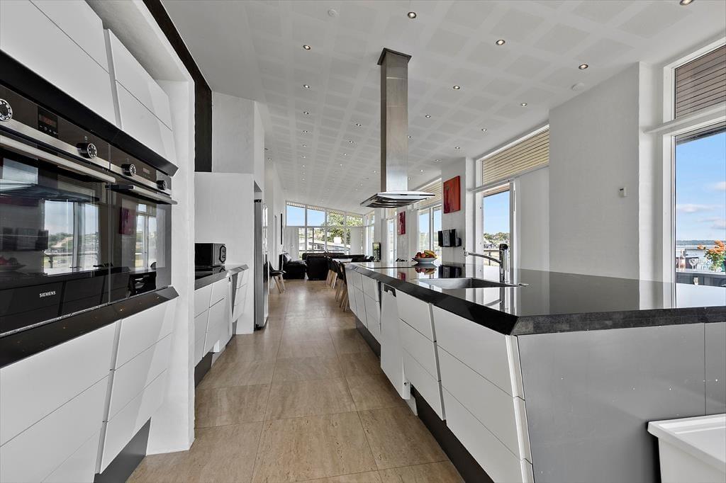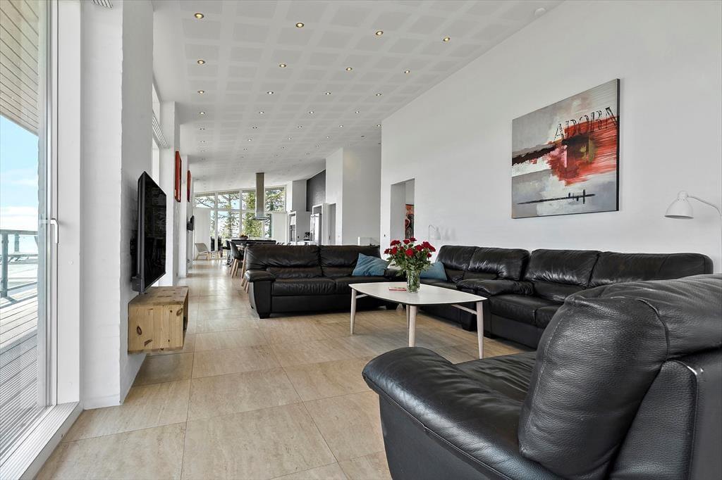 Du bliver mødt af en lys og venlig atmosfære, hvor store vinduer trækker havet helt ind i stuen. Det åbne opholdsrum samler køkken, spiseplads og sofahjørne i ét, så I kan nyde ferien sammen – uanset om I laver mad, spiller spil eller bare slapper af. Her er brændeovn til de kølige aftener og direkte udgang til terrassen, når solen skinner.