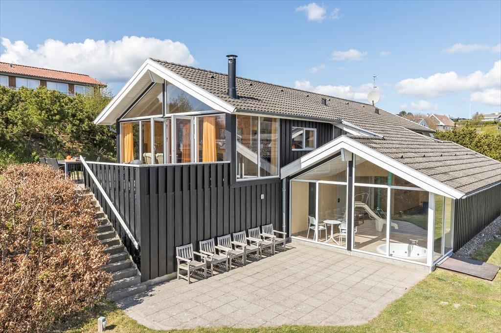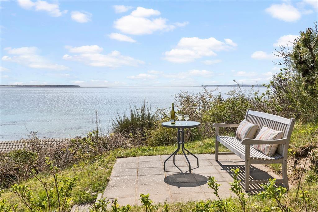 Huset har en stort flot terrasse med fine havemøbler og grill. Så her gælder det om at finde den bedste krog, at nyde udsigten fra og når vejret tillader det, kan middagen nydes udenfor. Her er der mulighed for at slappe af og spise sammen med familien, mens både morgen og aftensolen passerer forbi den smukkeste udsigt over Ebeltoft Vig.