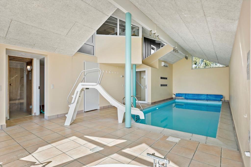 I underste etage ligger en wellness afdeling med en 26 m2 stor swimmingpool incl. Svømmetræner og rutsjebane en meget stor spa, bruser og direkte adgang til saunaen. Så her kan der slappes af eller leges, mulighederne for at forkæle sig selv er store.