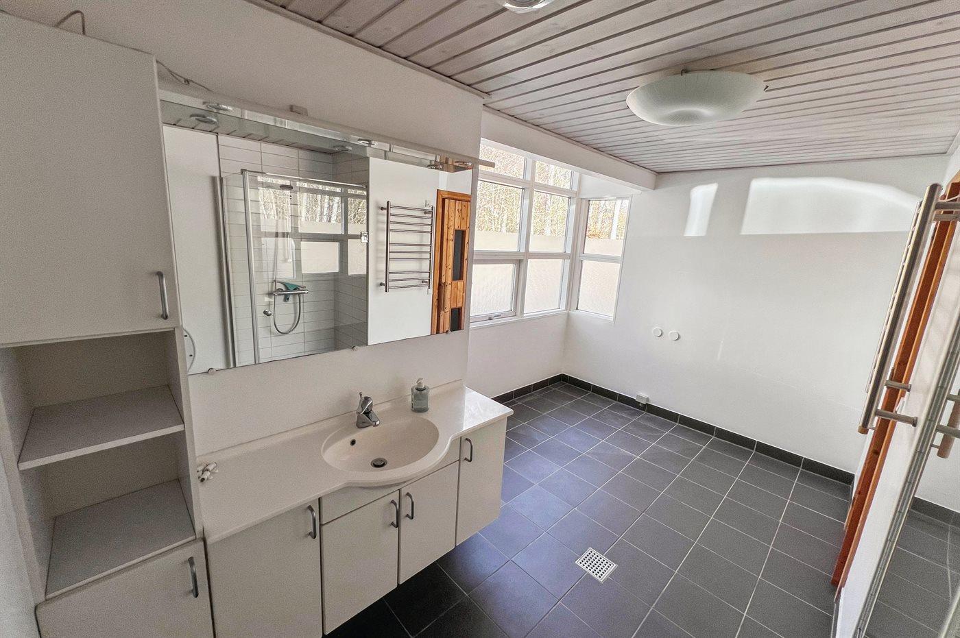 Der er 2 badeværelser med bruseniche og 2 toiletter. Der er gulvvarme på 2 badeværelser. I saunaen er der mulighed for afslapning.