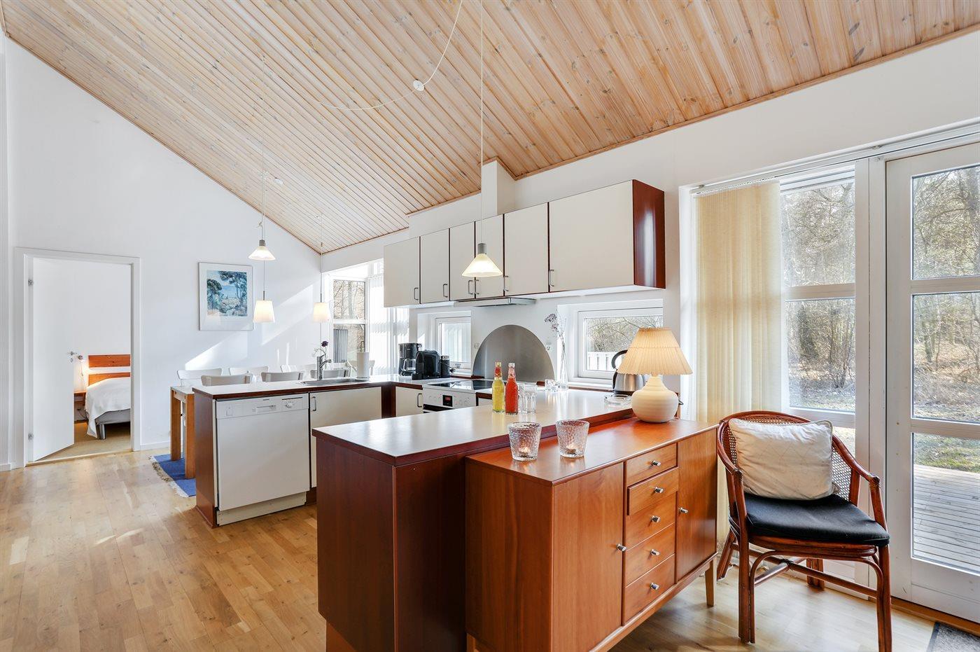 Køkkenet er udstyret med 1 køleskab. Der er 4 keramiske kogeplader, varmluftovn, mikrobølgeovn samt opvaskemaskine.