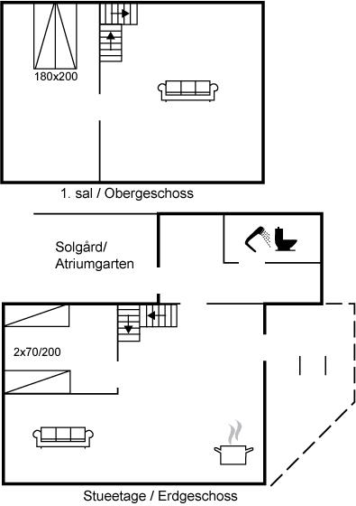 Der er i alt 2 soveværelser. Sovepladserne fordeler sig på: 2 sovepladser i dobbeltseng. 2 sovepladser i enkeltsenge. Derudover er der 1 stk. barneseng.