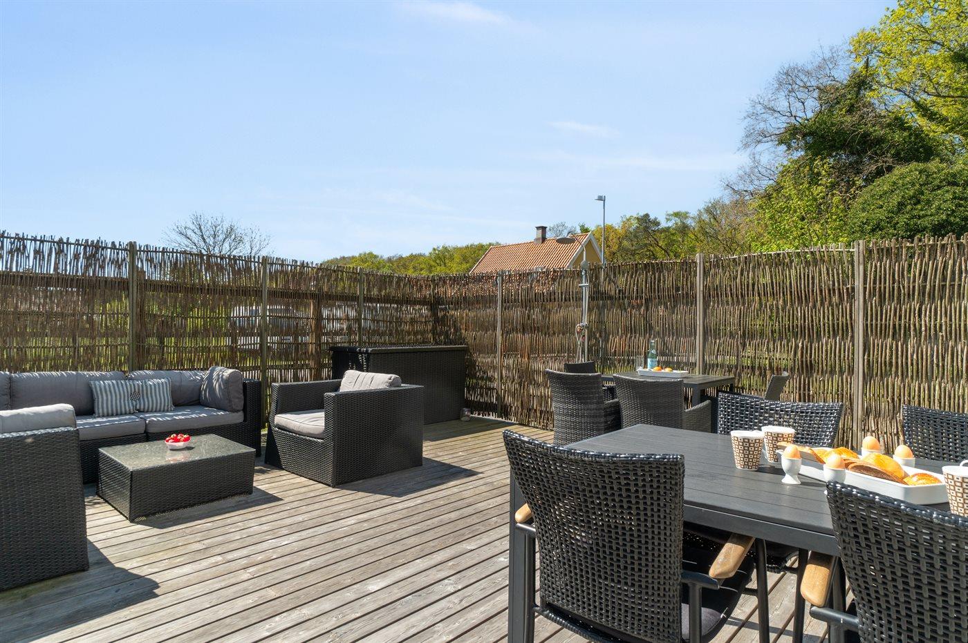 Stor afskærmet terrasse med direkte udgang fra stue og adgang til plænen foran huset suppleres med stor terrasse på 1. sal - delvis overdækket - giver mulighed for ugeneret at nyde solen eller hinandens selskab, når der grilles og hygges.