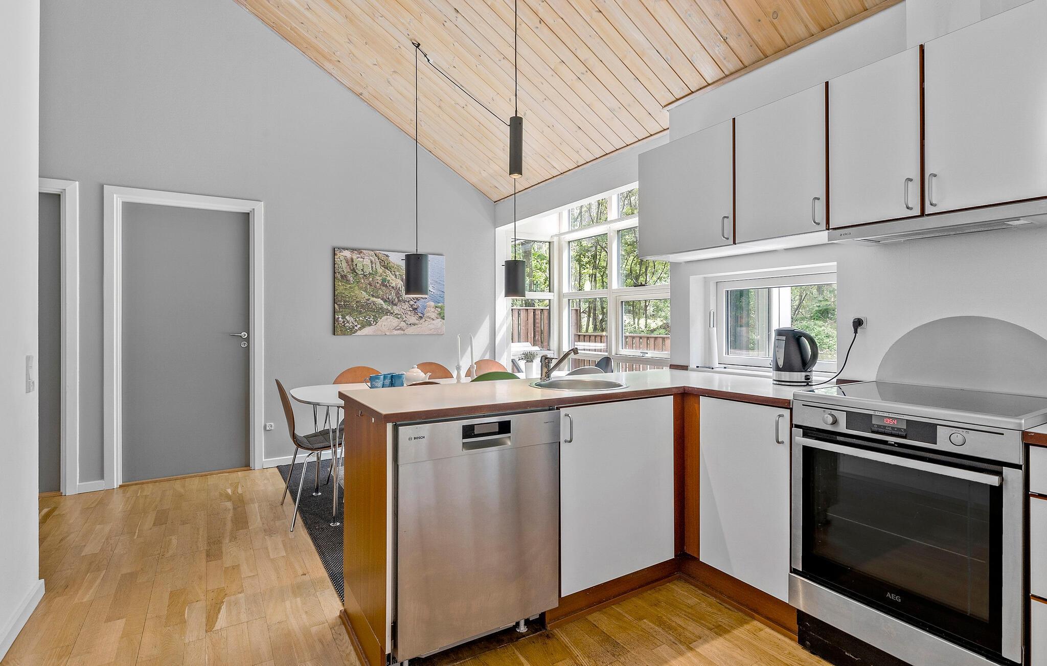 Velkommen til dette velindrettede og charmerende hus, der ligger i fredelige, grønne omgivelser tæt på Hasle og danner en vidunderlig ramme om årets familieferie. Indvendigt emmer det af kvalitet over hele linjen med loft til kip, velholdte trælofter- og gulve og masser af vinduespartier, der giver lækre lysindfald og en dejlig udsigt til det grønne. Skulle vinden bide lidt fra sig, kan I fyre op i brændeovnen og nyde dens knitrende varme til en hyggelig aftensmad ved spisebordet og en god film i sofaen. På badeværelset er der et skønt spabad og sauna, så I kan fordøje dagens mange indtryk og give musklerne et velfortjent hvil. Både badeværelset og gæstetoilet har gulvvarme.