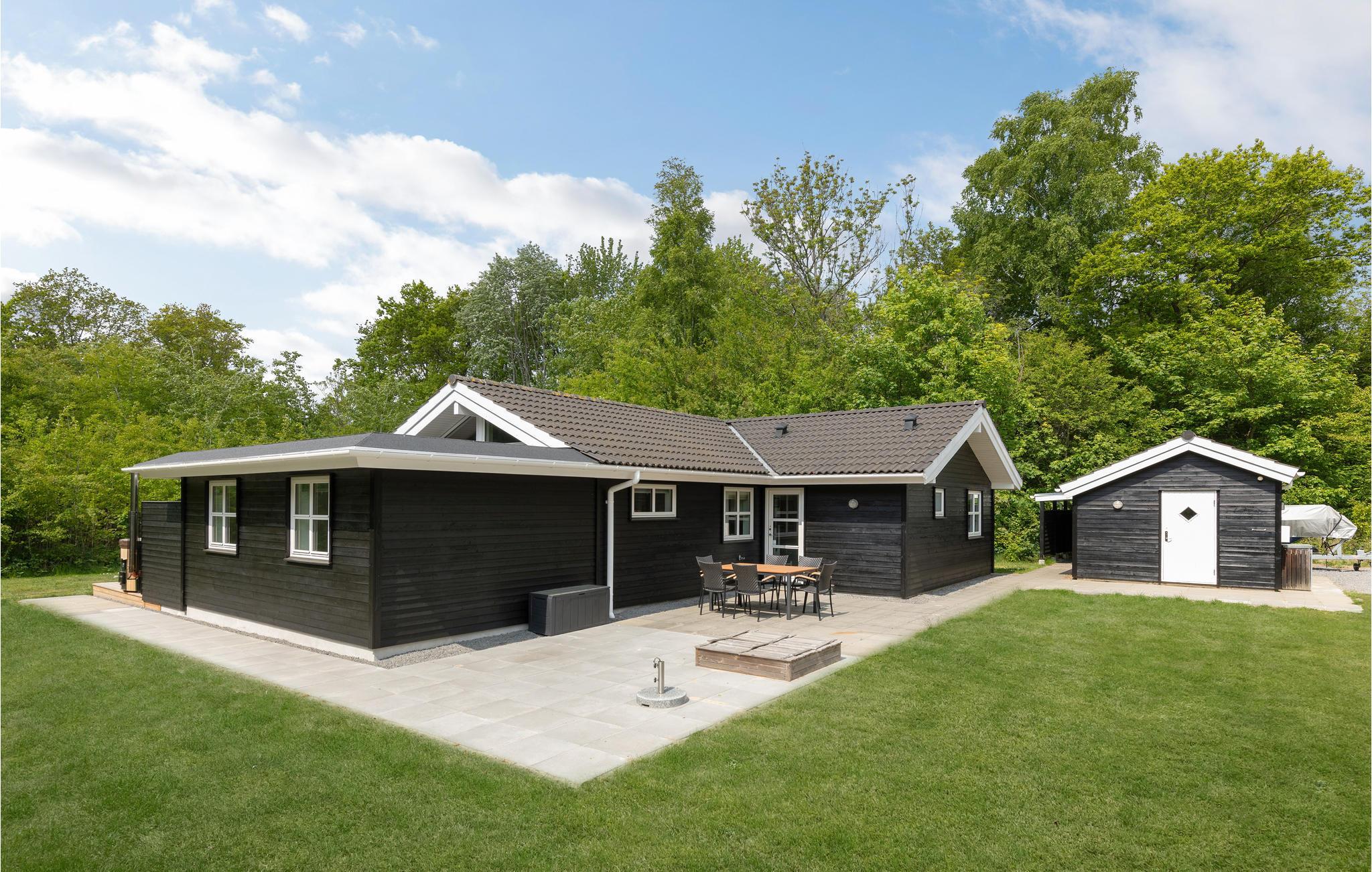Flot og moderne sommerhus i Hasle Lystskov med vildmarksbad, stor terrasse og tæt på strand i naturskønne omgivelser.