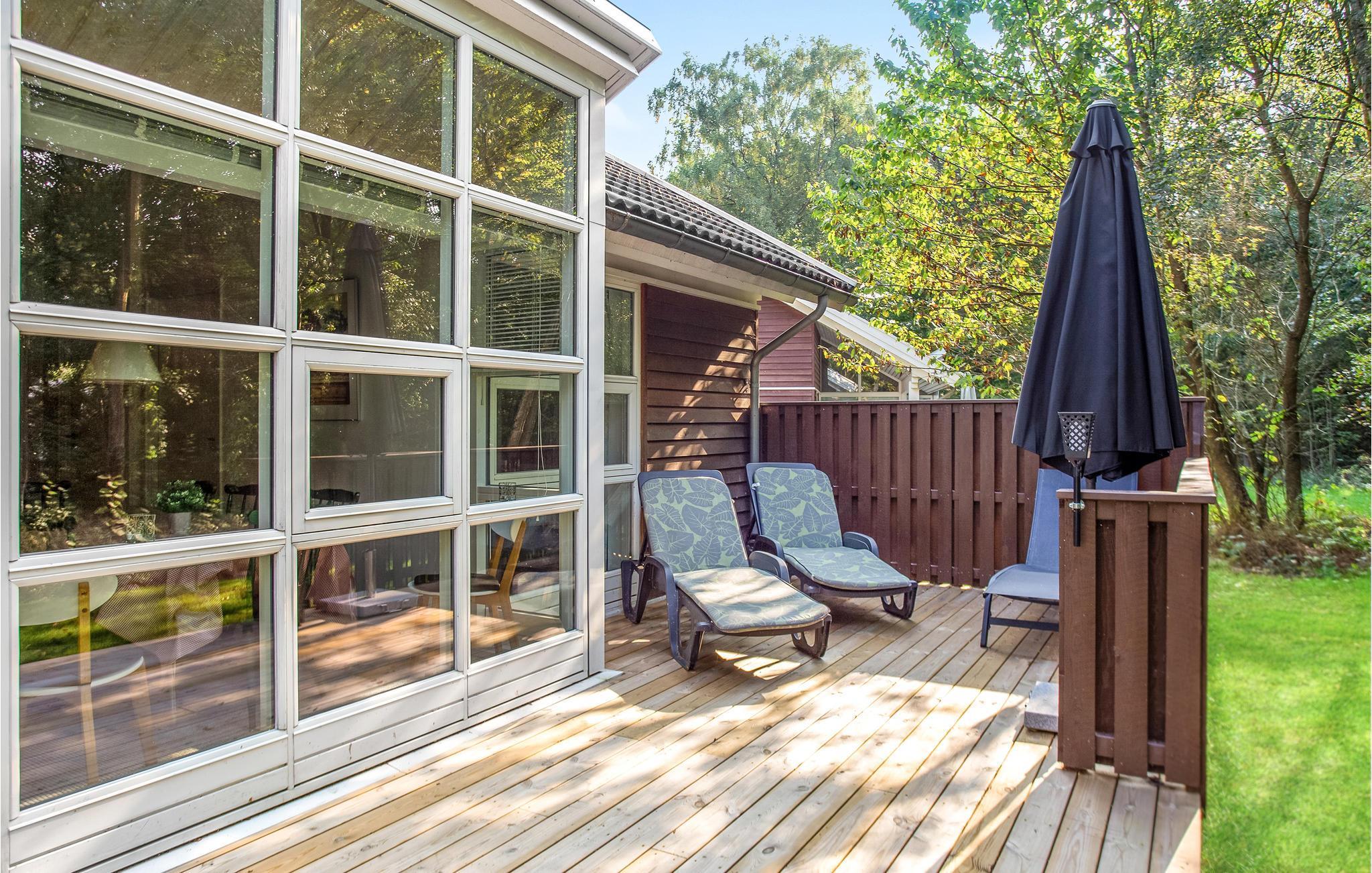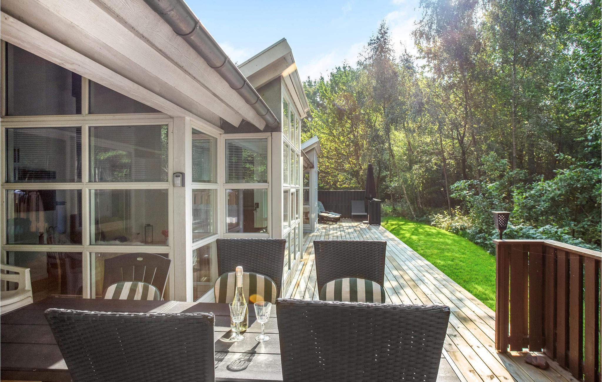 Læn jer tilbage på terrassen og nyd udsigten. Skoven ligger bag huset.