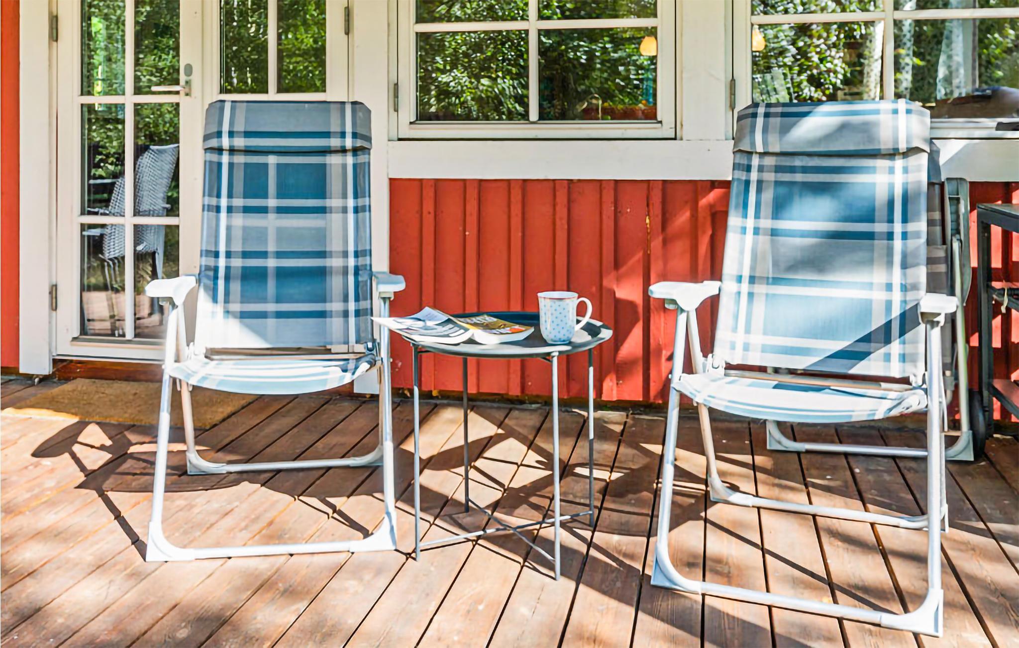 Hyggeligt sommerhus i træ nær børnevenlig strand og Hasle med terrasse, brændeovn og gratis WiFi.
