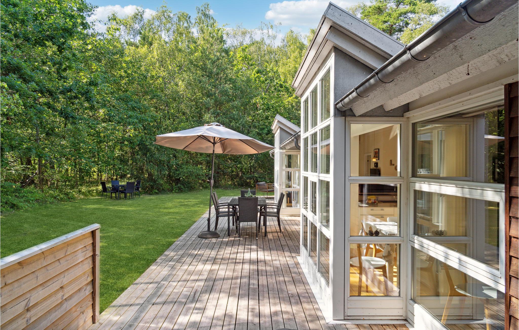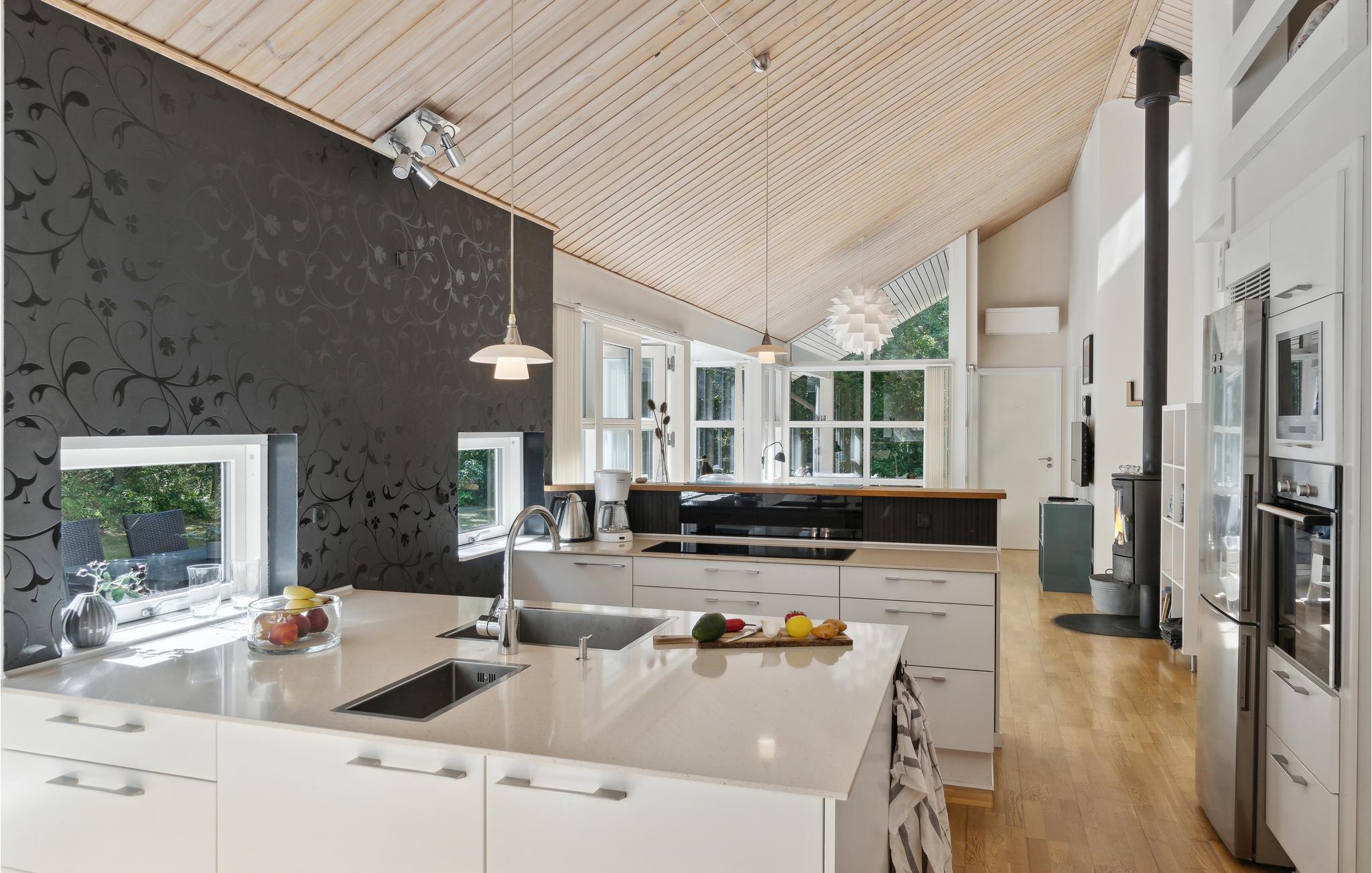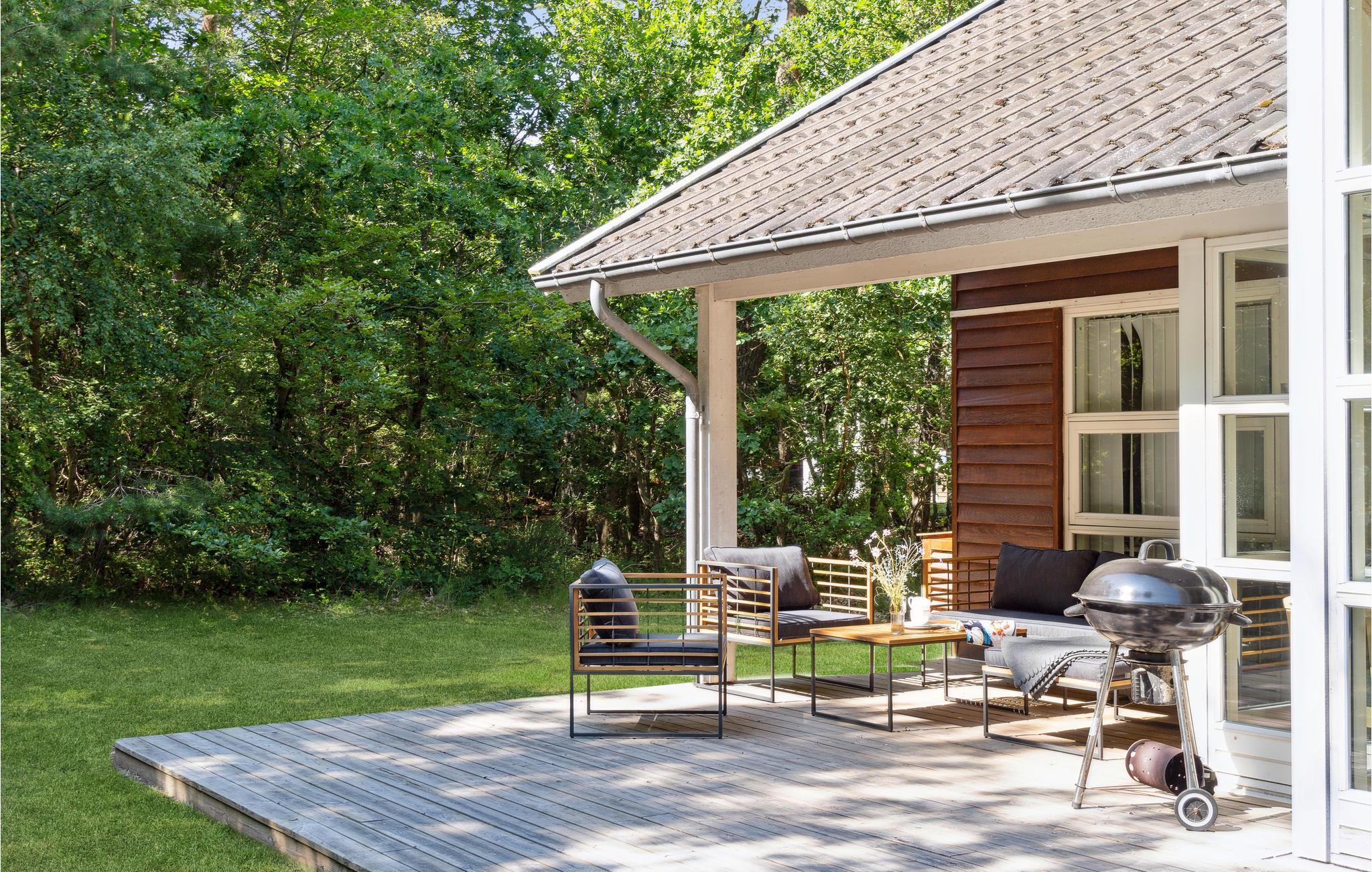 Moderne og indbydende kvalitetssommerhus med mange flotte detaljer og masser af plads. Huset er rummeligt, og fremtræder overalt velindrettet og er beliggende i et større og meget børnevenligt sommerhusområde nær skov og strand. Huset byder på en dejlig stor opholdsstue med nydelige møbler, brændeovn og varmepumpe, og her er naturligvis også gratis wifi til rådighed samt fire fjernsyn. I det flotte og moderne, åbne køkken er det en leg at tilberede de mange feriemåltider, og den hyggelige spisestue, med udsigt til naturen lige udenfor, er også et rart sted at sidde. Dejligt luksusbadeværelse med spabad og sauna, et pænt gæstetoilet og tre gode soveværelser er også med til at øge ferieoplevelsen. Fra husets åbne stueareal har I direkte udgang til en skøn og rummelig træterrasse med dejlige havemøbler og en grill, her er god plads til mange afslappende feriestunder med familie og venner. Dette kvalitetssommerhus er med de mange moderne faciliteter og høje komfort velegnet til skønne ferieophold uanset årstid.