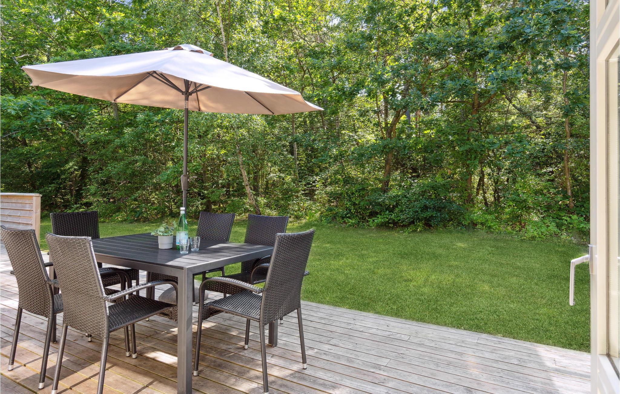 Moderne sommerhus nær skov og strand med sauna, spabad, brændeovn og stor terrasse.