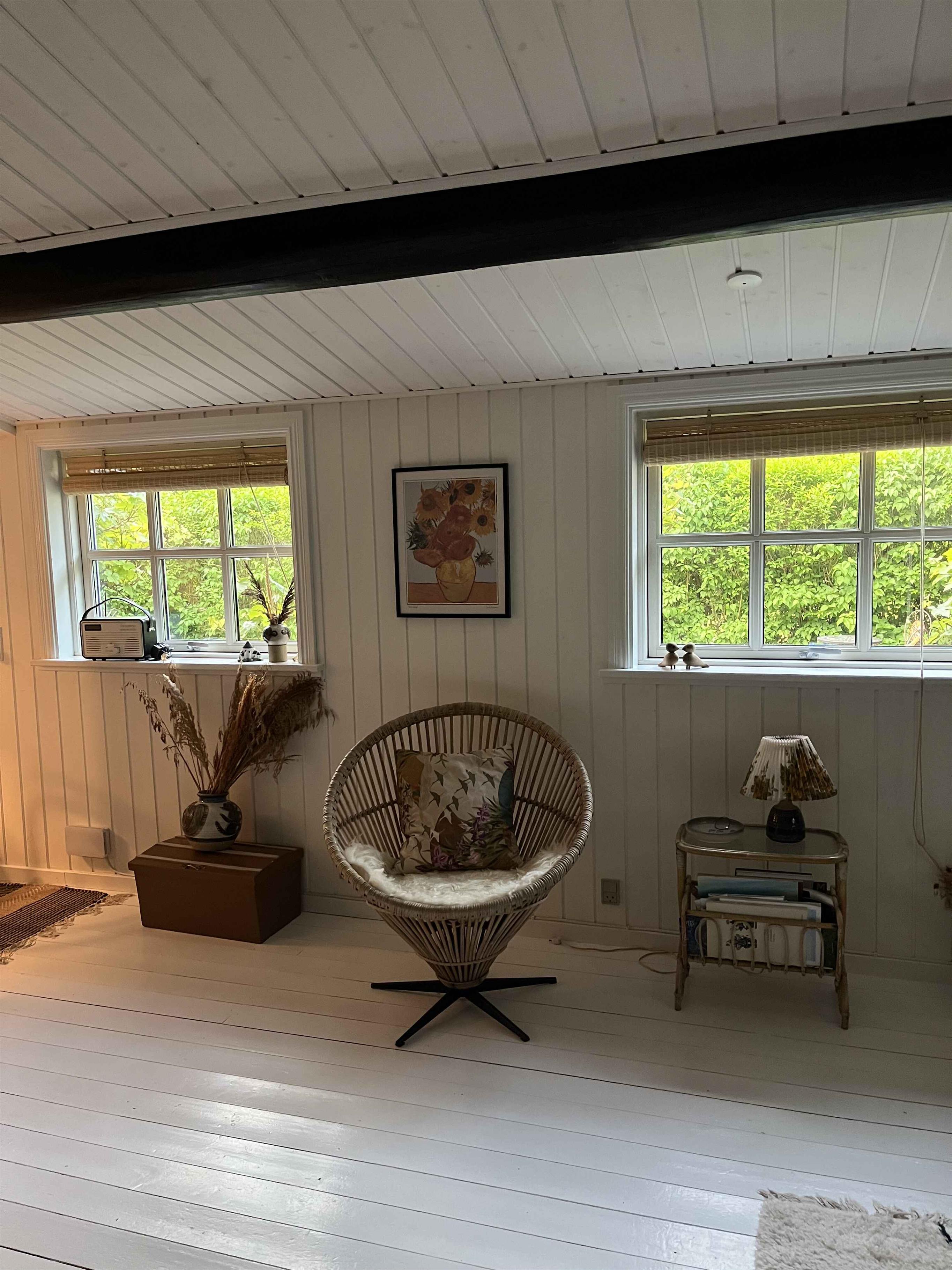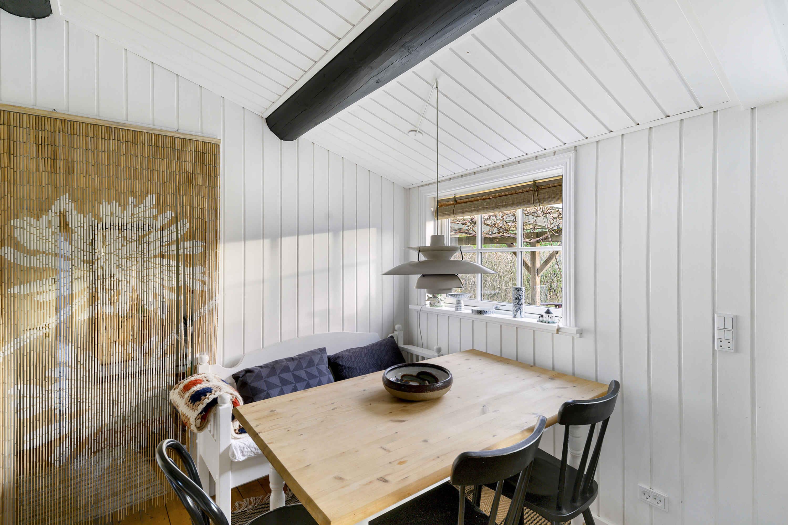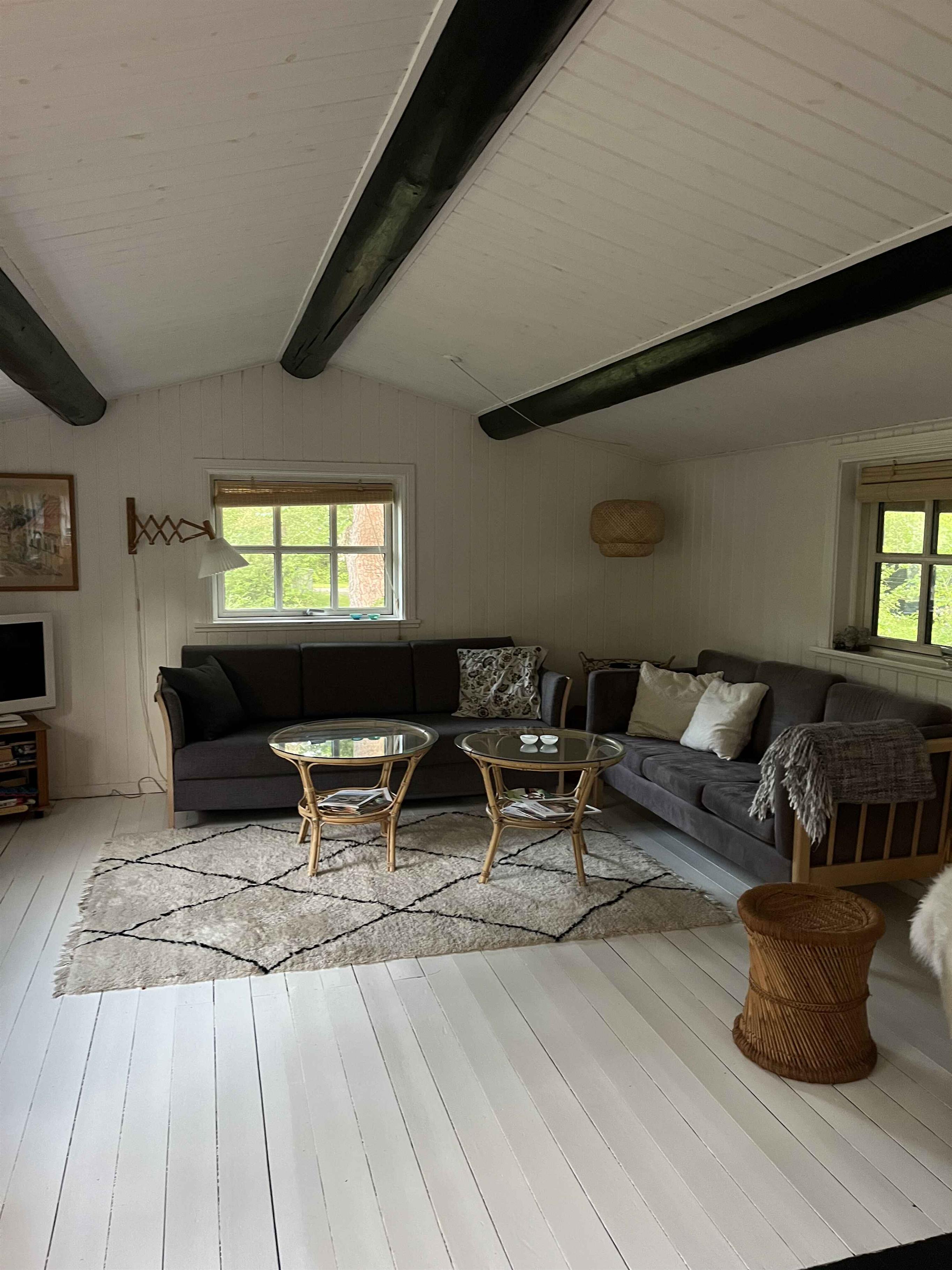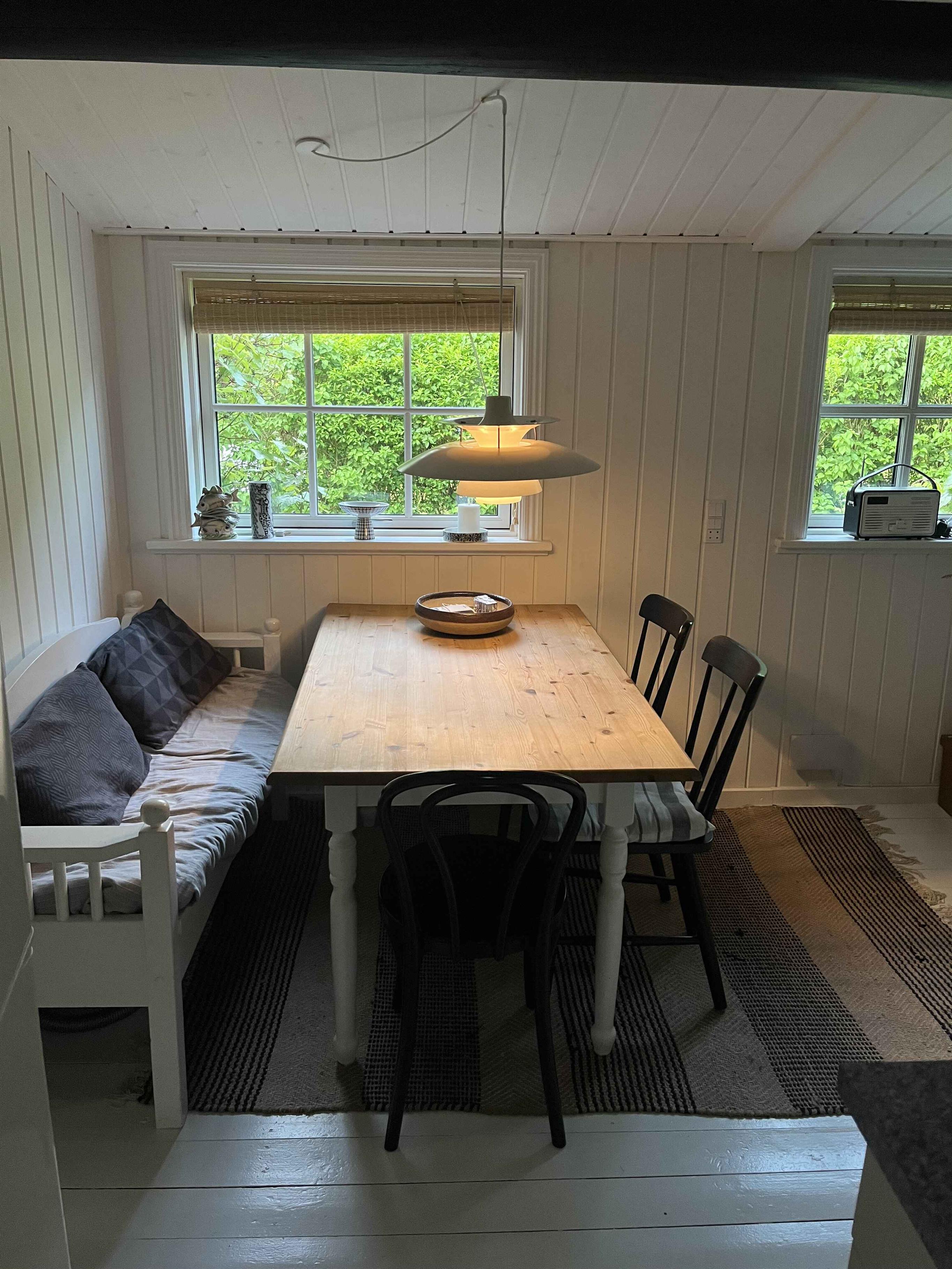 Hyggeligt og autentisk sommerhus i gåafstand til skov og strand. Huset er 60 kvm med tilhørende anneks på 12 kvm. Det ligger i et skønt område i Hasle Lystskov tæt på Rubinsøen og med kun 400 meter til stranden med kultippen som er et fantastisk månelandskab. I kan også nemt gå til det hyggelige Hasle Røgeri som er det eneste røgeri på Bornholm, der stadig ryger efter den gamle metode. Derudover byder Hasle på et hyggeligt havnemiljø med skønt havnebad. Har man mindre børn med, er der 300 meters gang til vandlandet på campingpladsen. Huset har overdækket terrasse med varmelampe i en lille atrium have, hvor man er helt ugeneret. Selve grunden er 1200 kvm, så der er en stor have rundt om huset, hvor der er en stor trampolin og masser af plads til leg. I skuret kan I finde forskellige legeting og på terrassen står et bordfodboldspil. Der er også bålfad til aftenhyggen. Der er både havemøbler i den lille og den store have, og i skuret står diverse solstole. På terrassen er der gasgrill. Huset består af en stor stue, køkken, badeværelse og soveværelse. Det andet soveværelse er annekset som ligger vinkelret med huset. Der er to sengepladser i soveværelset i en lille dobbelt seng og 2 sengepladser i stuen, hvor der er en stor og god sovesofa. I annekset er der også 2 sengepladser i alm. dobbeltseng og en sovestol, der kan foldes ud til madras og kan placeres, hvor i huset man ønsker det. Derudover står der en gæsteseng i skuret. Der er ikke døre i hovedhuset på nær til toilettet. Soveværelset adskilles af et tykt velourgardin, og entre og køkken kan adskilles af et bambus dørforhæng. I de køligere måneder varmes huset op med varmepumpe og/eller brændeovn. Der er el-radiator i soveværelset og i annekset. På badeværelset er der endvidere både varmeblæser og gulvvarme. Der er mobilt bredbånd og tv'et har chromecast, så man kan caste de tv-kanaler og streamingtjenester man selv har på sine devises. I garagen står 4 cykler man er velkommen til at benytte. Det skal nævnes, at huset nu er sortmalet ligesom gulvene er hvidmalet på nær entreen.