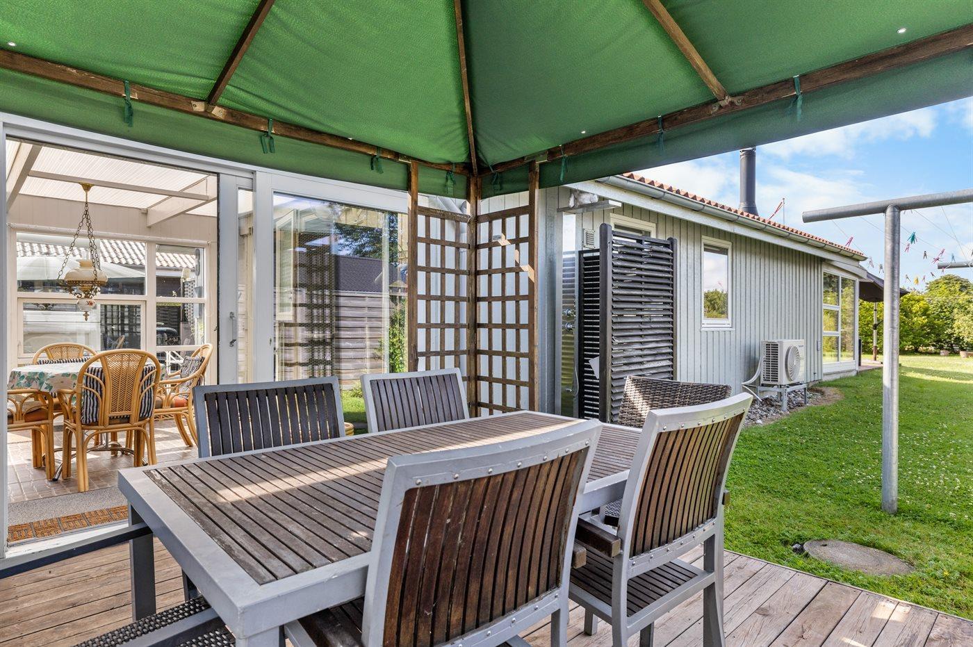 Hyggeligt sommerhus ved Hasmark med stor udestue og skøn sydvendt have med aktiviteter.