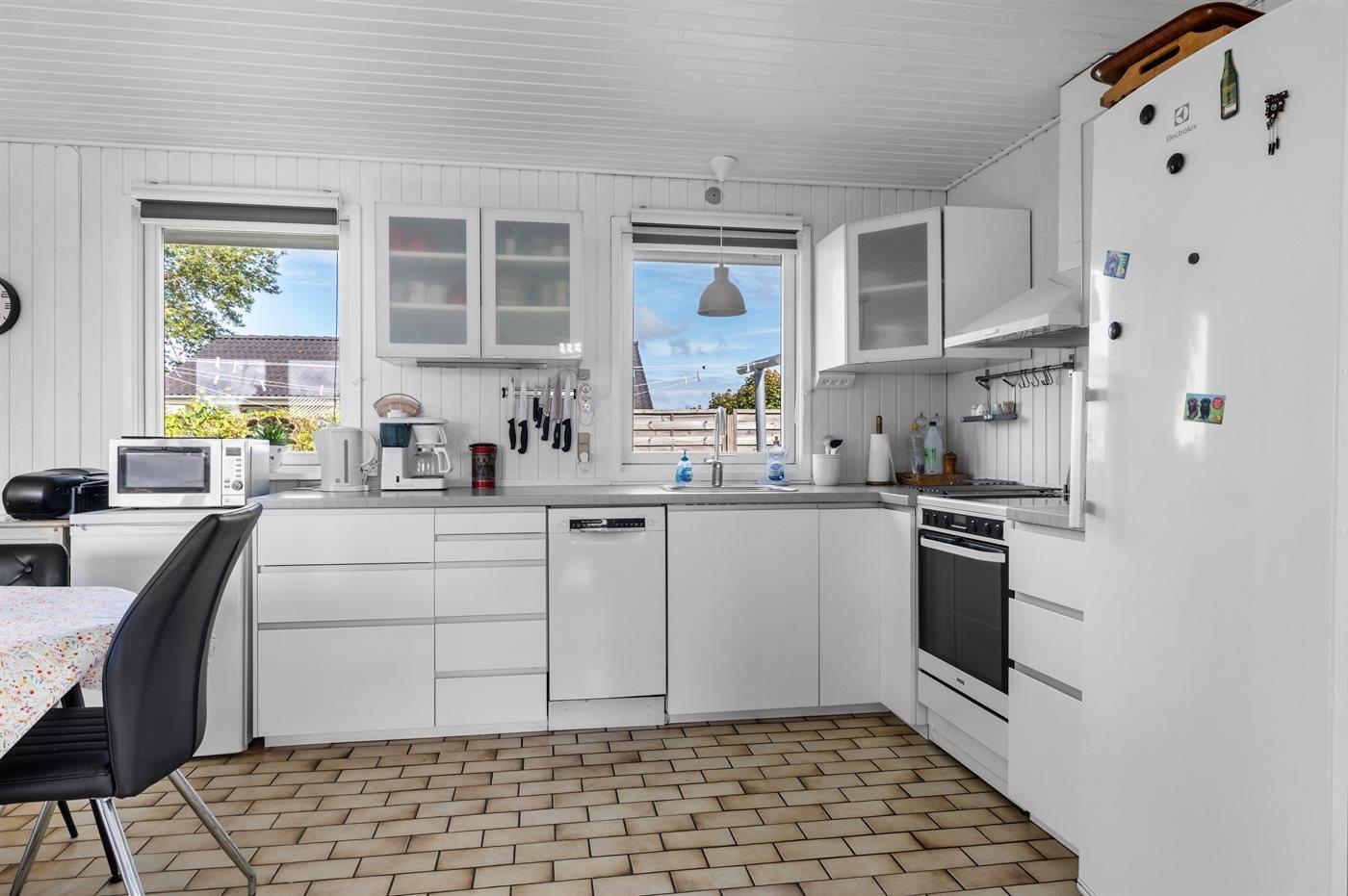 Køkkenet er udstyret med 1 køleskab. Der er 4 keramiske kogeplader, varmluftovn, mikrobølgeovn, Airfryer samt opvaskemaskine.