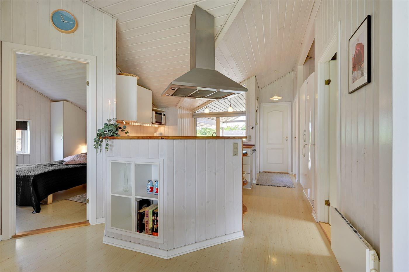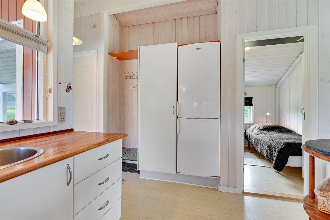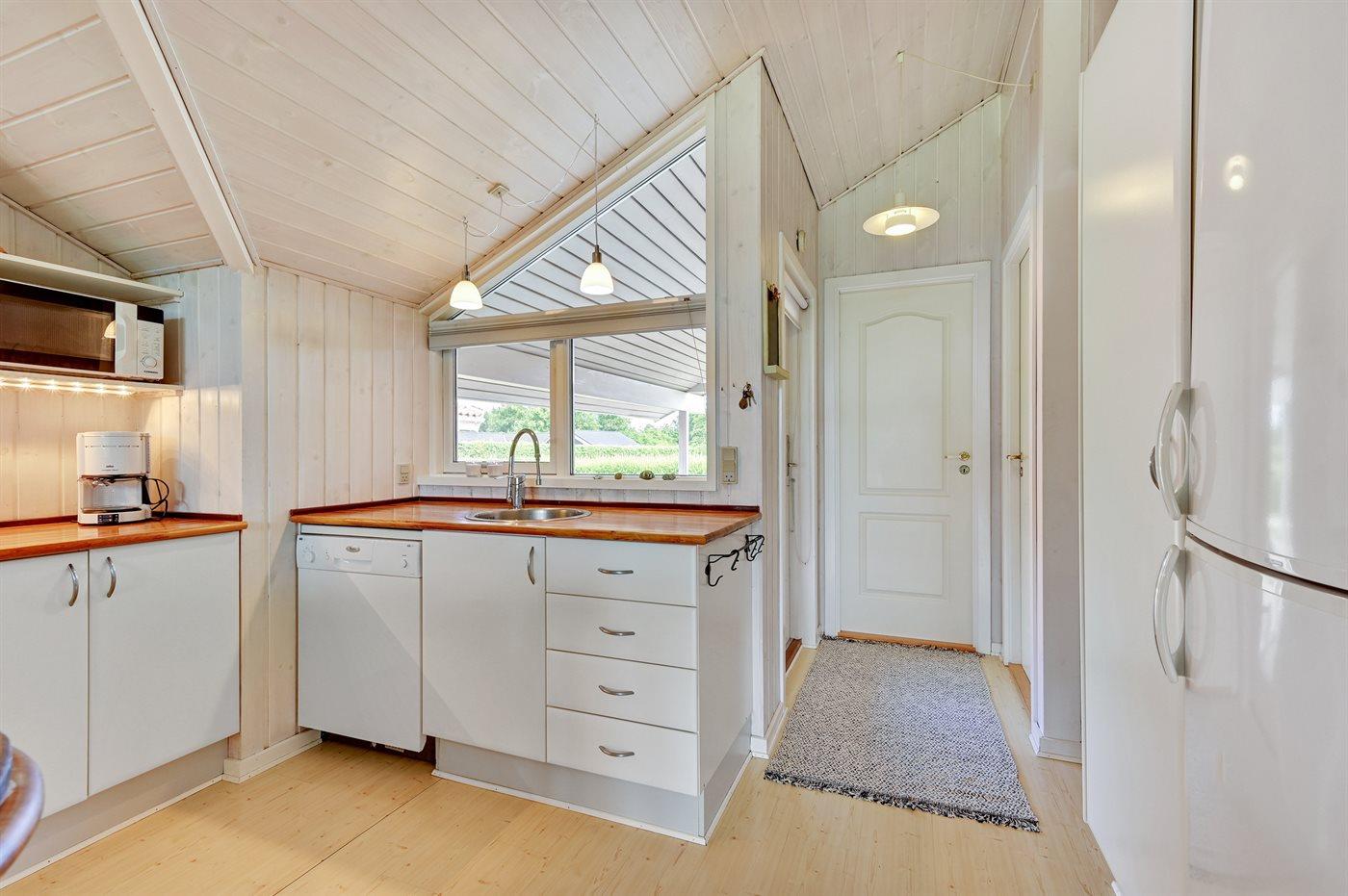 Køkkenet er udstyret med 1 køleskab. Der er 4 keramiske kogeplader, varmluftovn, mikrobølgeovn samt opvaskemaskine.