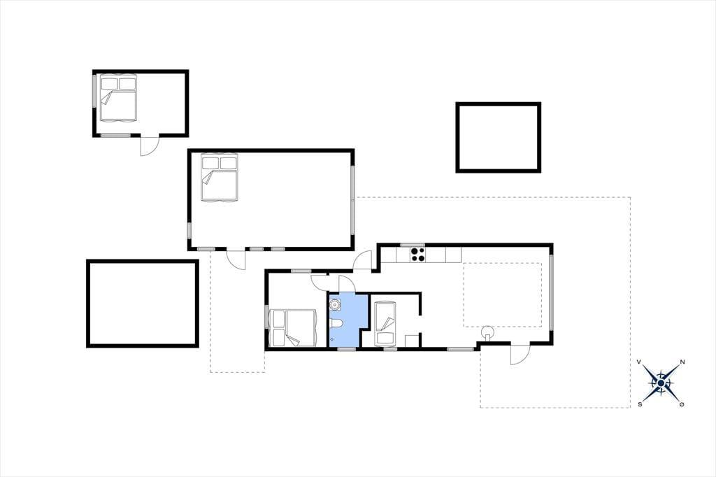 Huset er beliggende direkte ved familievenlig badestrand og indeholder opholdstue med brændeovn og fantastisk udsigt over vandet og udgang til træterrasse. Det praktiske køkken er placeret i direkte forbindelse med stuen. Der er en lille kombi-Mikro-ovn. Hovedhuset indeholder envidere soveværelse med dobbeltsenge samt badeværelse med brusser. Det store anneks er udstyret med dobbeltsenge, bordfodbold og ekstra tv mens det lidt mindre anneks indeholder dobbeltseng.