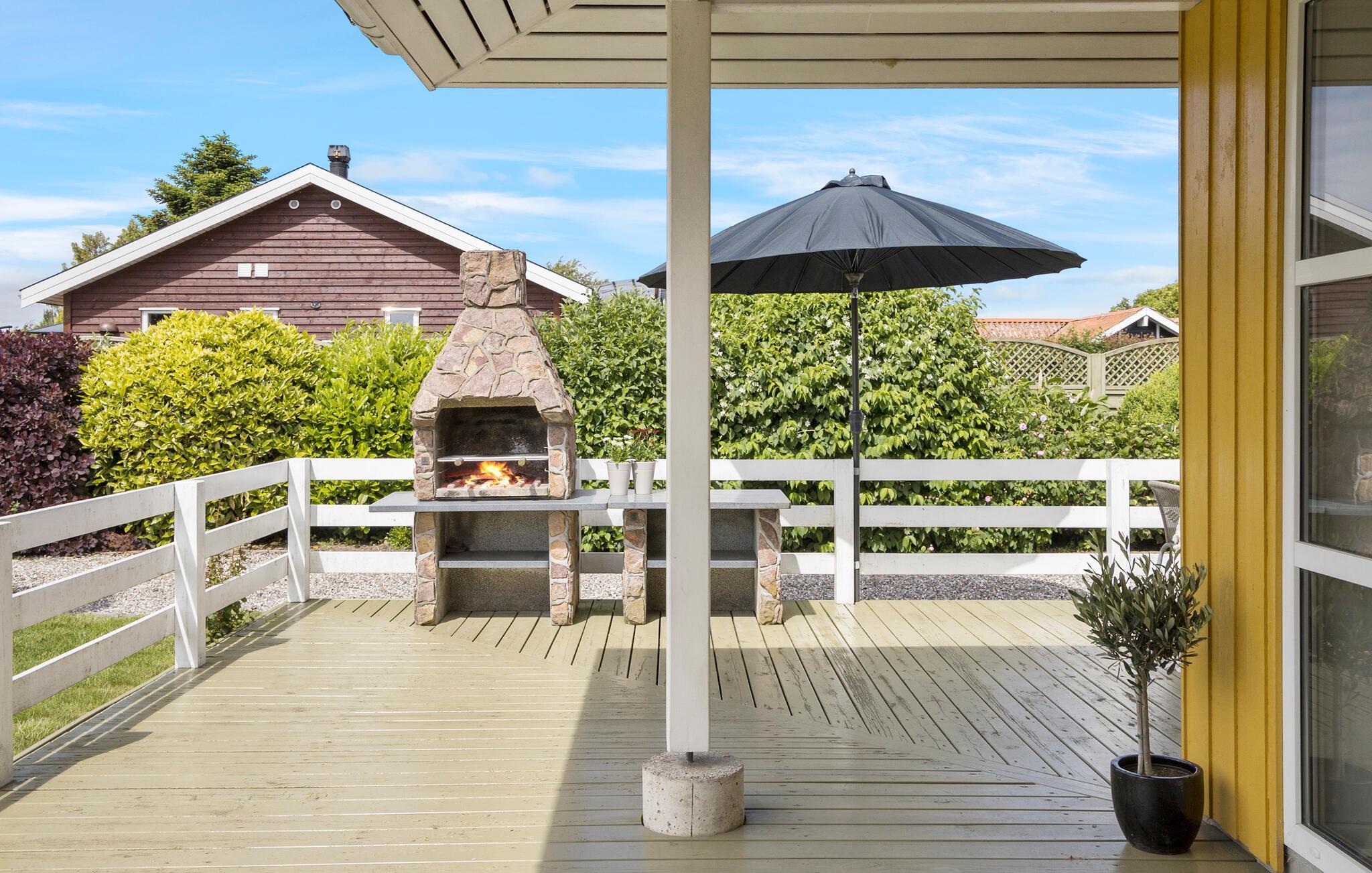 Til huset hører en delvist overdækket terrasse, hvor I kan finde sol og skygge efter behov på de varme dage. Her finder I også både gas- og udendørsgrill, hvor I kan tilberede lækre bøffer under aftensolen. Haven byder på masser af plads til leg og boldspil for alle aldre.