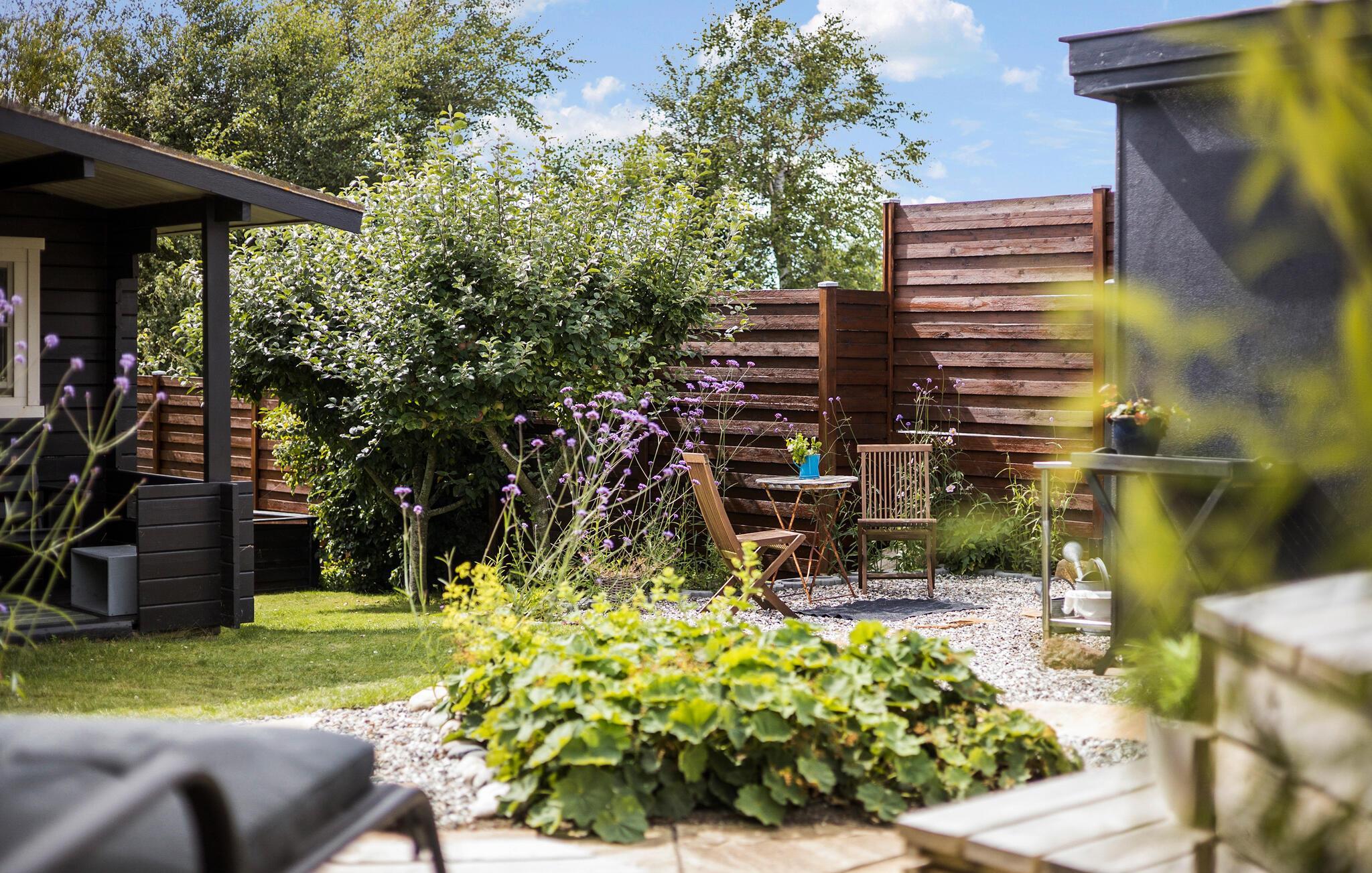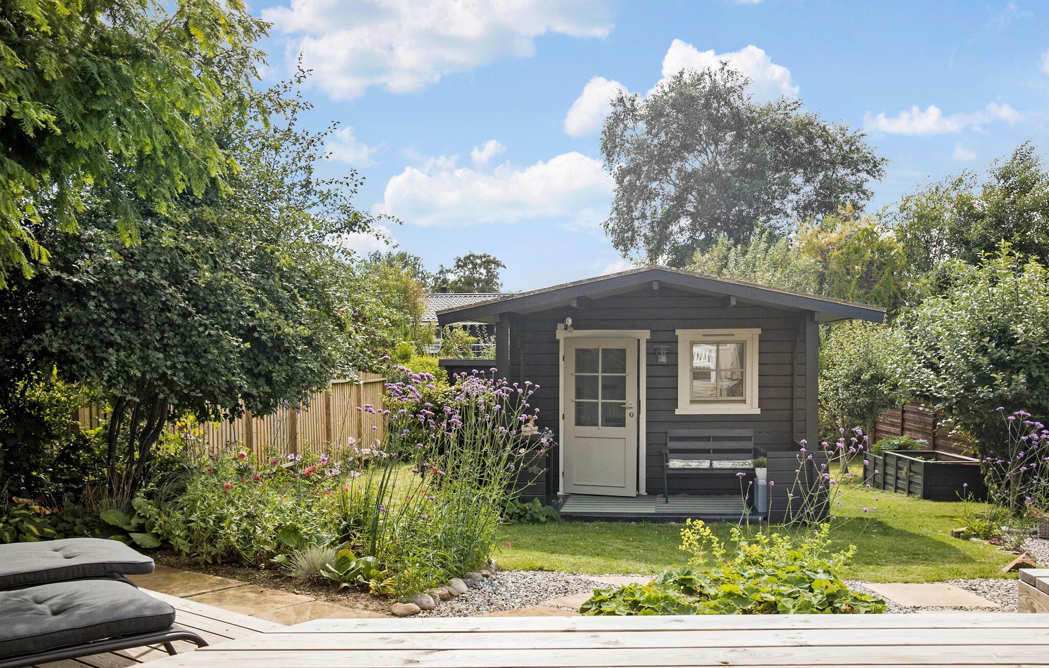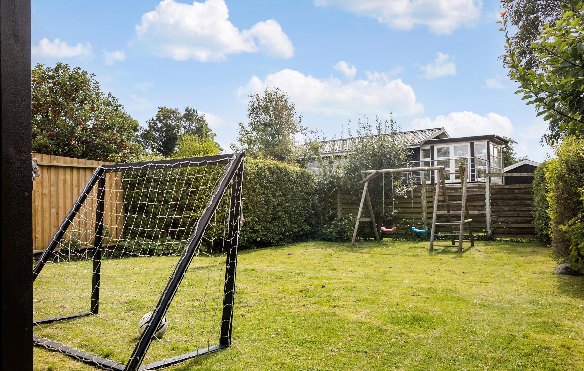 Omkring huset er der flere møblerede opholdsarealer, så der altid er mulighed for læ. I forlængelse af havestuen går man direkte ud på de sydvendte træterrasser og udeområder med sandsten. I den private og velholdte have er der alle muligheder for afslapning med græs mellem tæerne. Spil en omgang fodbold med familien på græsplænen, som er udstyret med fodboldmål. Imens kan børnene hygge sig med gyngerne i haven eller grille skumfiduser over bålet. Huset har udendørsbruser med koldt og varmt vand, ligesom der er et udekøkken, hvor jordbærrene kan klargøres.