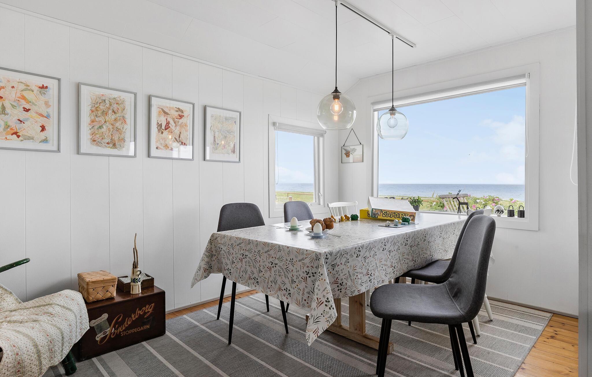 Dette fantastiske sommerhus byder på en betagende panoramaudsigt over havet. Både foran huset, ved spisebordet, fra sofaen og når I laver mad, kan I se ned til vandet. Her bor I lige ud til stranden og kan til enhver tid nyde den blide lyd fra bølgerne. Begynd dagene på terressen med morgenkaffen i hånden og stå op i ro og mag til synet og lyden af den rene natur. Huset er lyst og hjemligt indrettet.